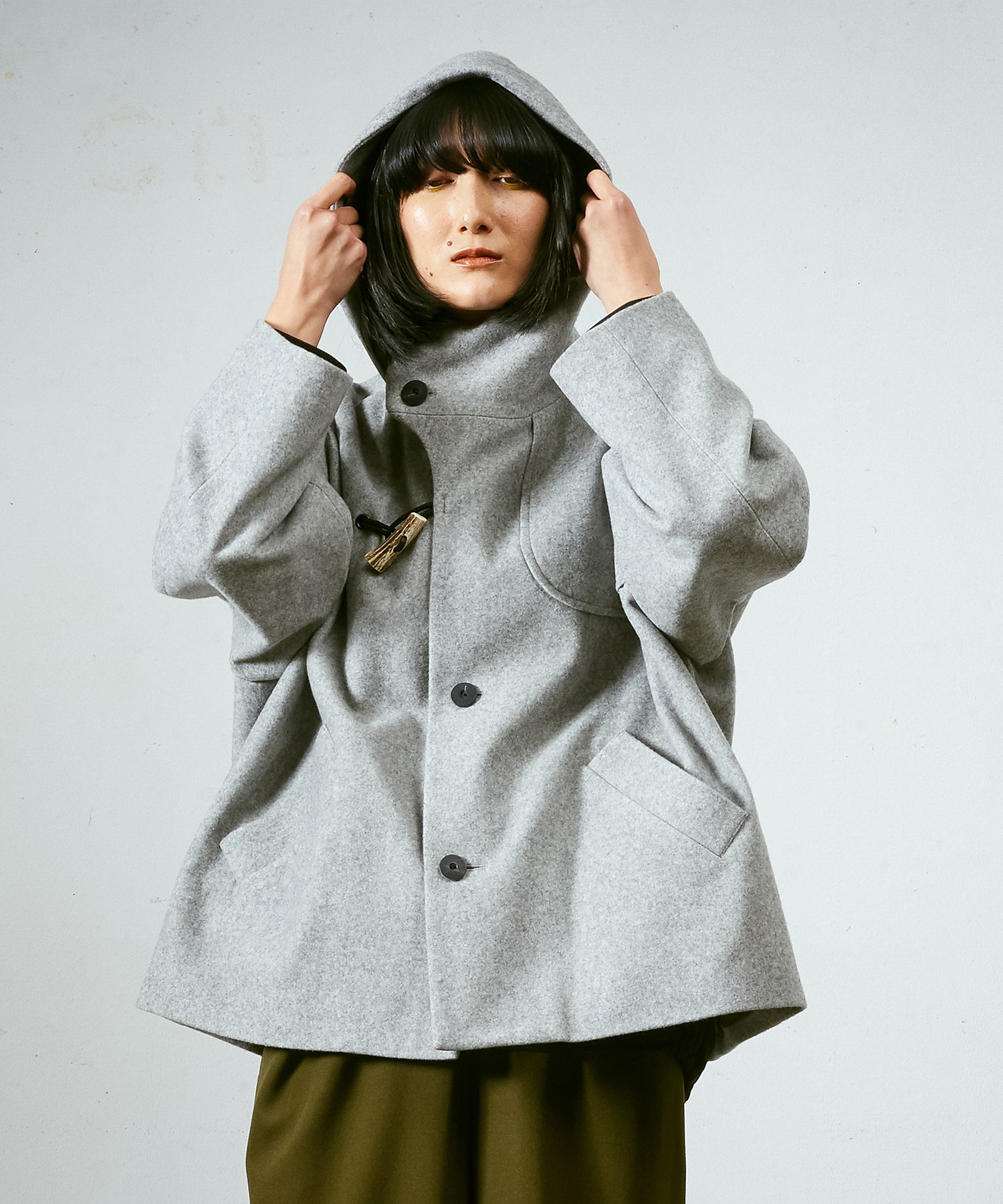 ゆったりとした落ち感のあるシルエットのフードダッフルコート。ブルゾン感覚で羽織れるショート丈。