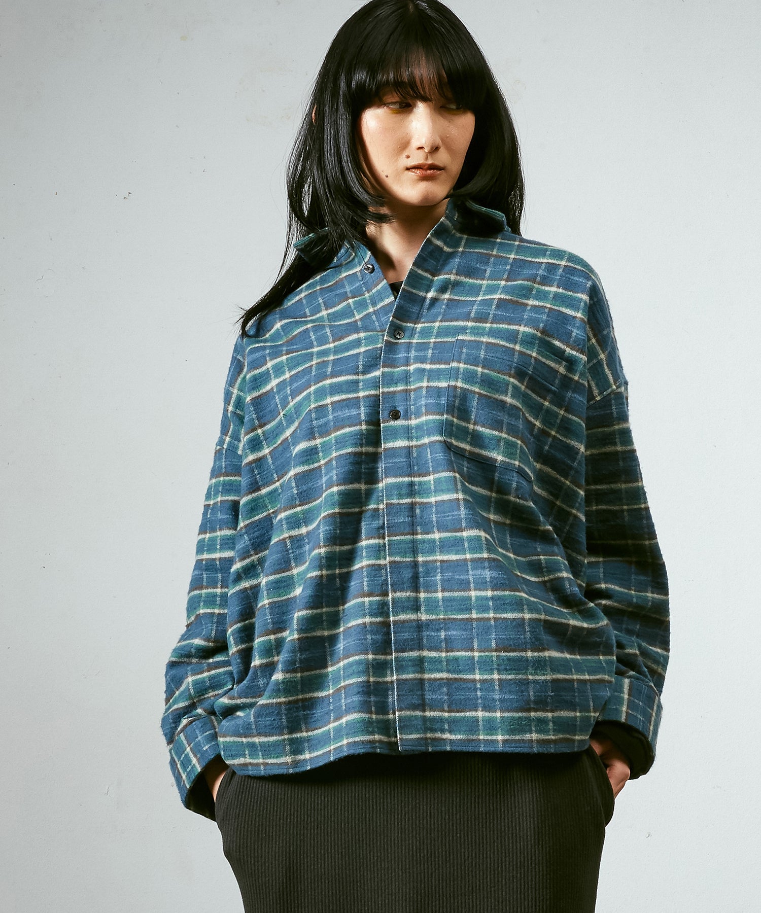 落ち着いた大人なカラーリングのチェック生地を使用、カジュアルにもキレイめなスタイルにもあわせやすいアイテム。