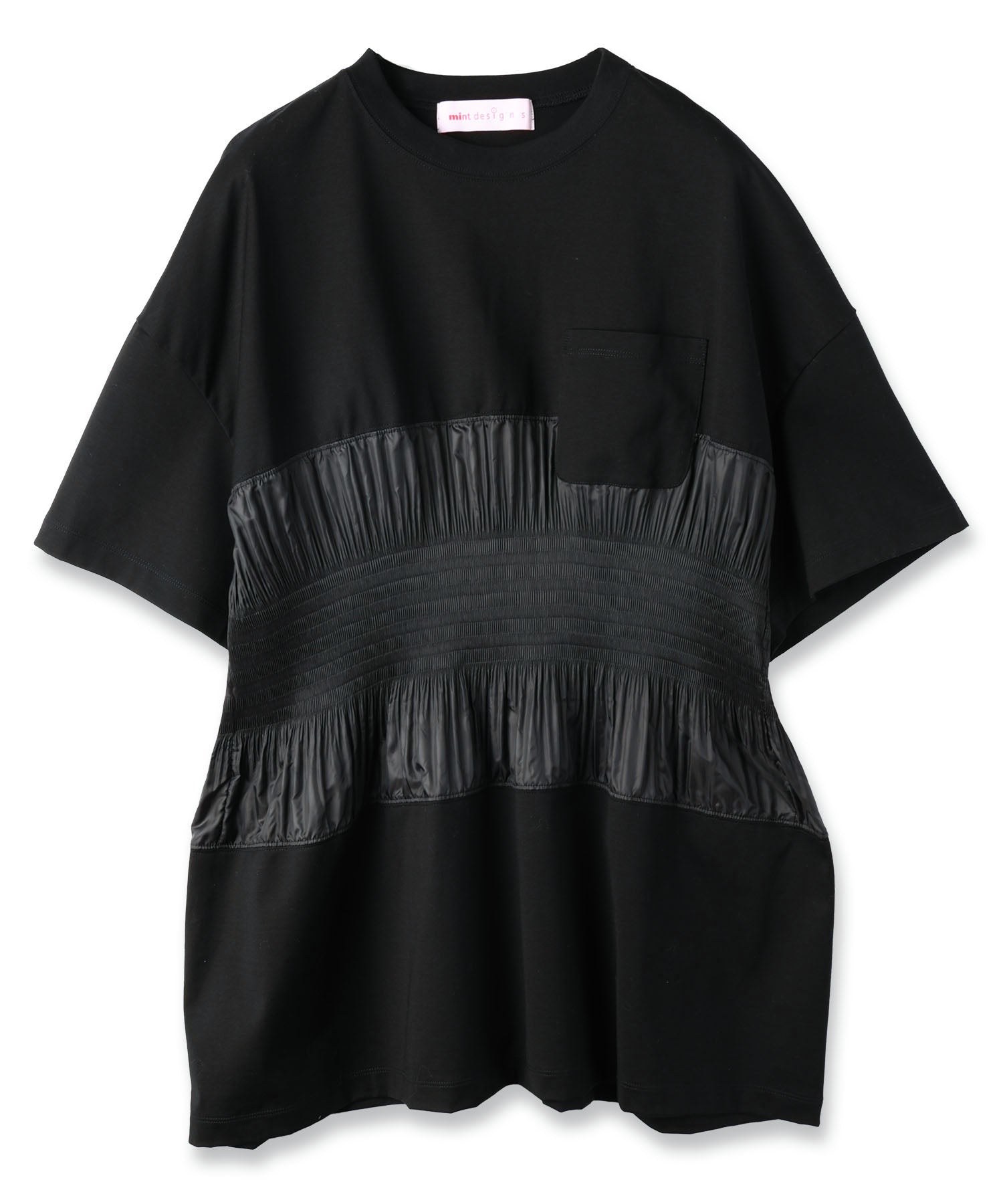 ポケットTシャツを切り開いてウエスト部分にプリーツ加工を施した異素材を合わせました。