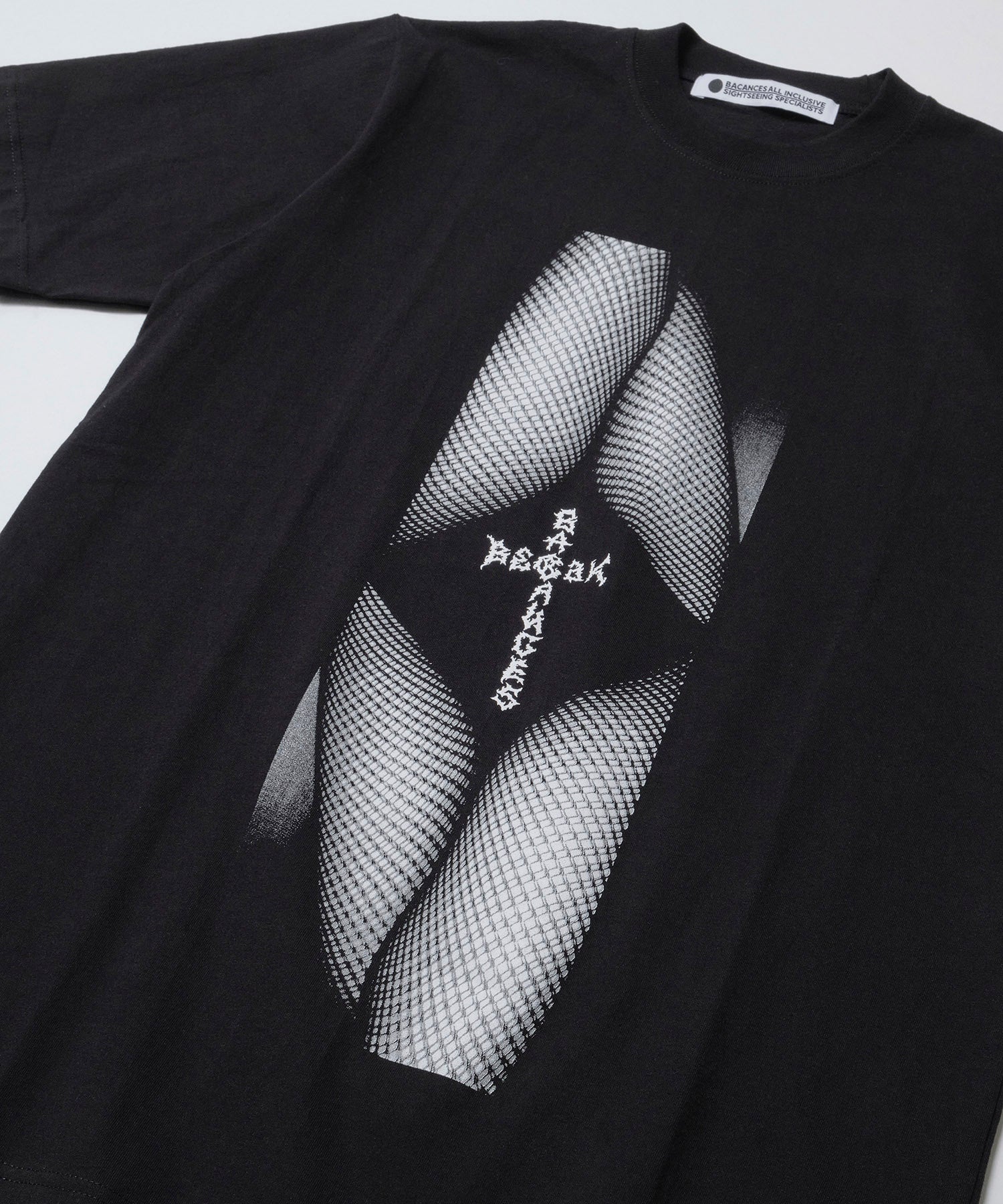 2つのブランドネームを十字架に見立て、幾何学模様で総柄プリントを描きました。