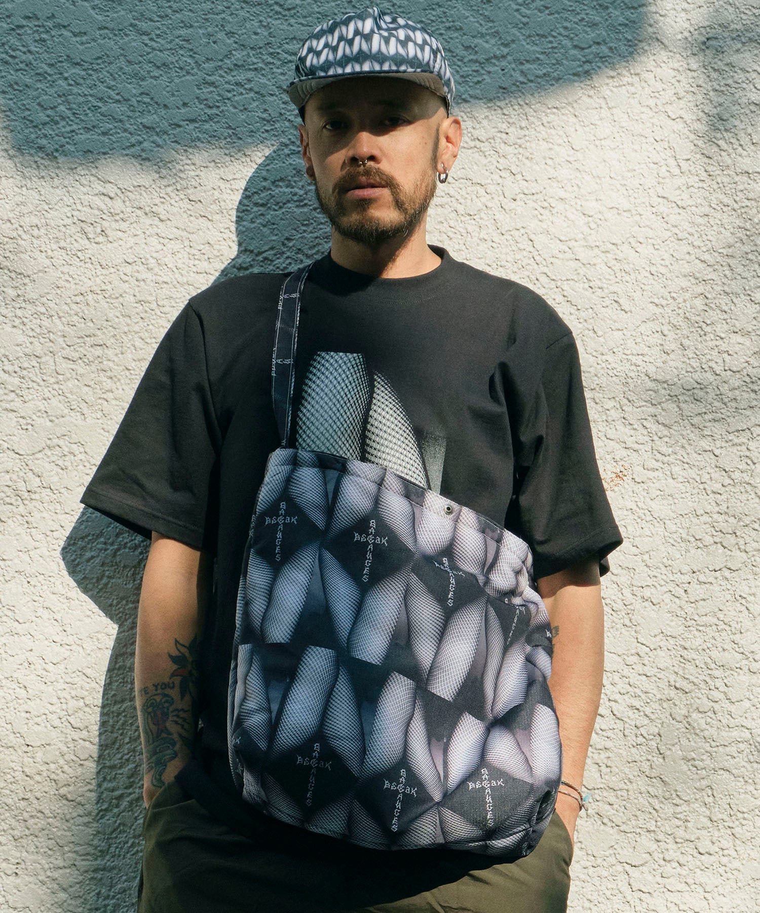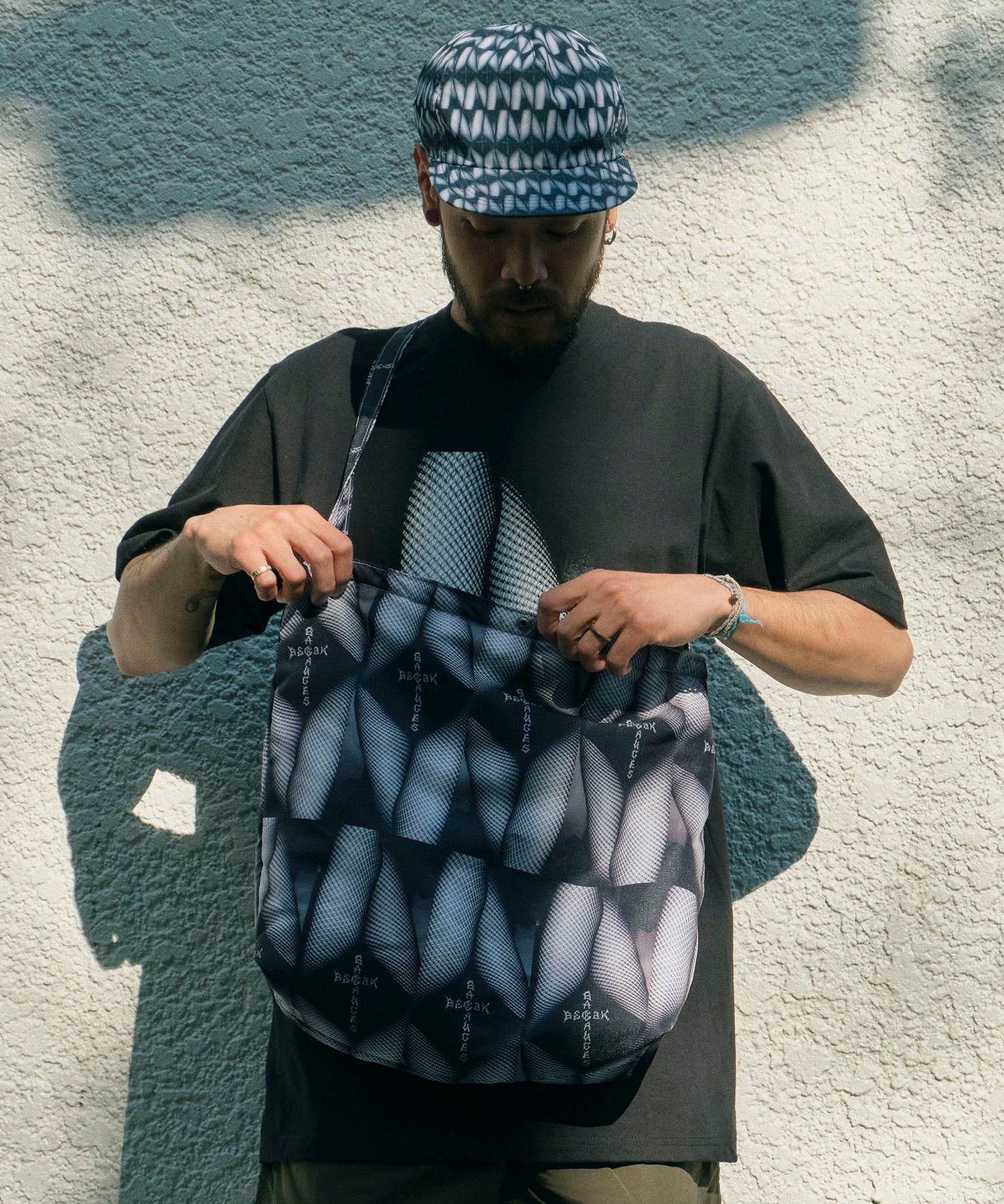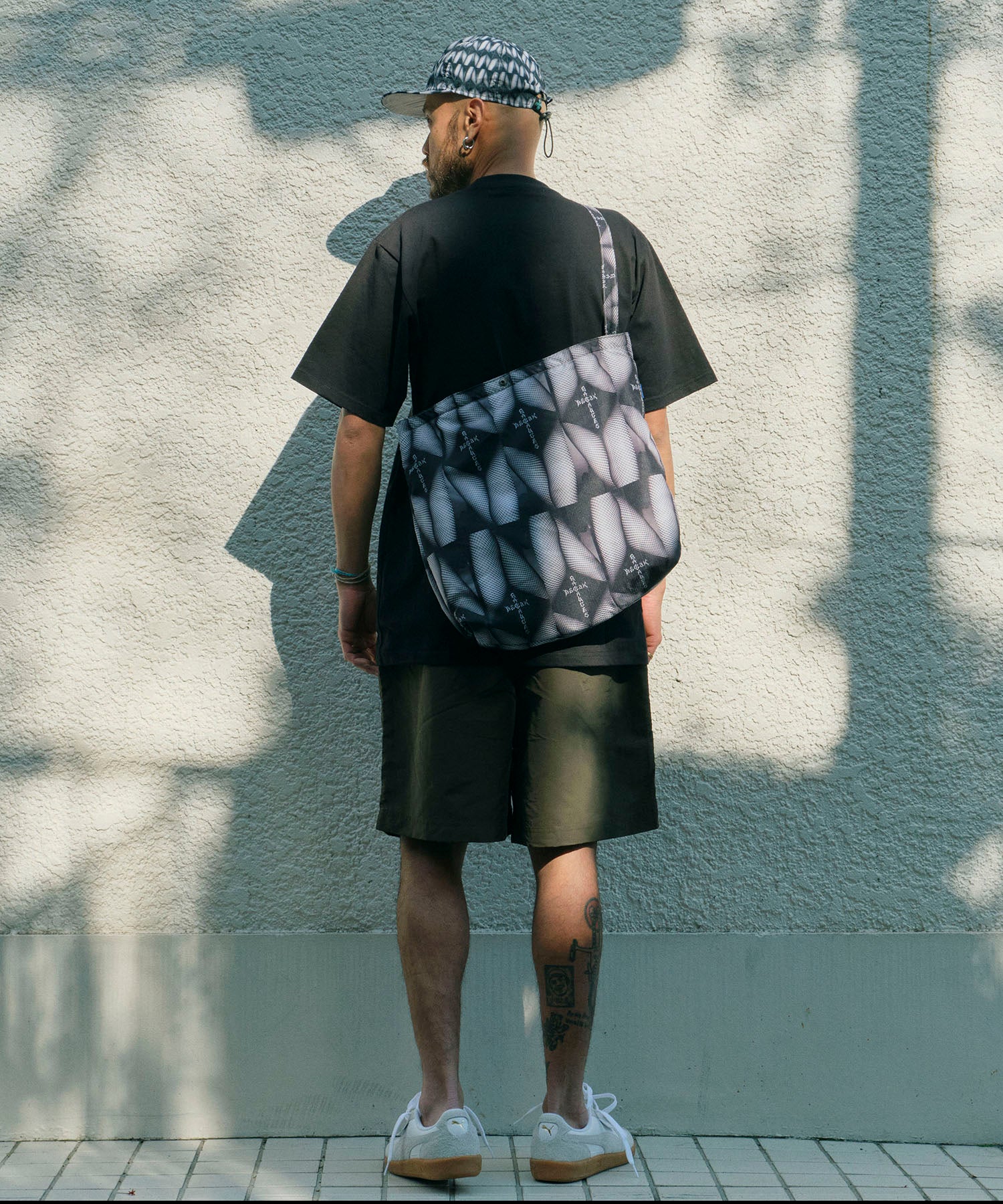 2つのブランドネームを十字架に見立て、幾何学模様で総柄プリントを描きました。