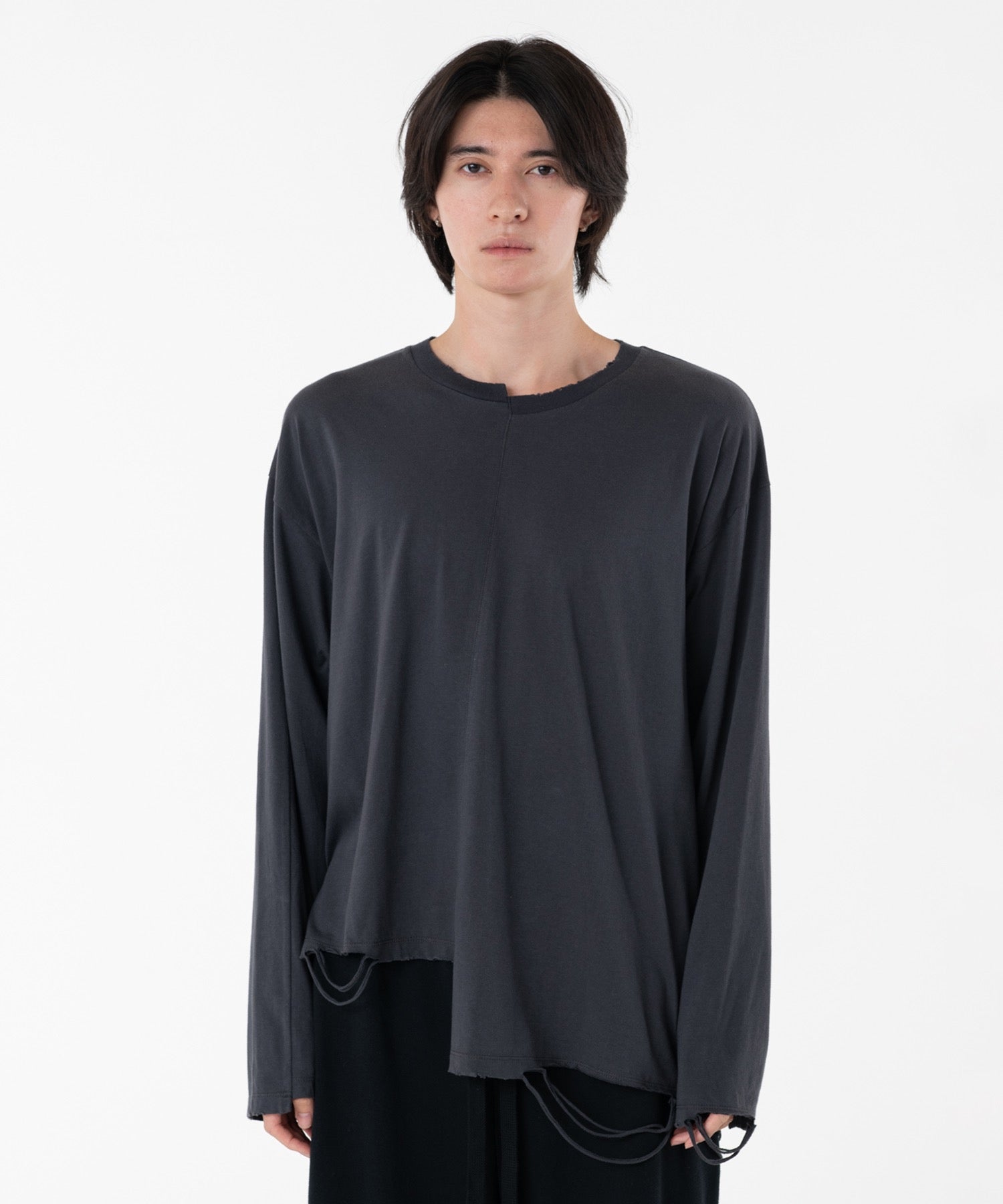 アシンメトリーなフォルム、ハードなダメージ加工を施し、着古したような雰囲気を閉じ込めています。
