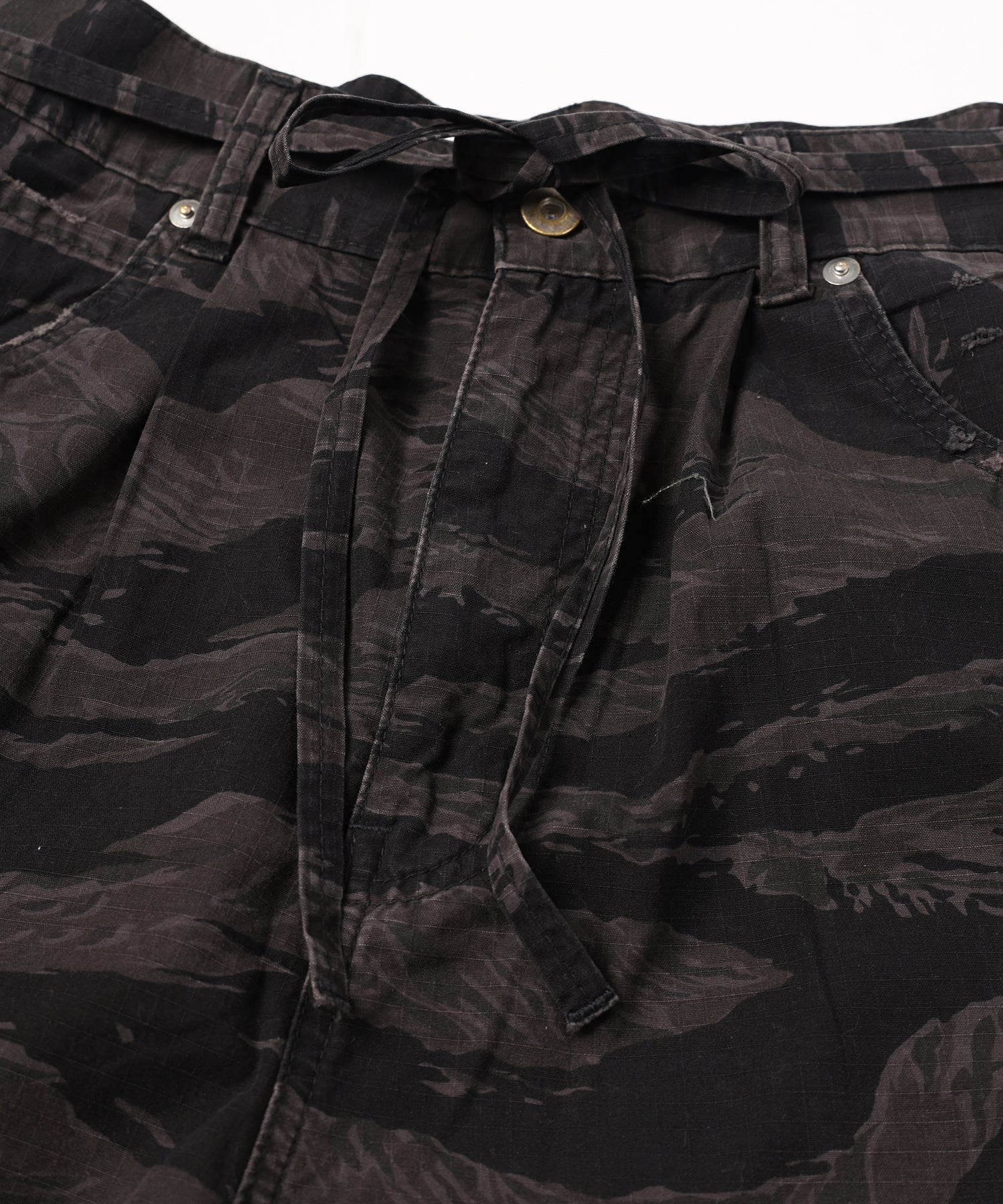 12ozの縦糸×ムラ糸デニムと、リップ素材の迷彩生地を切り替えた存在感抜群のバギーパンツ。