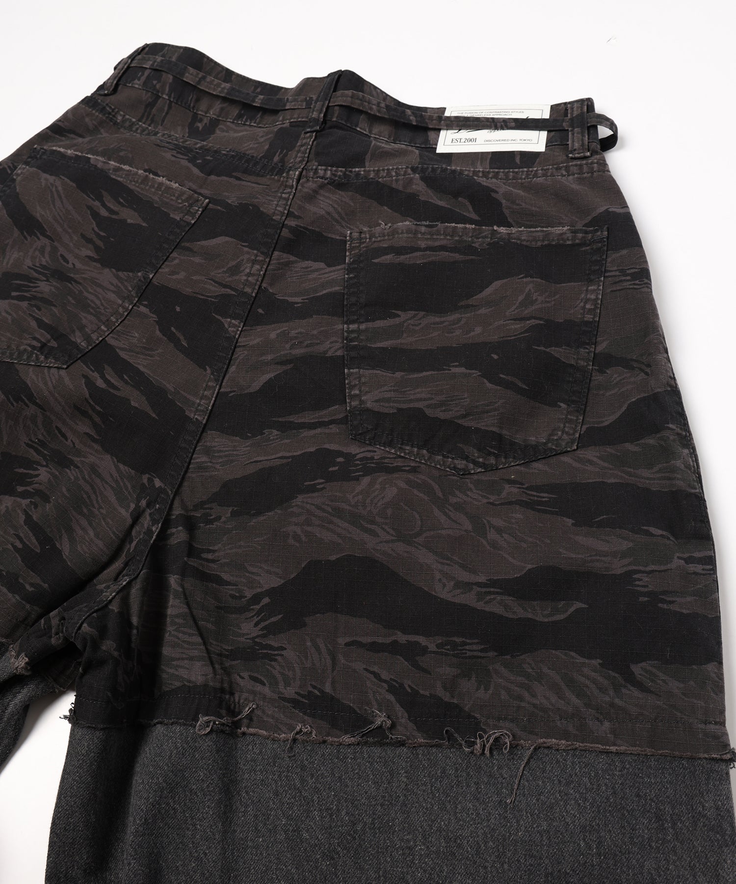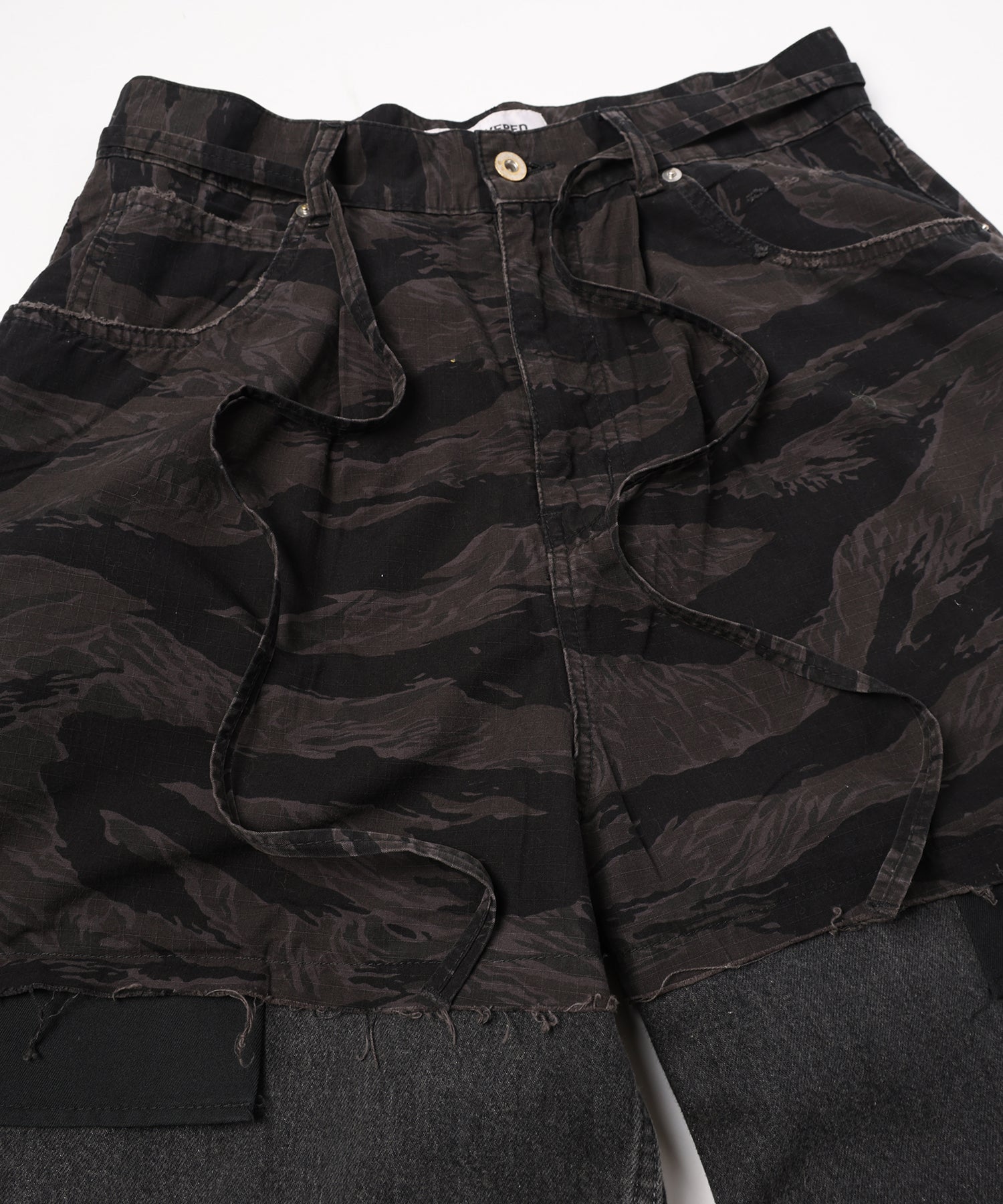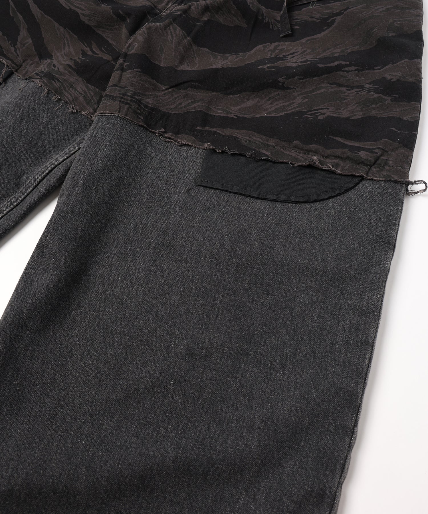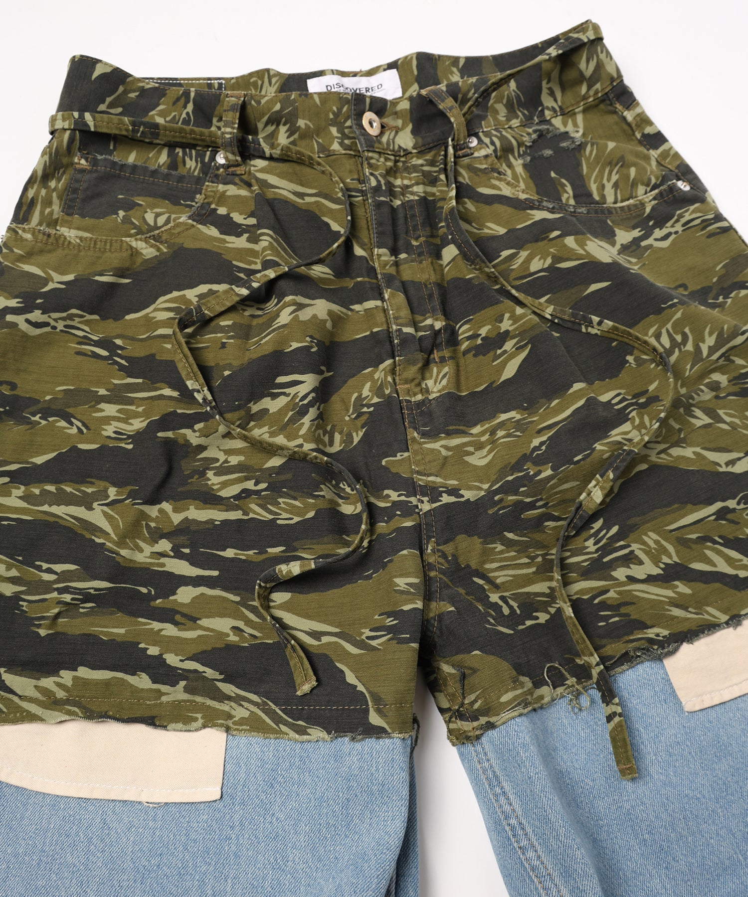 上部にはカモフラージュ柄、株はダメージデニムを用いてレイヤードデザインを施しました。