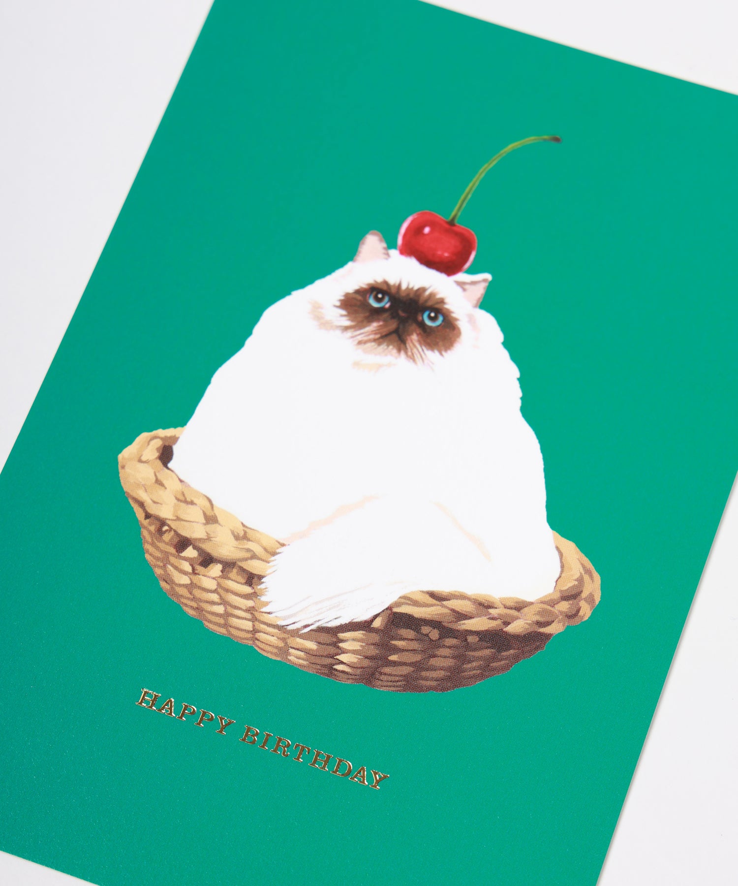 カゴに入ったふわふわな猫は、クリームたっぷりなタルトケーキのよう。金箔で「HAPPY BIRTHDAY」のメッセージが入っています。