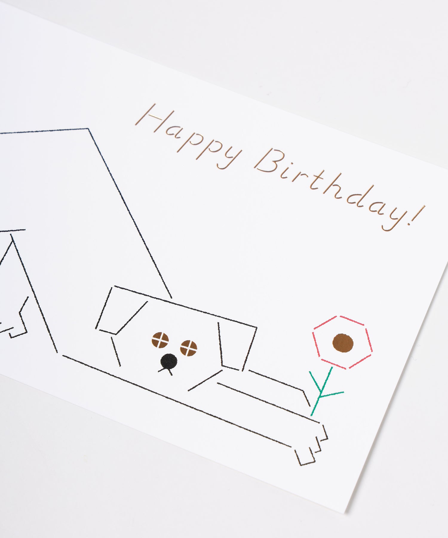 かわいらしいイヌがお花を差し出しているバースデーカードです。イヌの目とお花、「Happy Birthday!」という文字に金箔を使用しています。