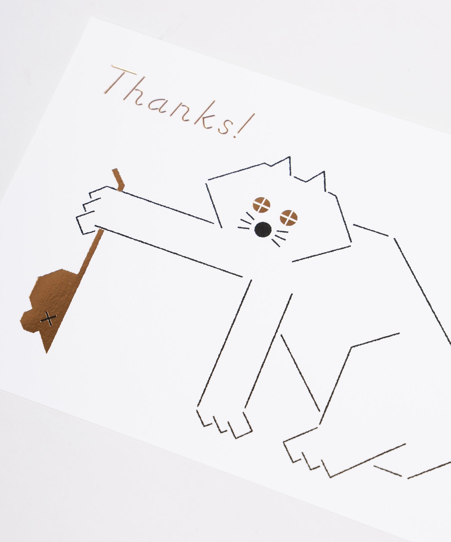 ネコがネズミを差し出しているユーモア溢れるポストカード。ネズミとネコの目、「Thanks!」という文字に金箔を使用しています。-