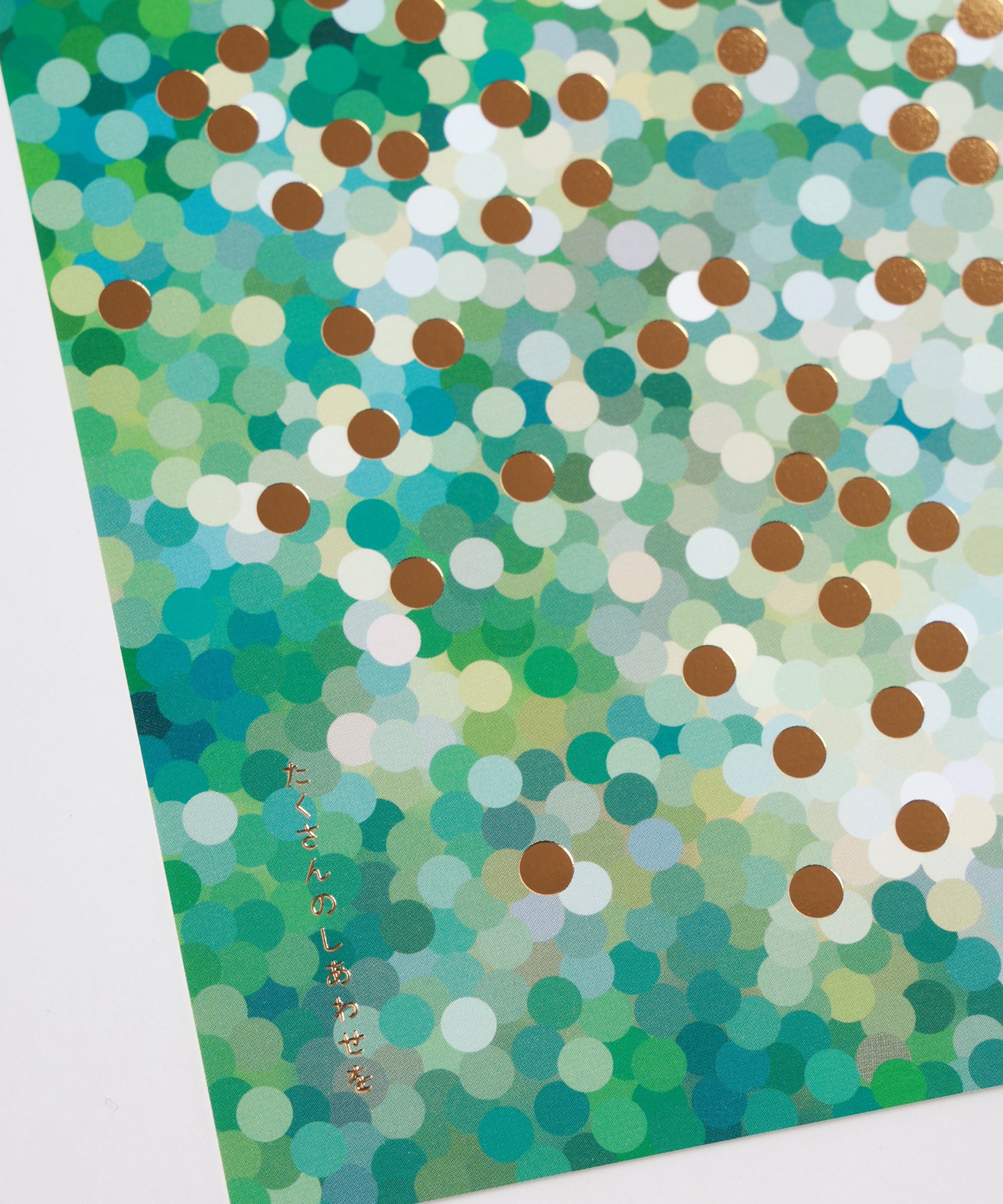 ドットで表現された光の粒には金の箔もあしらわれキラキラとした印象です。左下には「たくさんのしあわせを」とさりげなく言葉が入っています。-