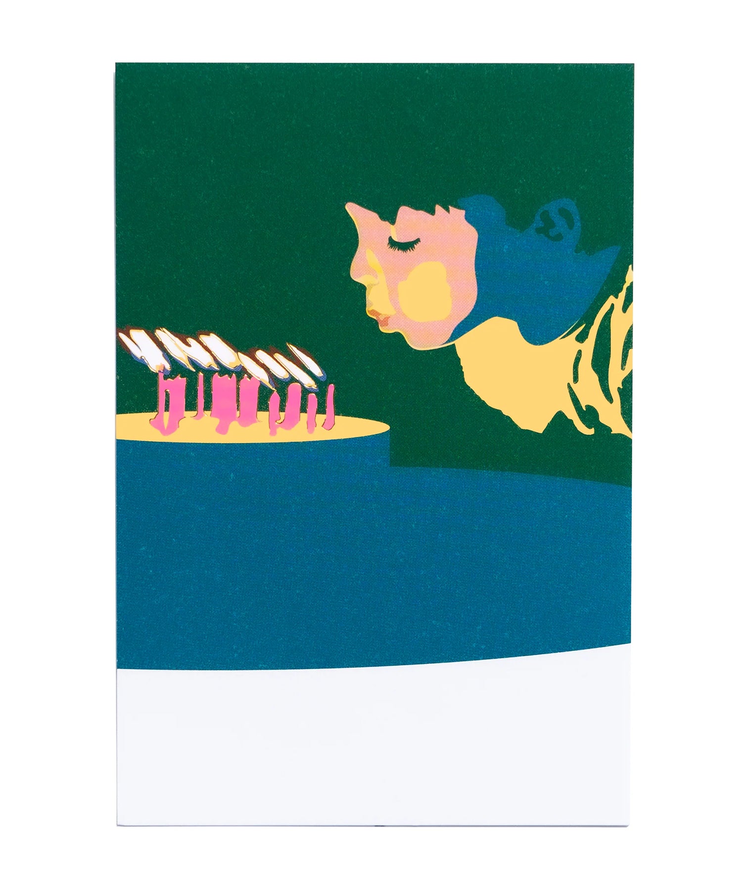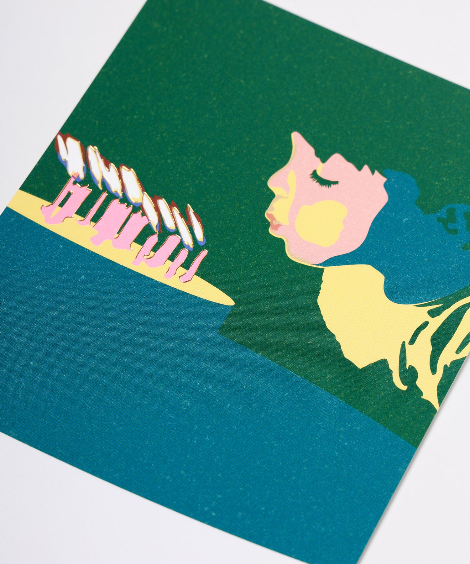 女の子がロウソクをふぅーと吹いているイラストです。ロウソクのまわりに繊細に金箔をあしらいました。※増産に伴い一部デザインをリニューアルいたしました。