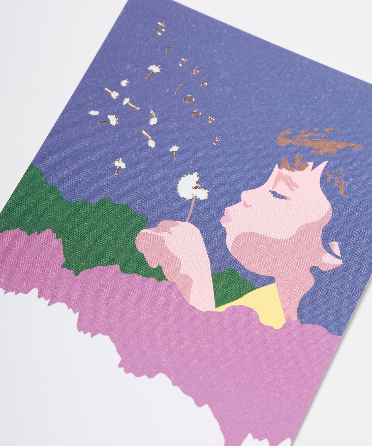 少女がたんぽぽの綿毛をフーッと吹いているイラストです。たんぽぽの綿毛のまわりに繊細に金箔をあしらっています。