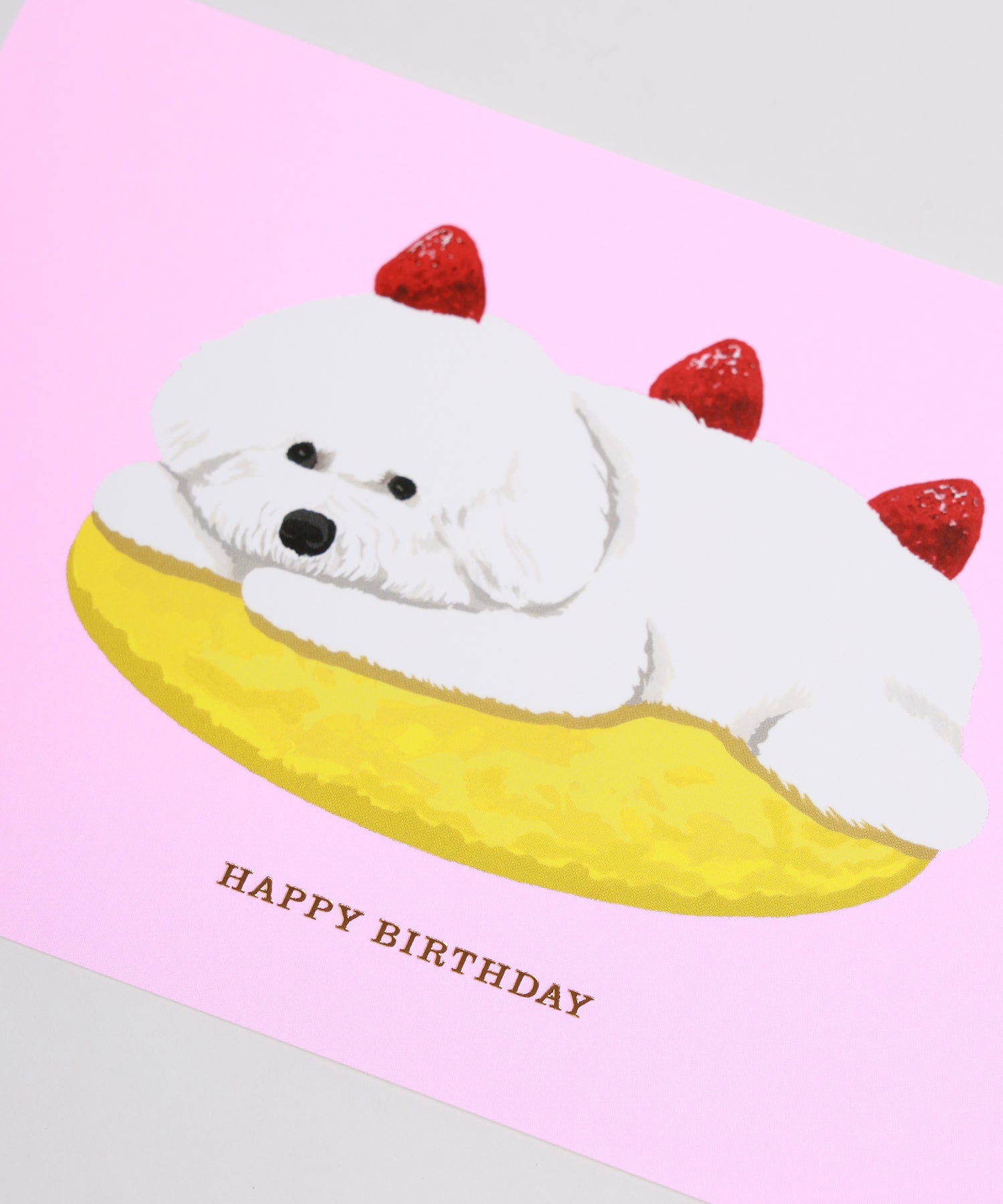 ラグの上でくつろぐ犬は、ふわふわなショートケーキのよう。金箔で「HAPPY BIRTHDAY」の文字が入っています。