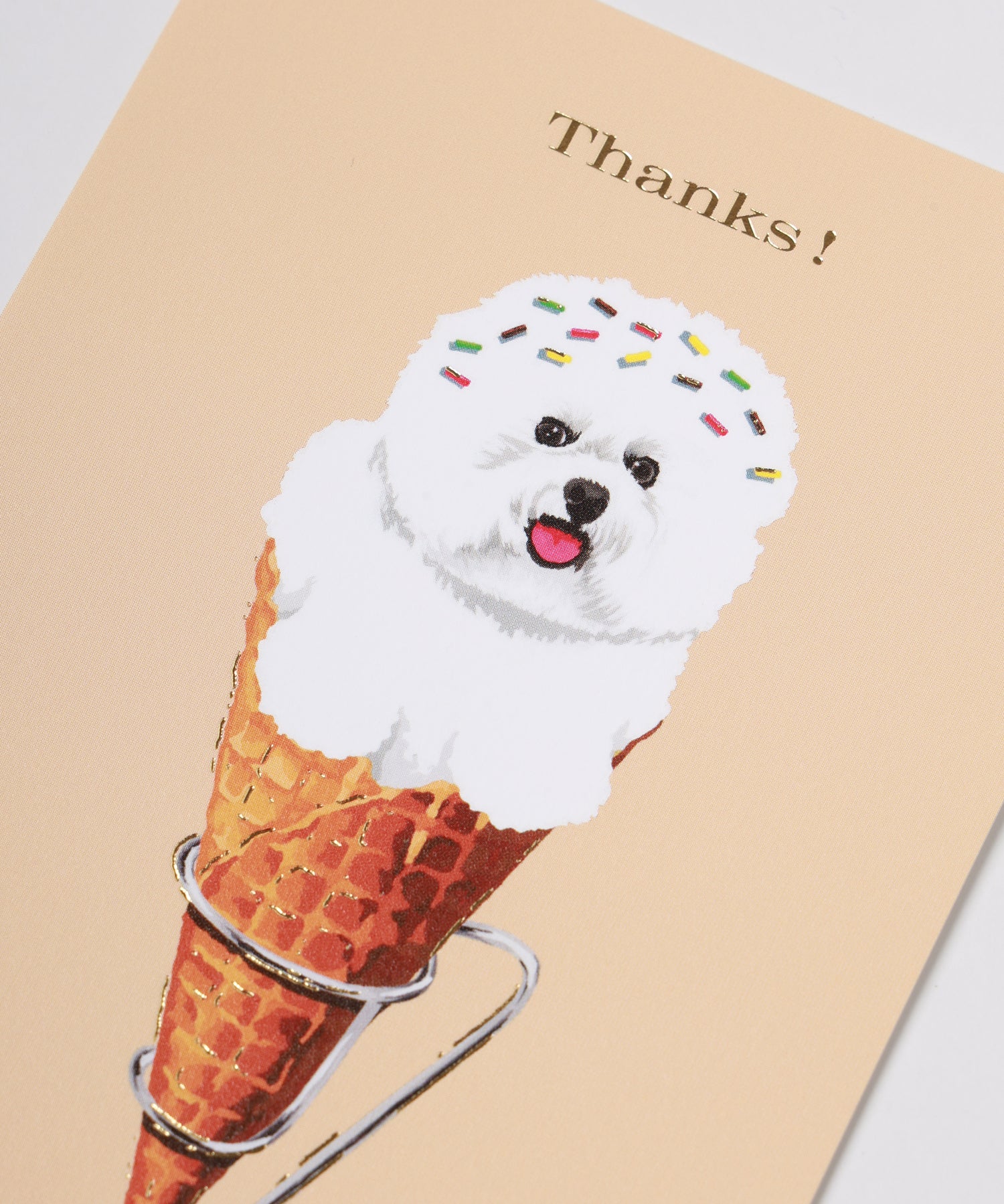 ワッフルコーンに乗った犬がバニラアイスクリームのようなかわいいデザインです。金箔で「Thanks!」の文字が入っています。