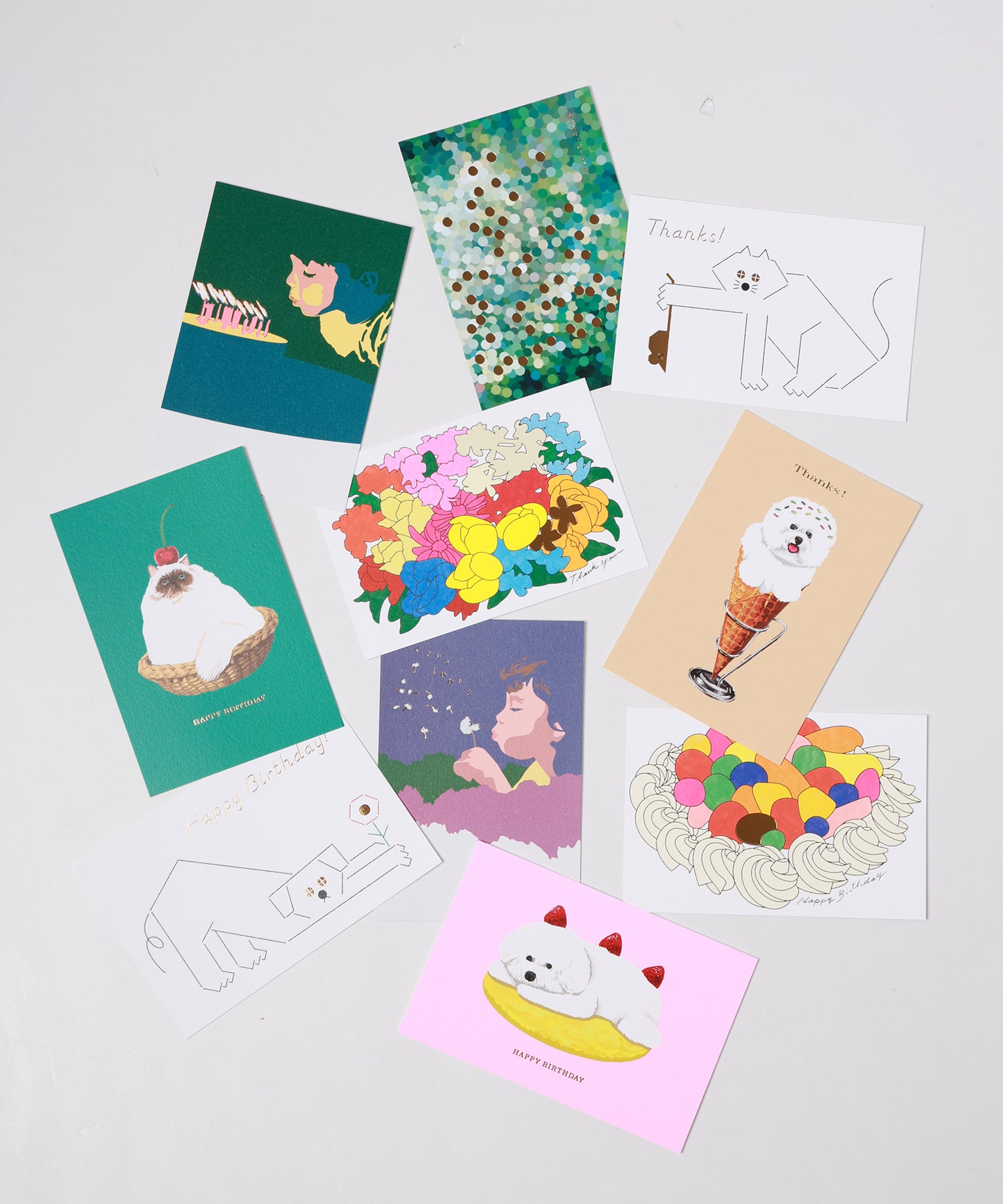 Thank you、Happy Birthday、多⽬的の3つのテーマでデザインしたポストカード。