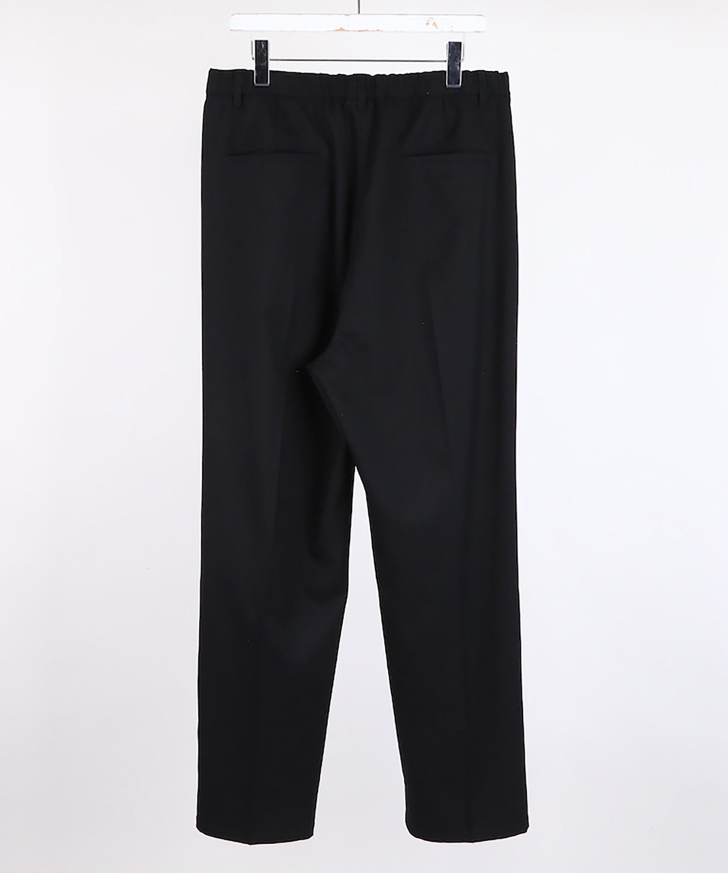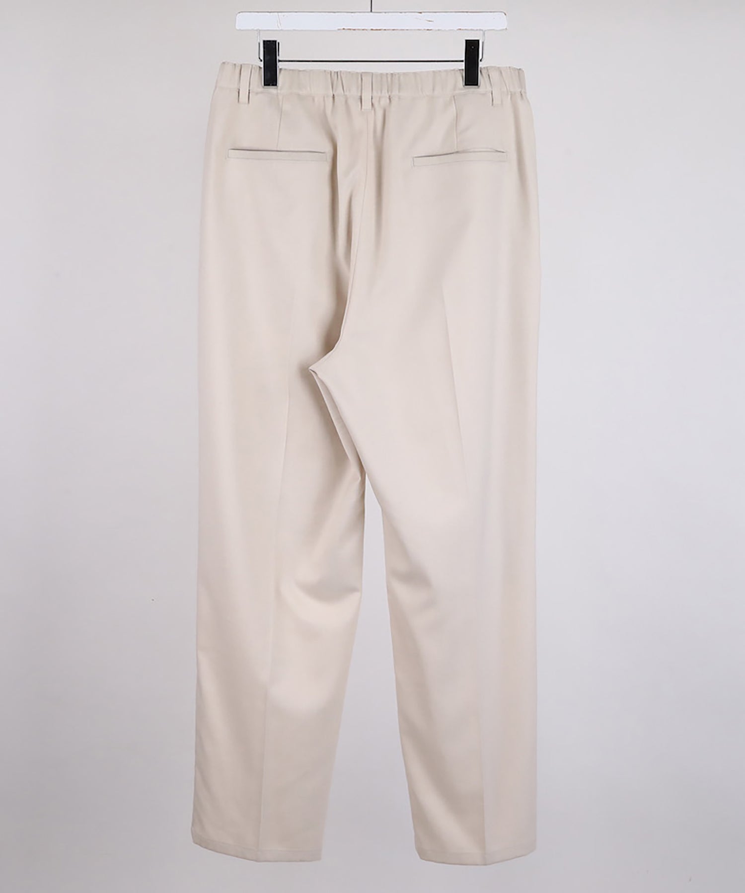 程よいハリとドレープ性、上品な光沢感を兼ね備えた高密度でしなやかなギャバジン素材を使用したスラックス。