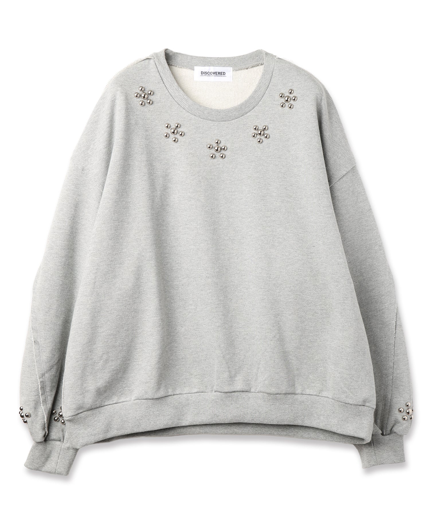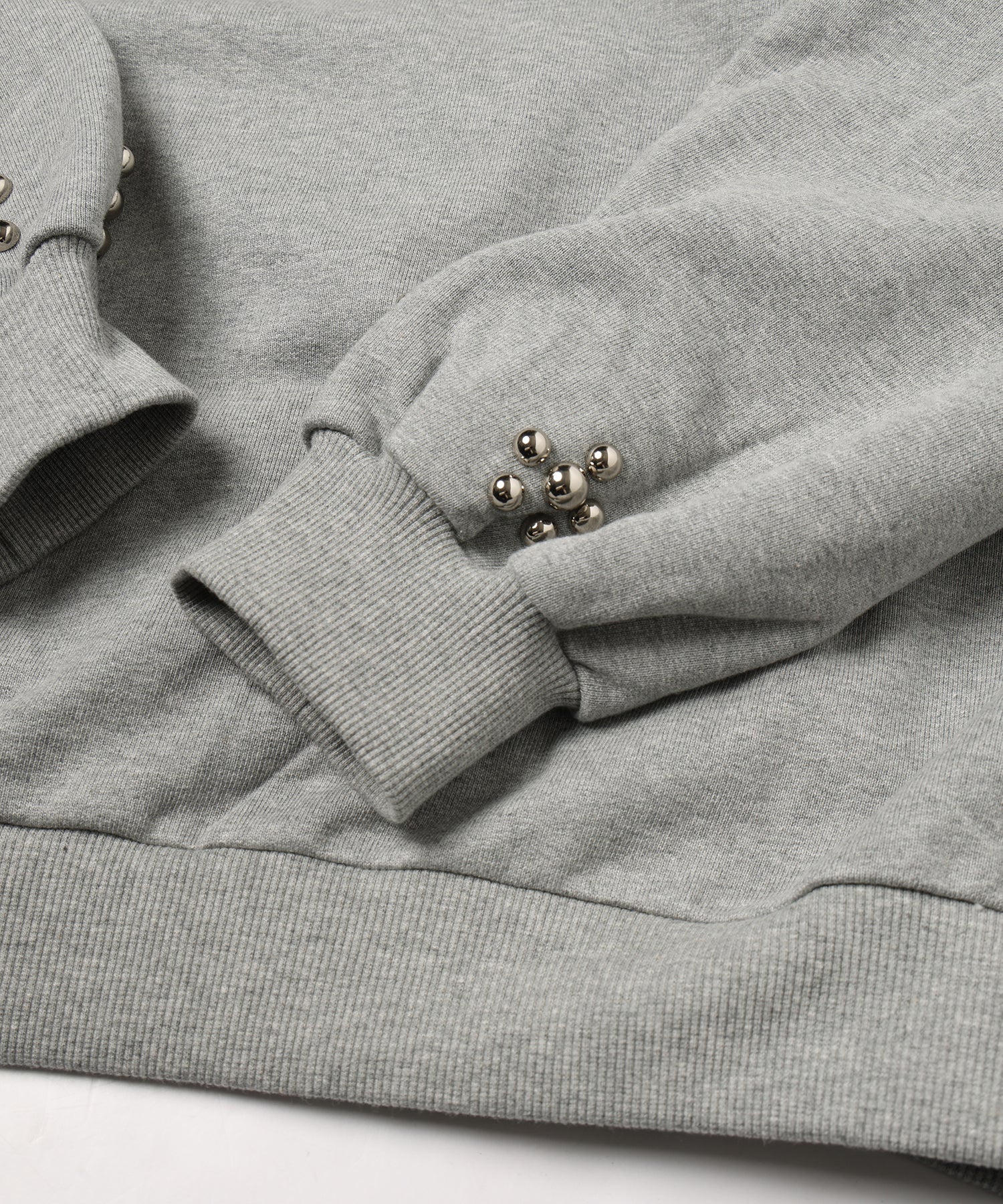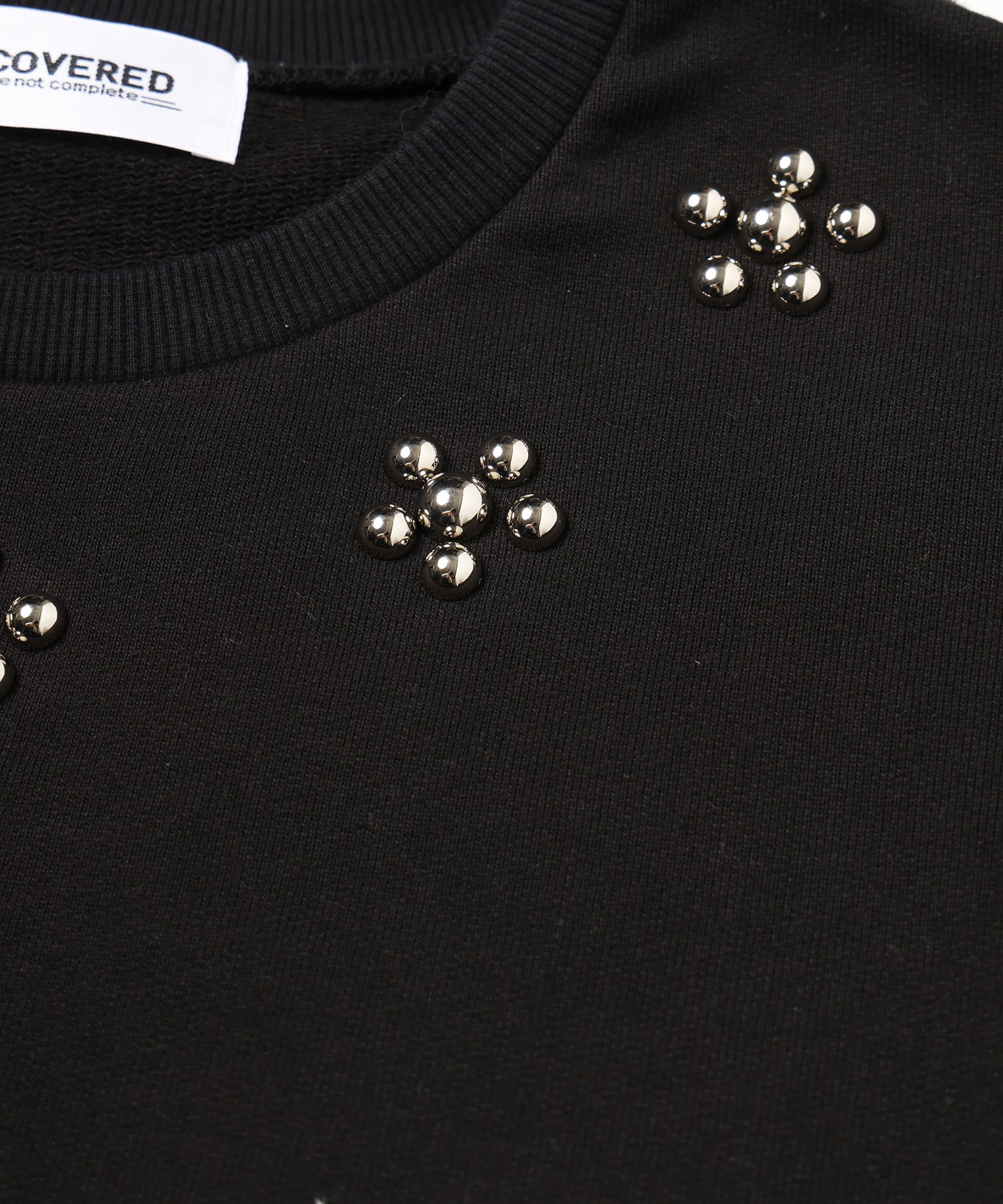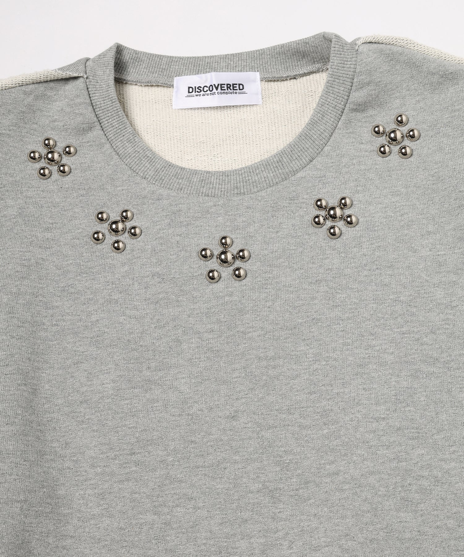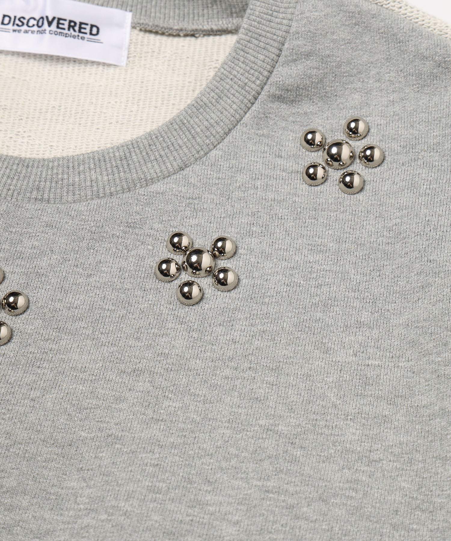 襟ぐりには煌びやかなスタッズで装飾したフラワーモチーフが、カジュアルな雰囲気の中にエレガントさをプラスしています。