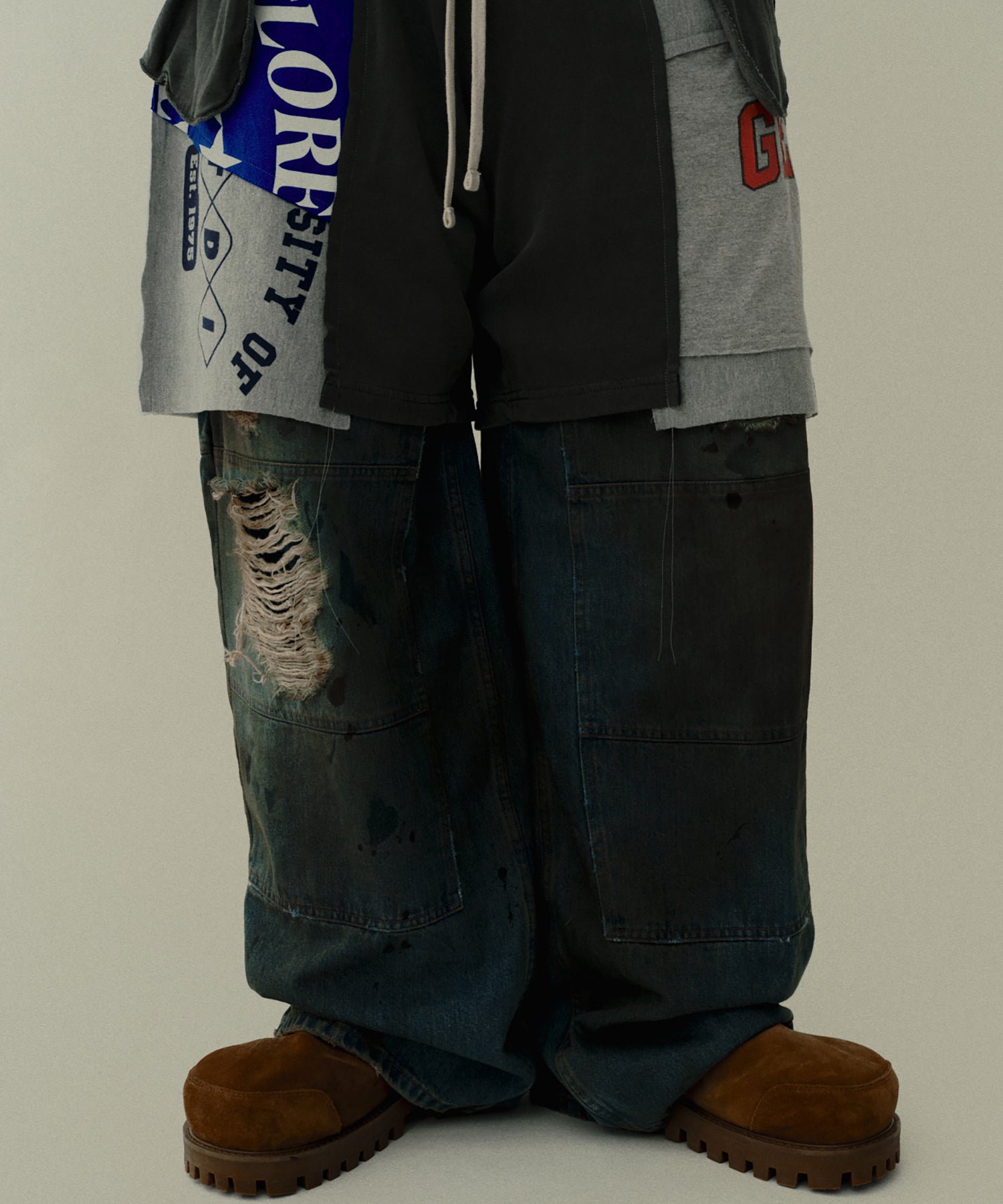 擦り、⽳あけ、オーバーダイ、油汚れなどワーク&ビンテージ感漂う、ハードな加工をを施し個性を高めました。