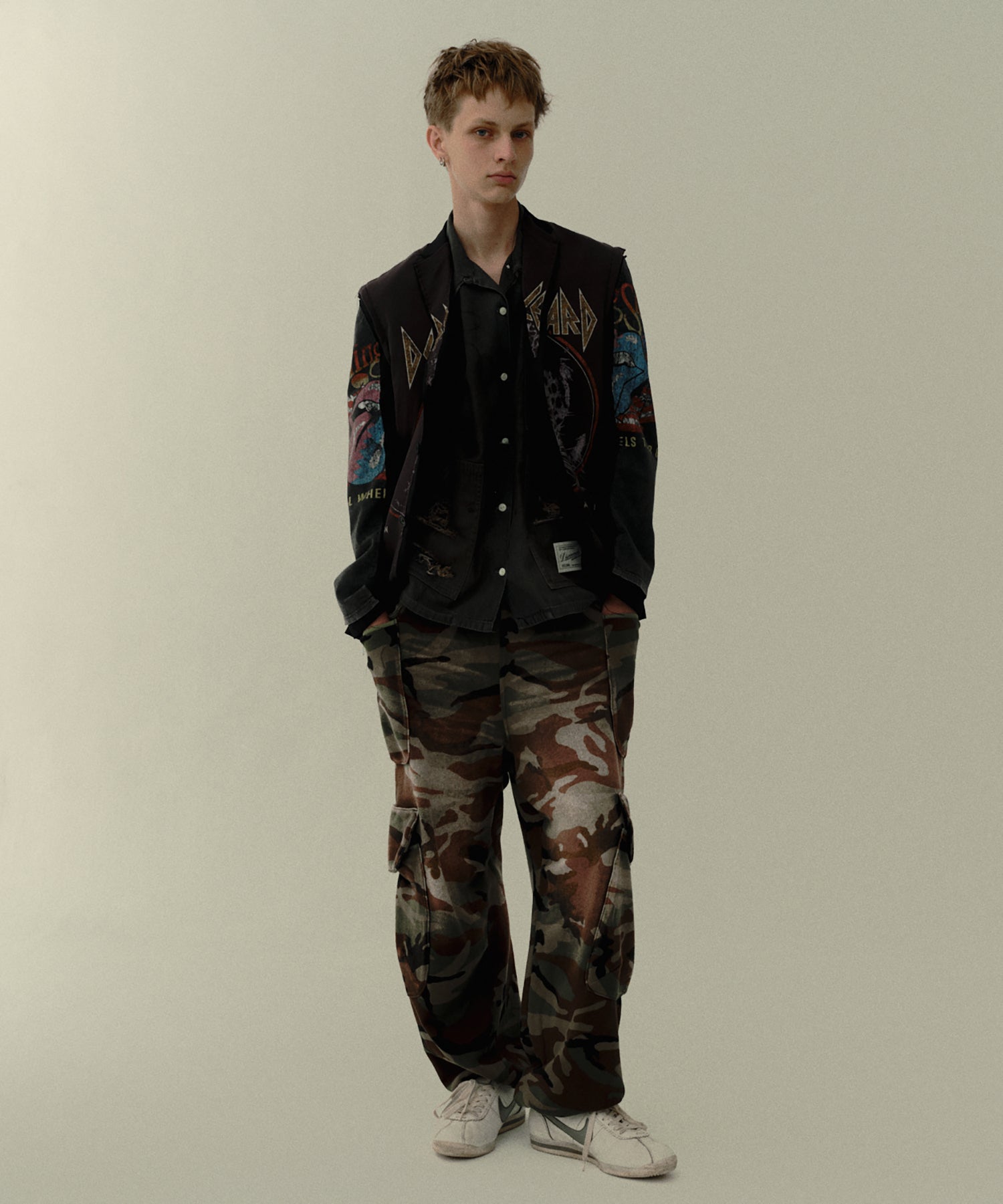 ハードな汚しやひげの表情、アタリなど、ヴィンテージ感にこだわった手作業によるオリジナル加工が特徴的。