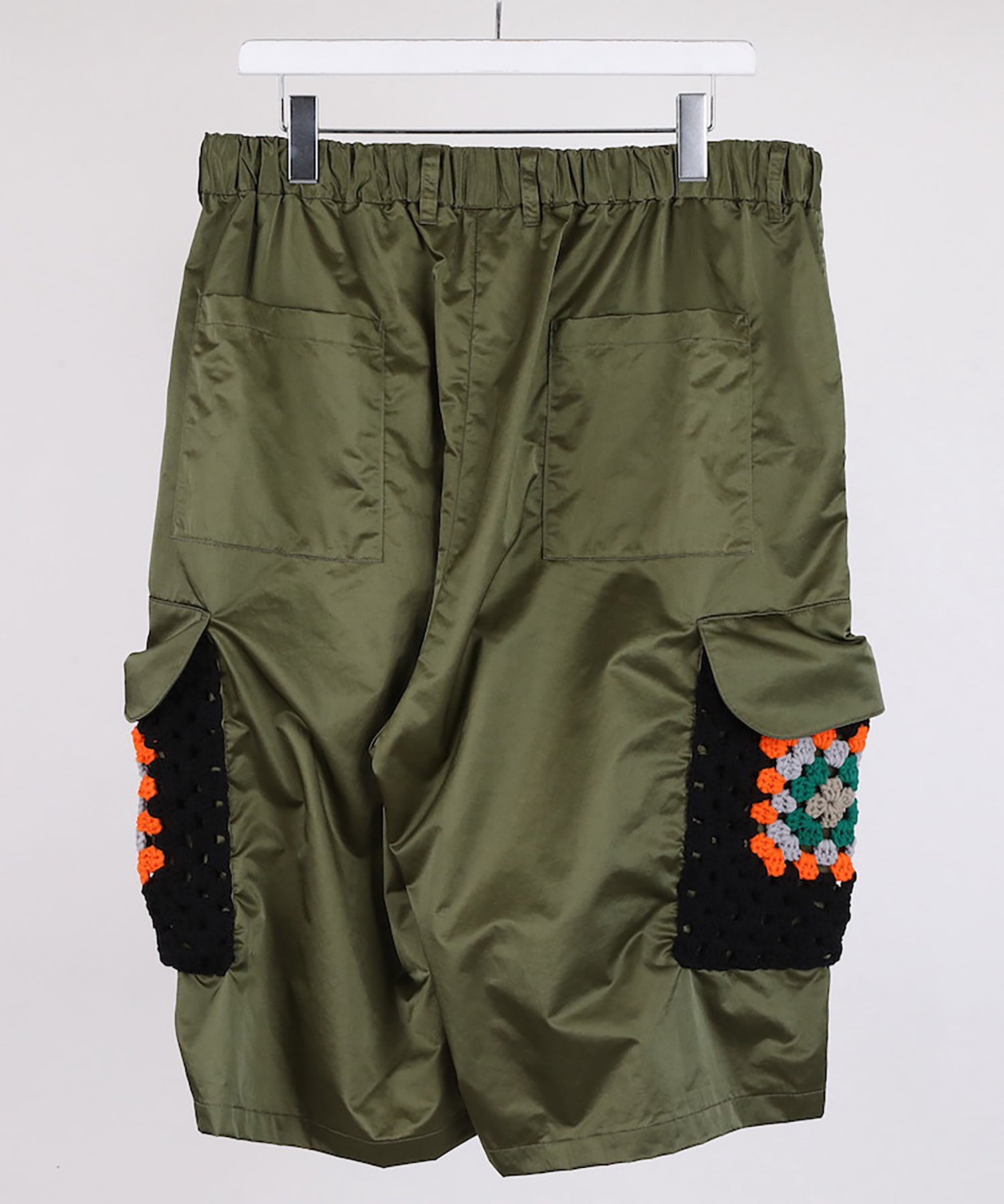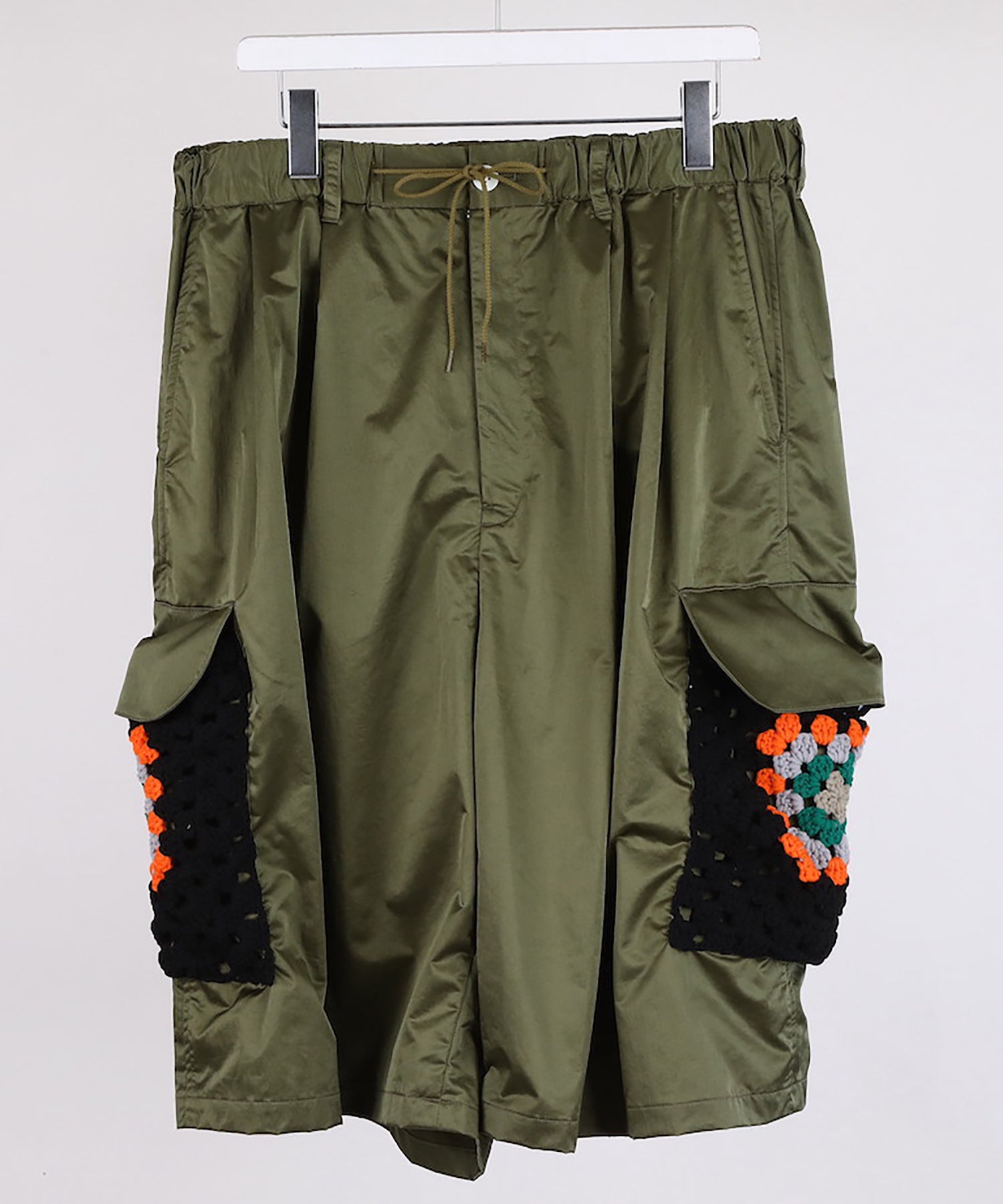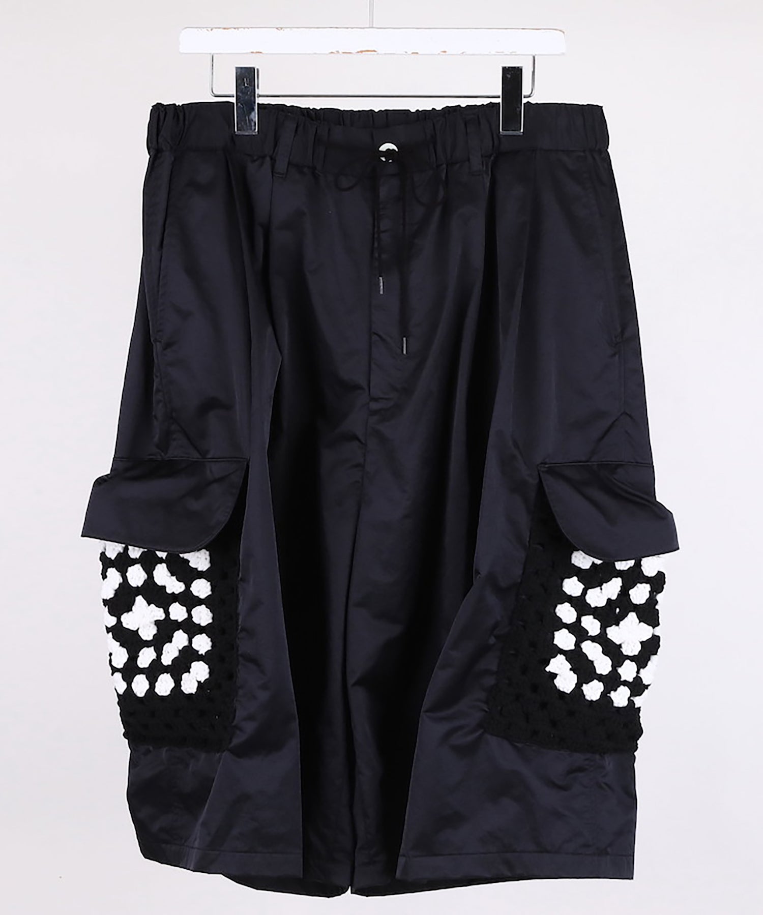カーゴポケット部分には手編みによるかぎ針編みのニット切り替えデザインが目を引きつけます。
