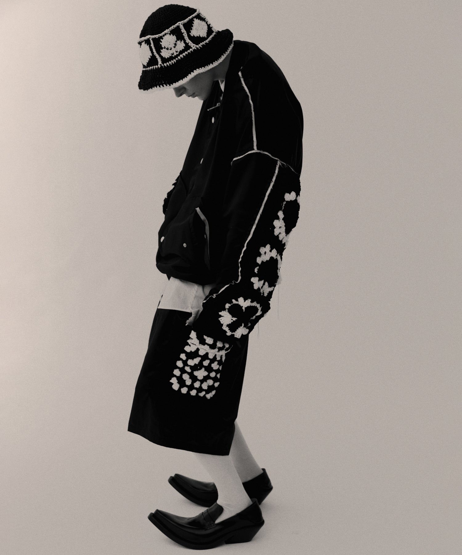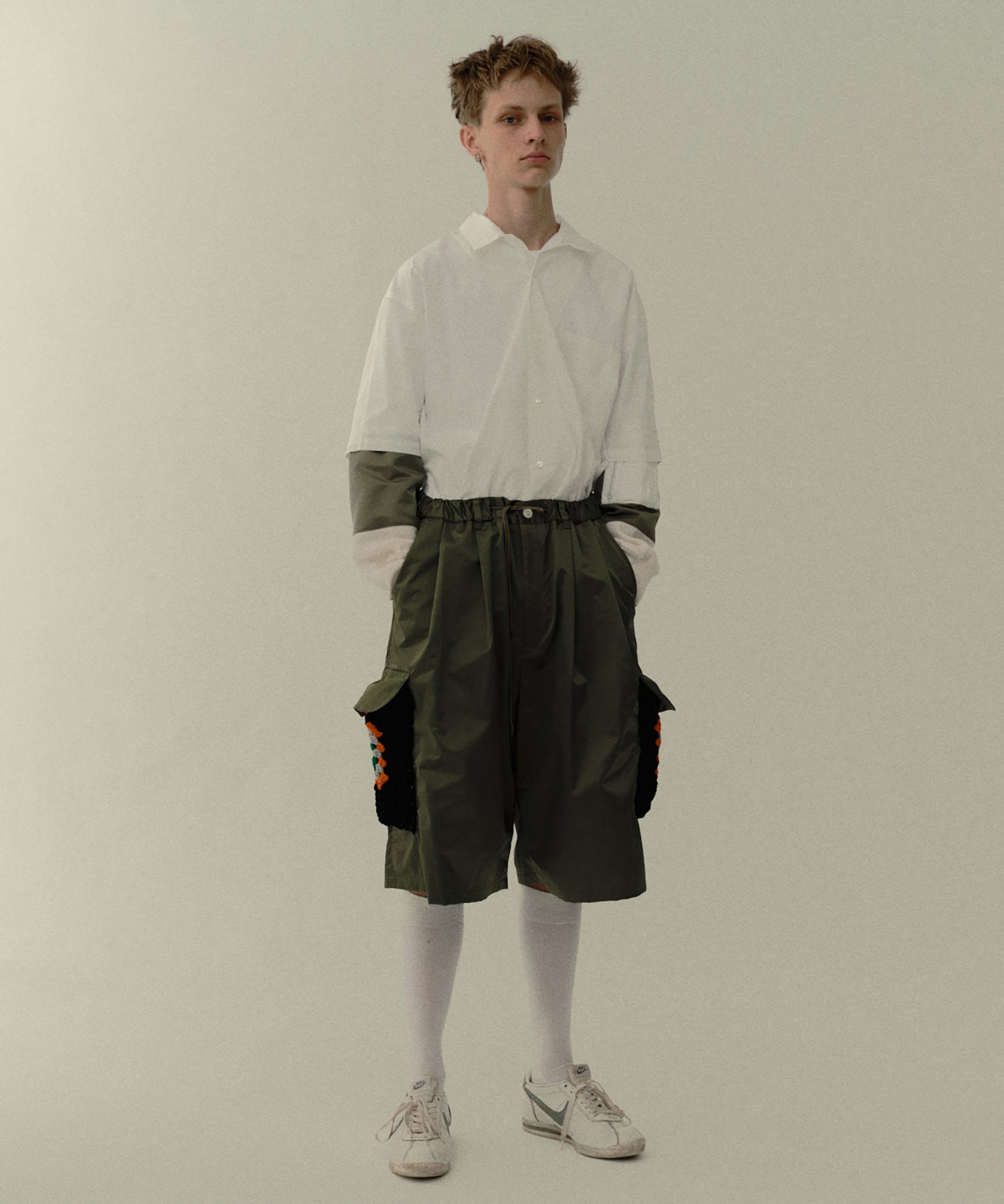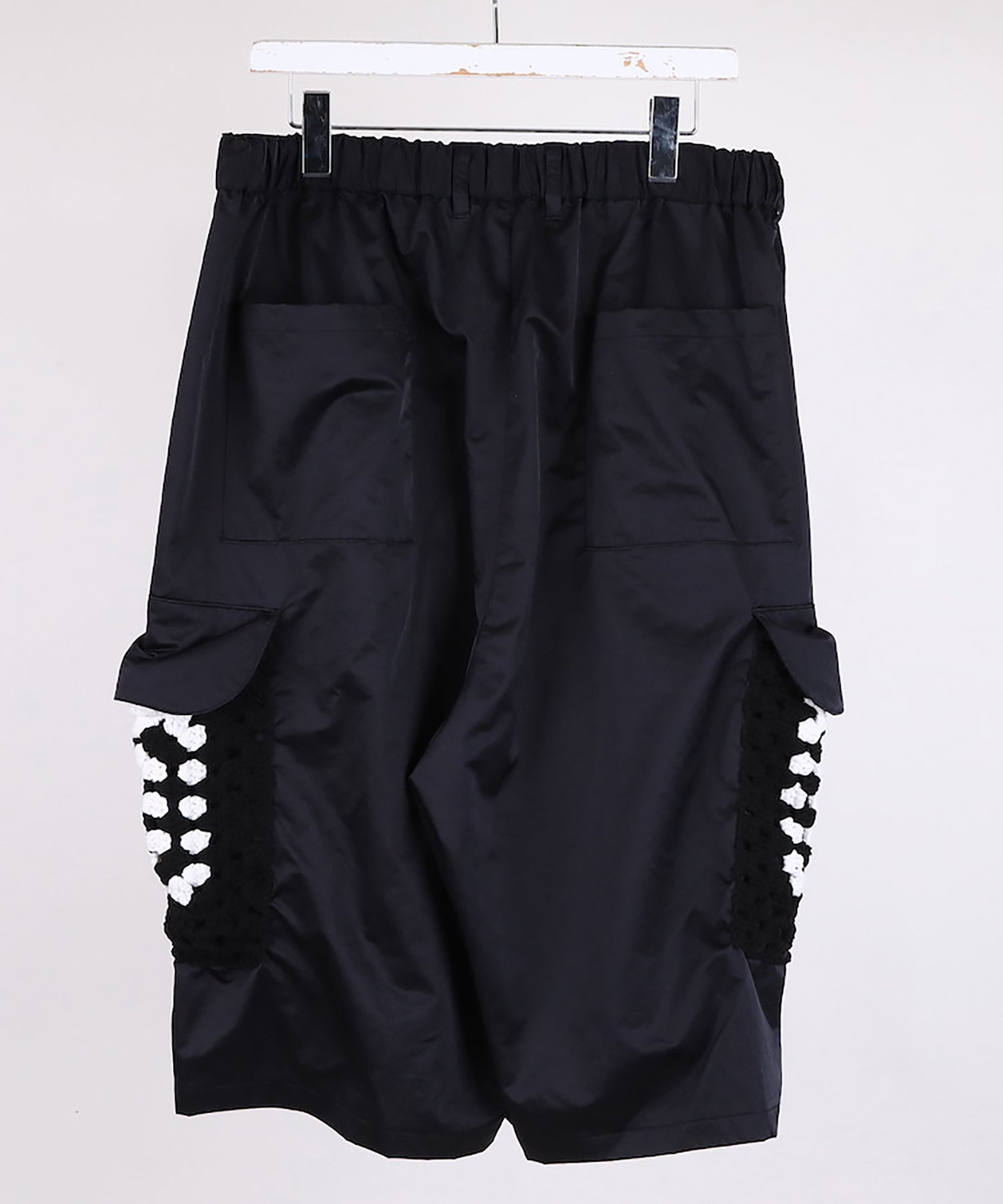 カーゴポケット部分には手編みによるかぎ針編みのニット切り替えデザインが目を引きつけます。