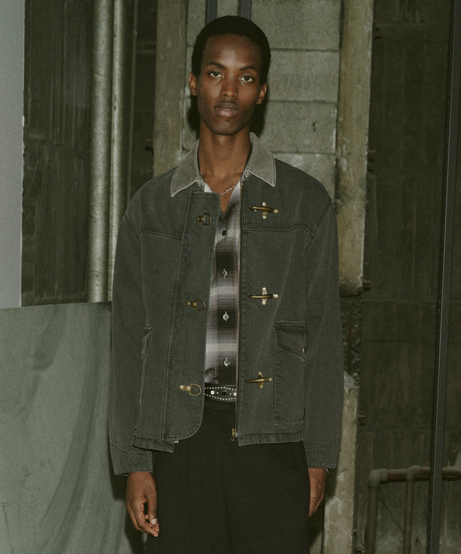 ジャストなサイズ感のジャケットとなっており、フロントには玉縁ポケットを配しております。