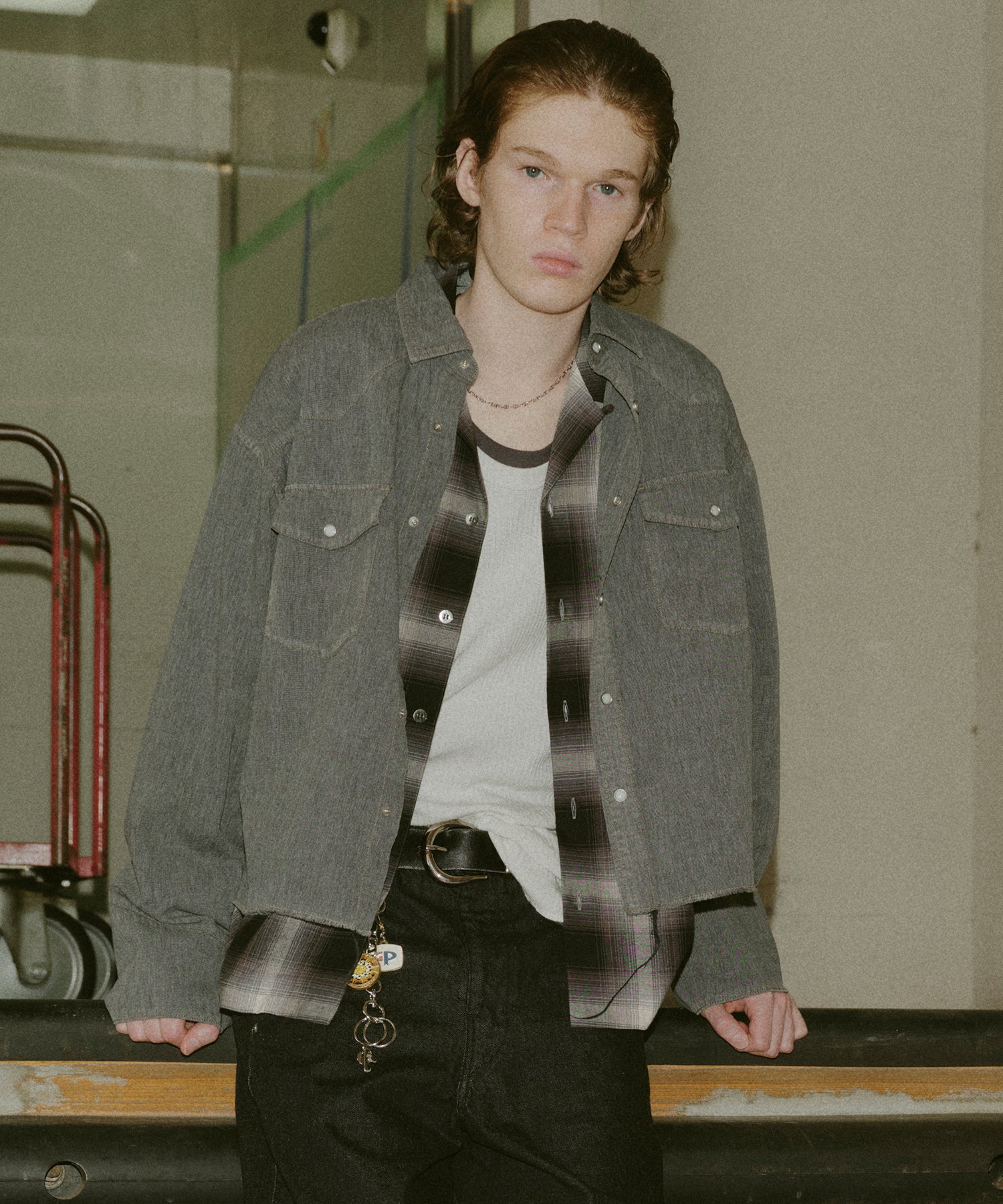 ウエスタンヨークにショート丈のボックスシルエットとなっており、前開きのボタンにはパールドットボタンを採用。