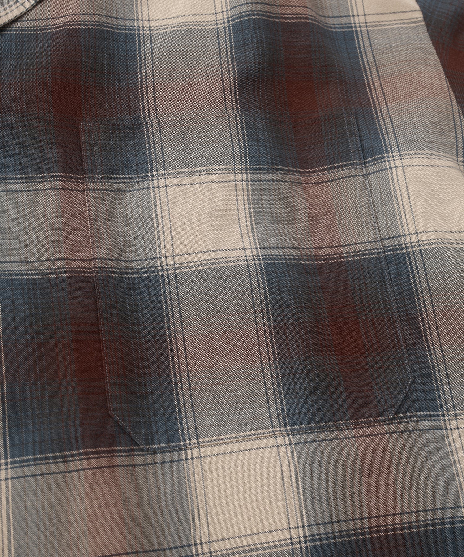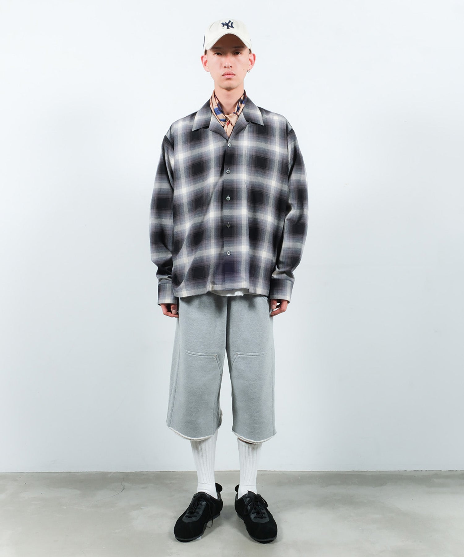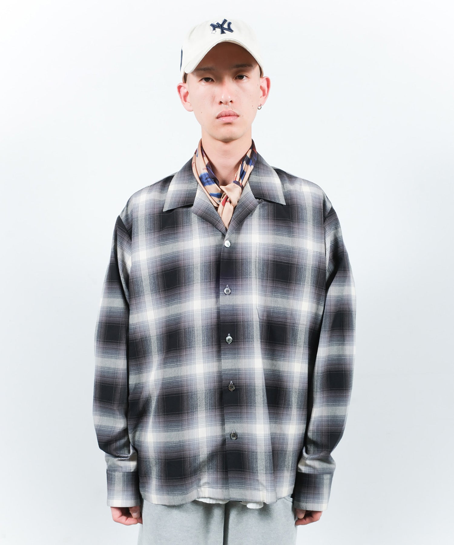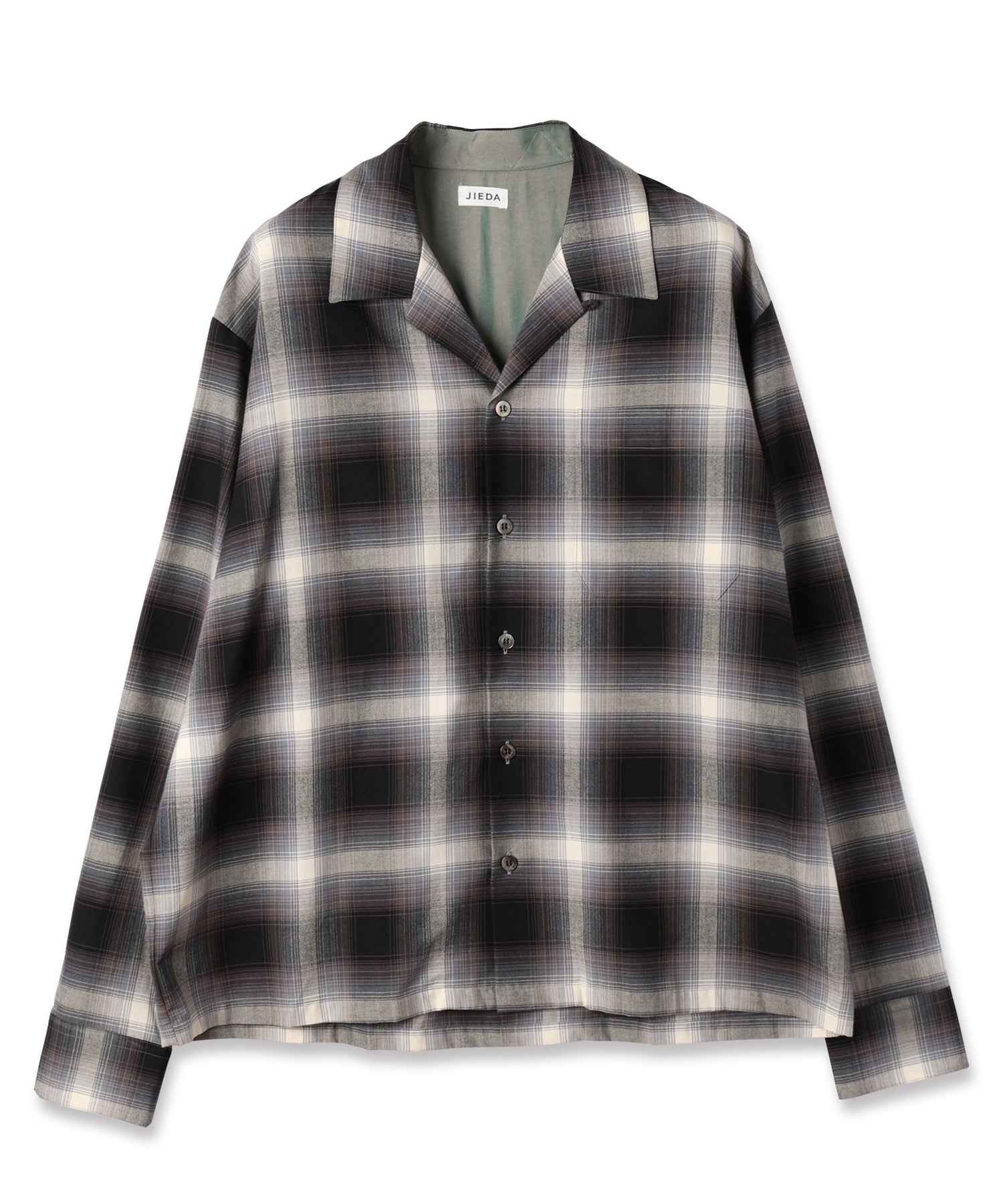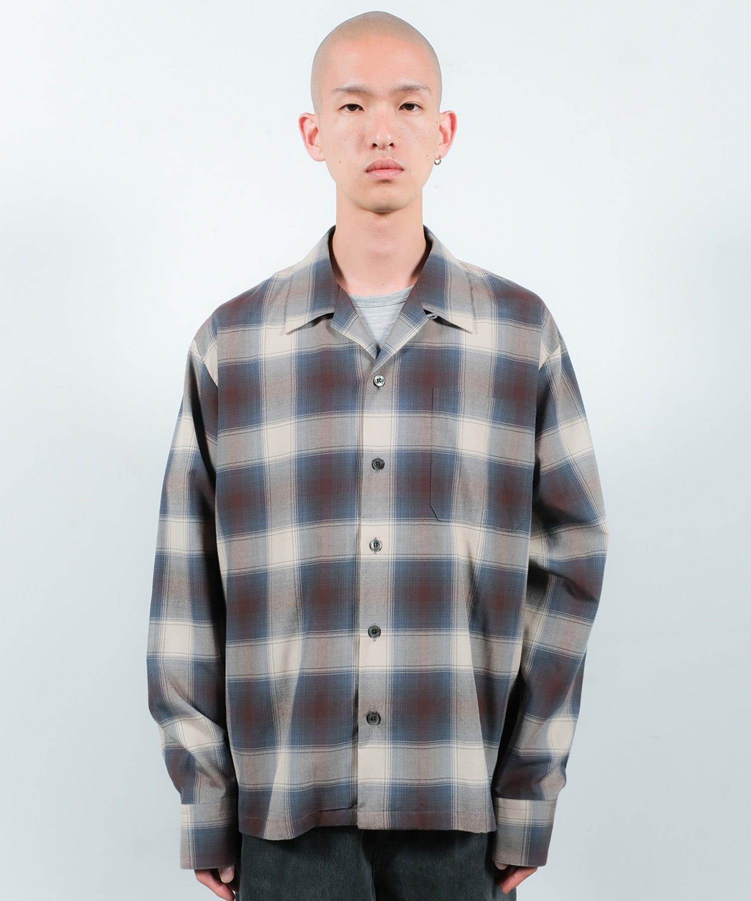 ステッチワークが目を引くオープンカラーシャツ。襟元のボタンで通常のシャツの様にも着れます。