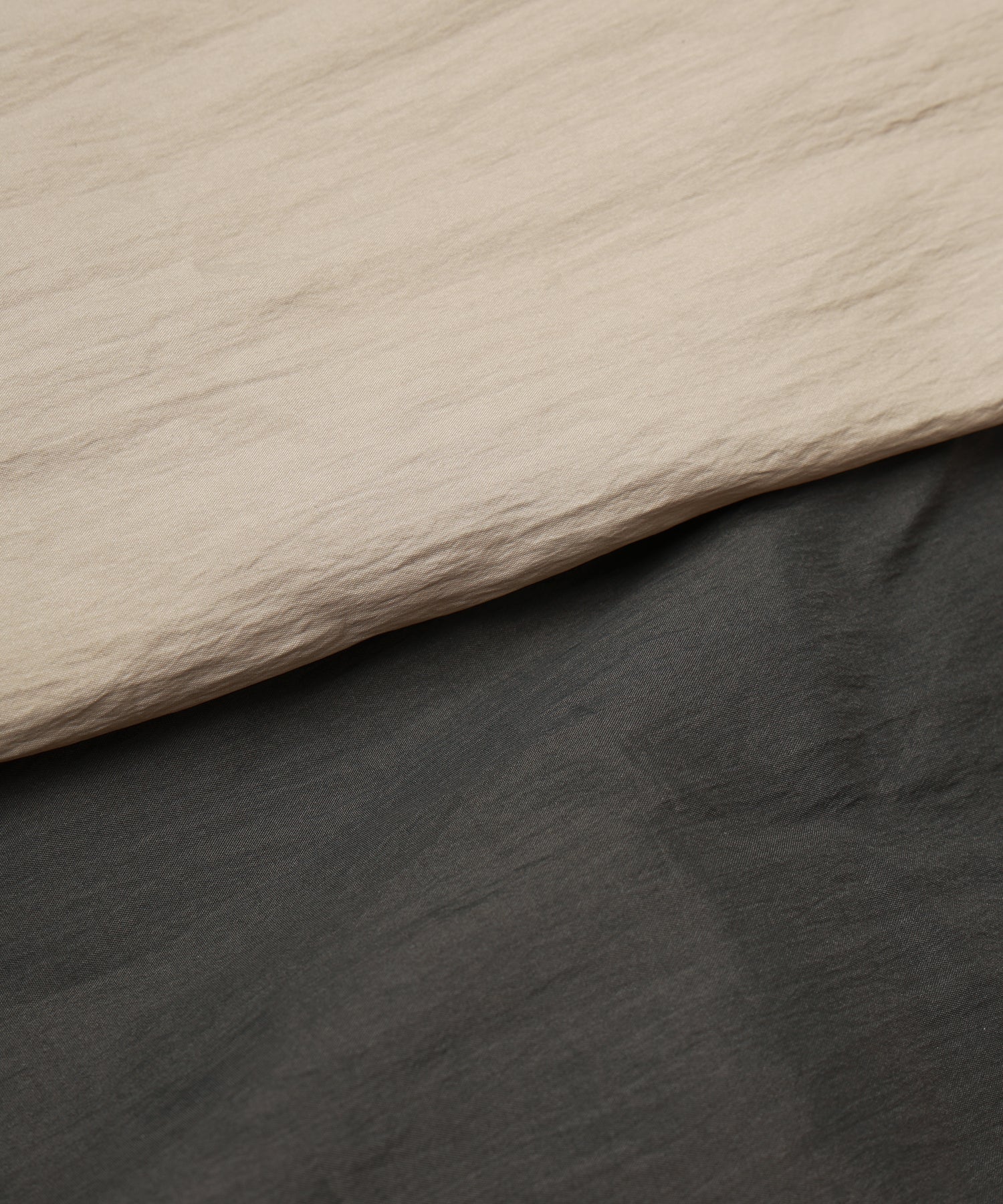 生地には経糸ビスコース、緯糸にはナイロンの糸を採用。縦横の収縮差による表情とマットな光沢感が特徴的。
