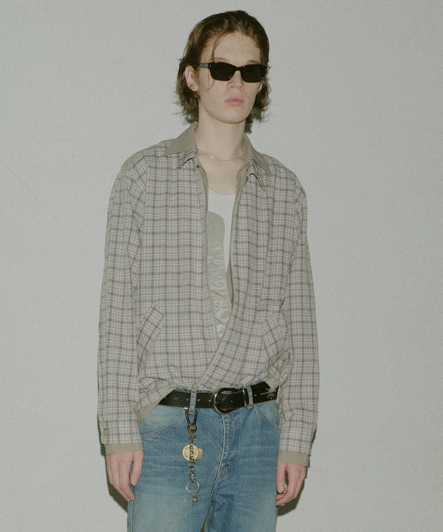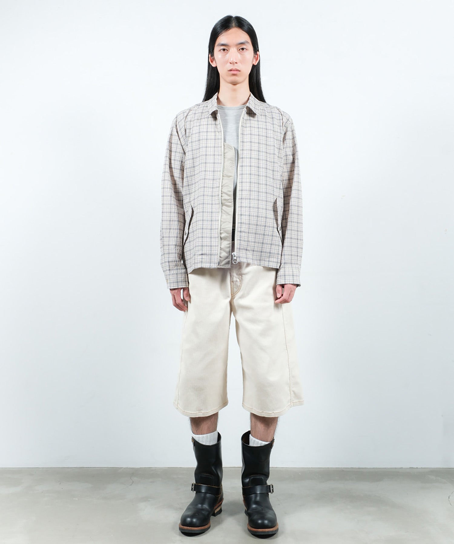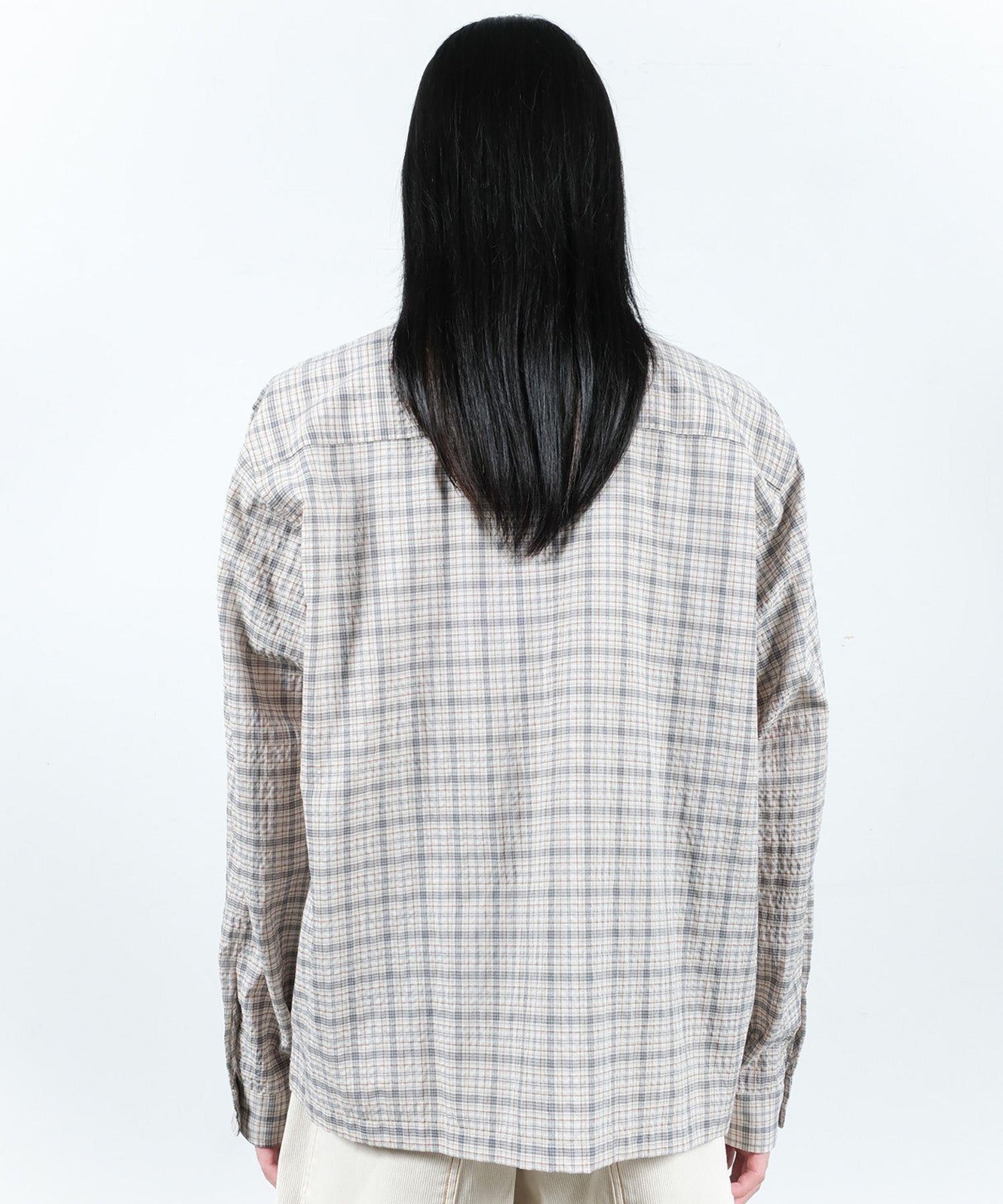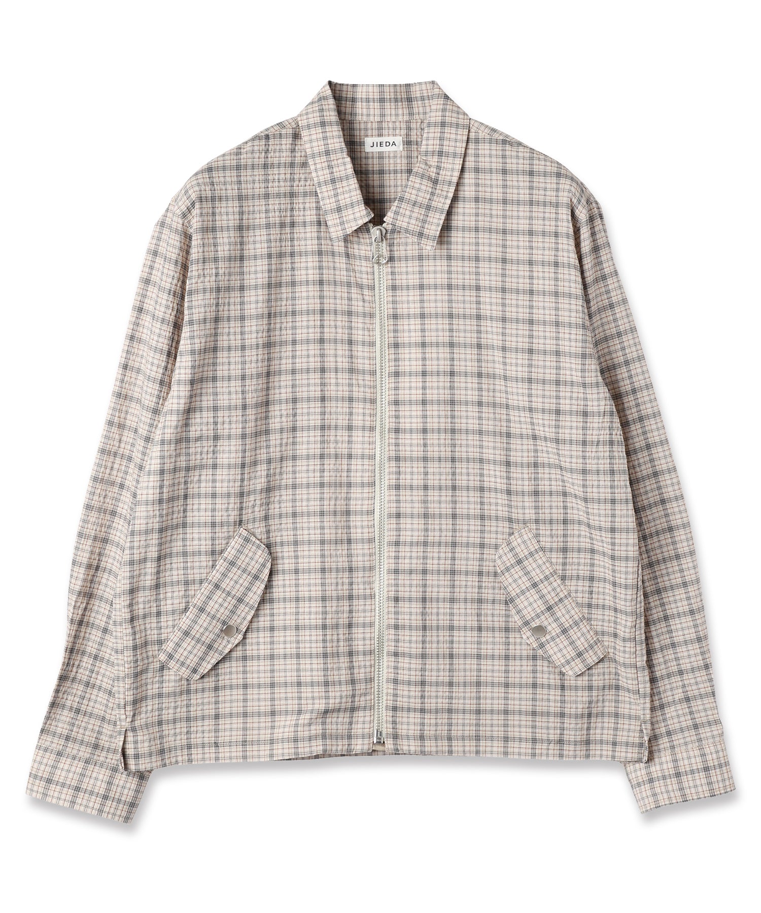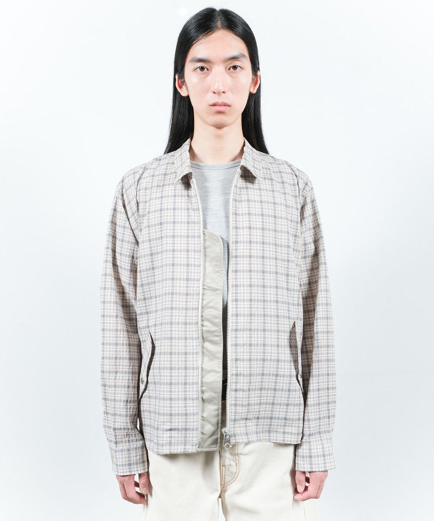 シアサッカーチェック生地を使用した、ジップシャツ。