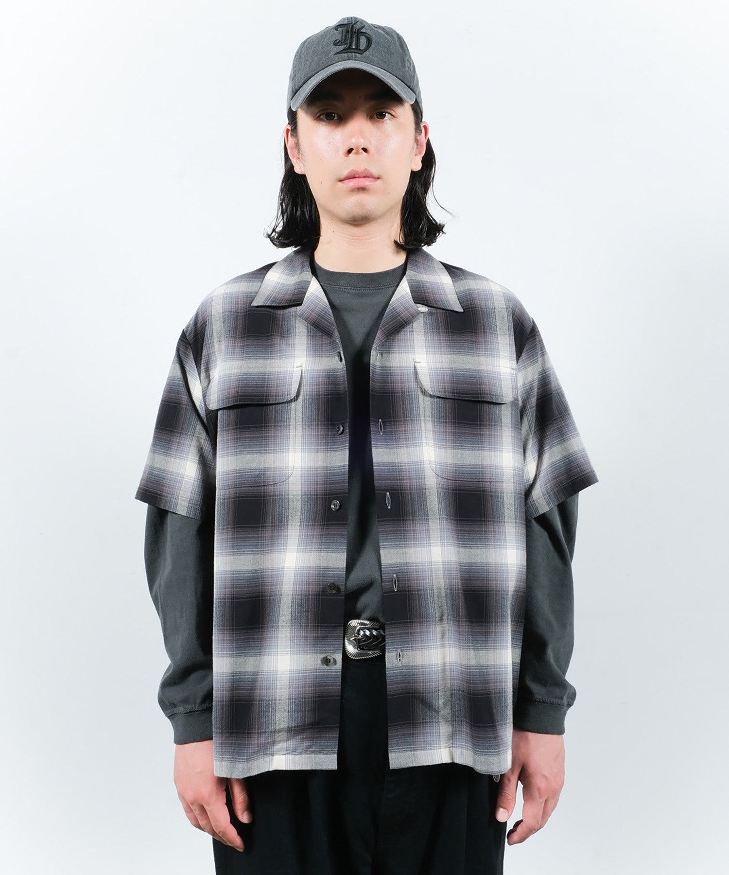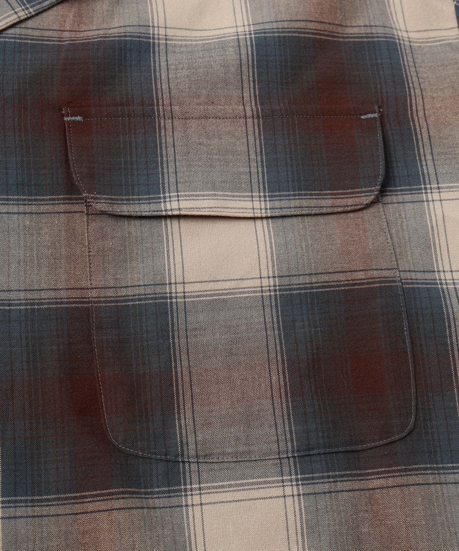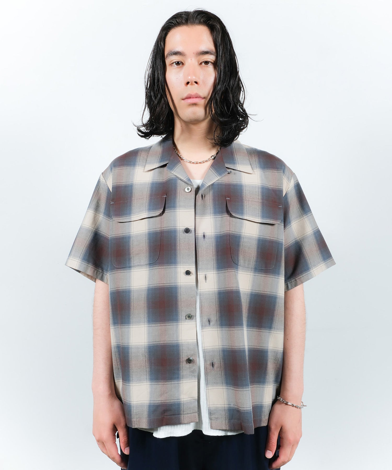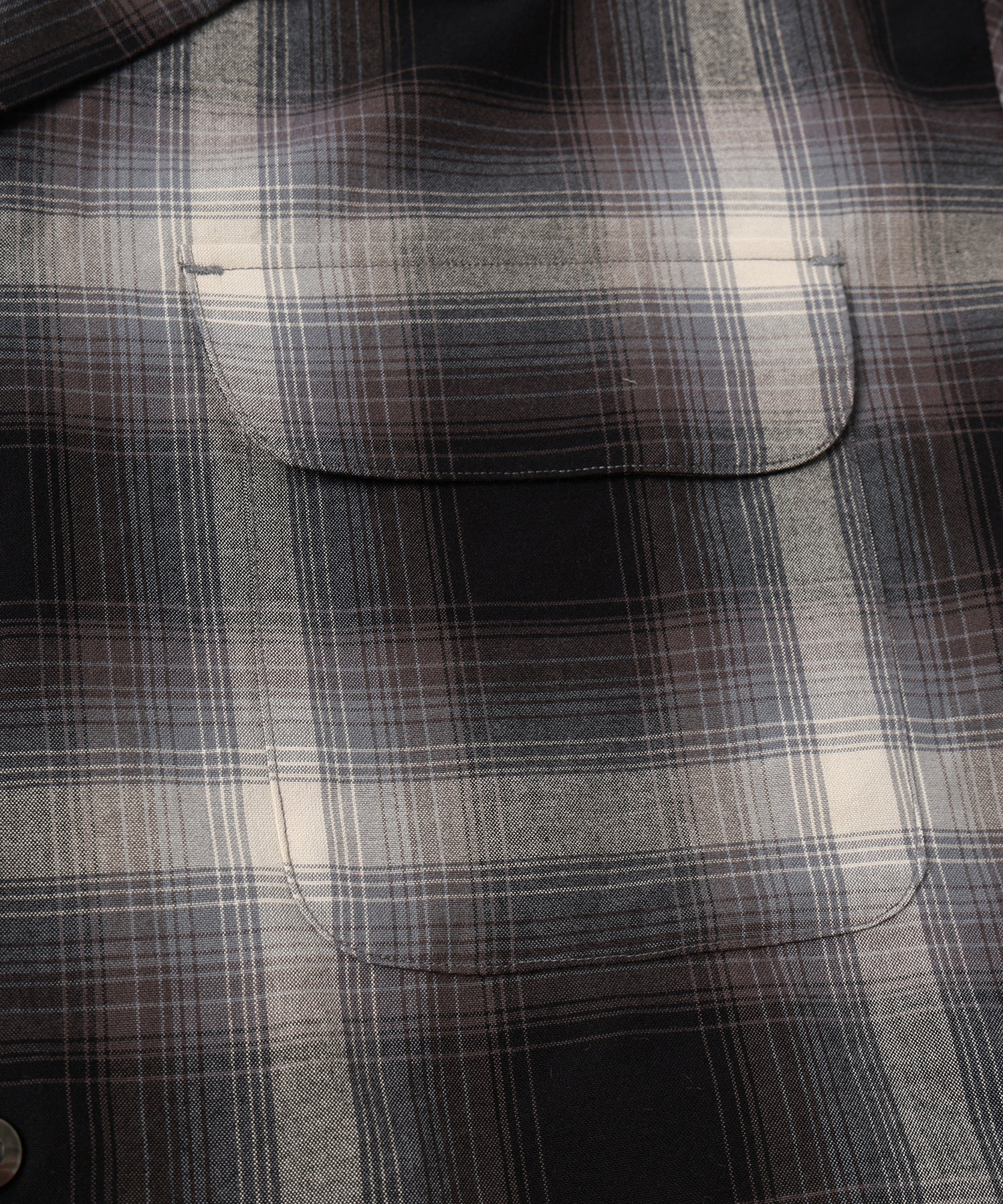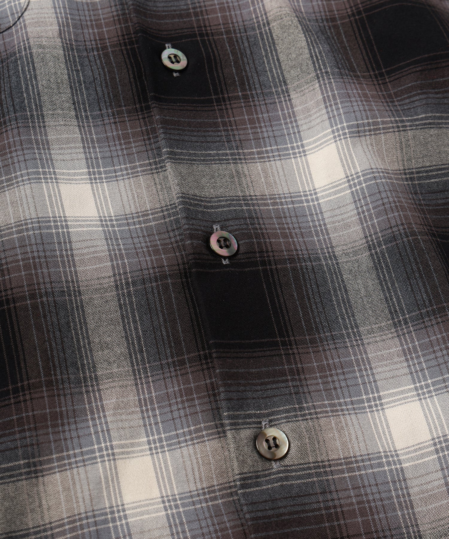 オリジナルのオンブレチェック生地を使用したオープンカラーシャツ。