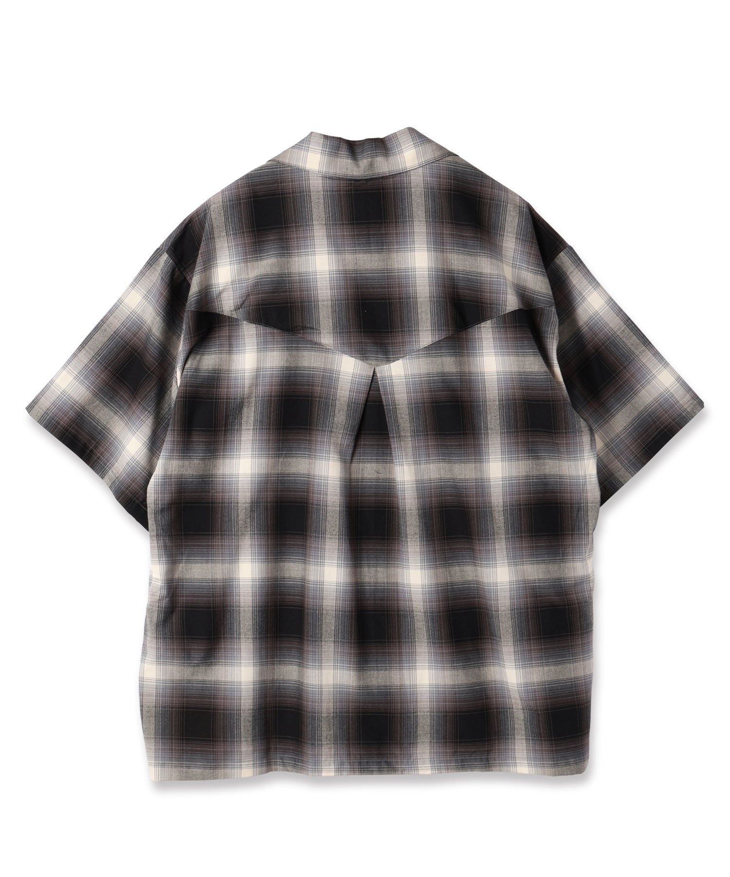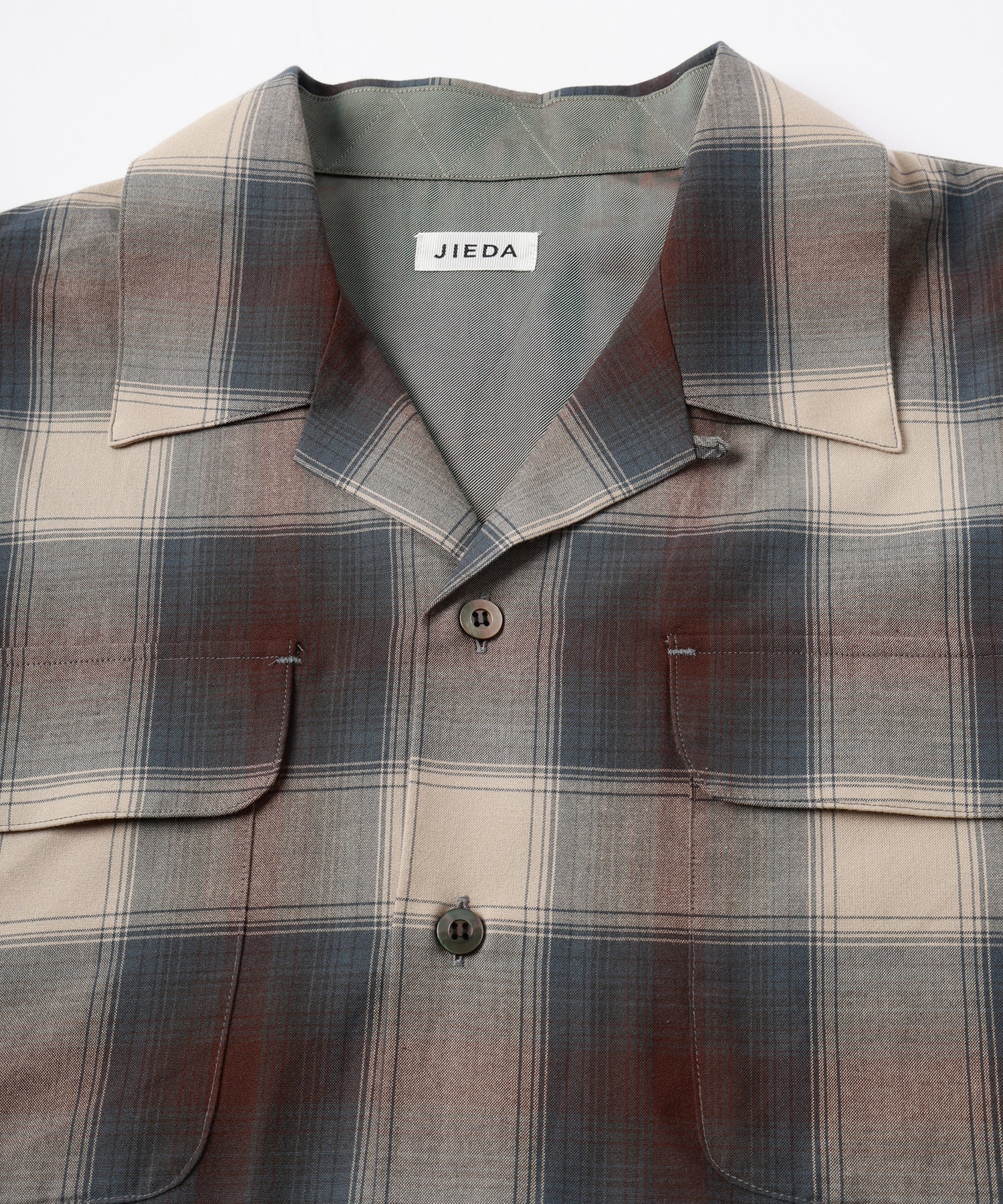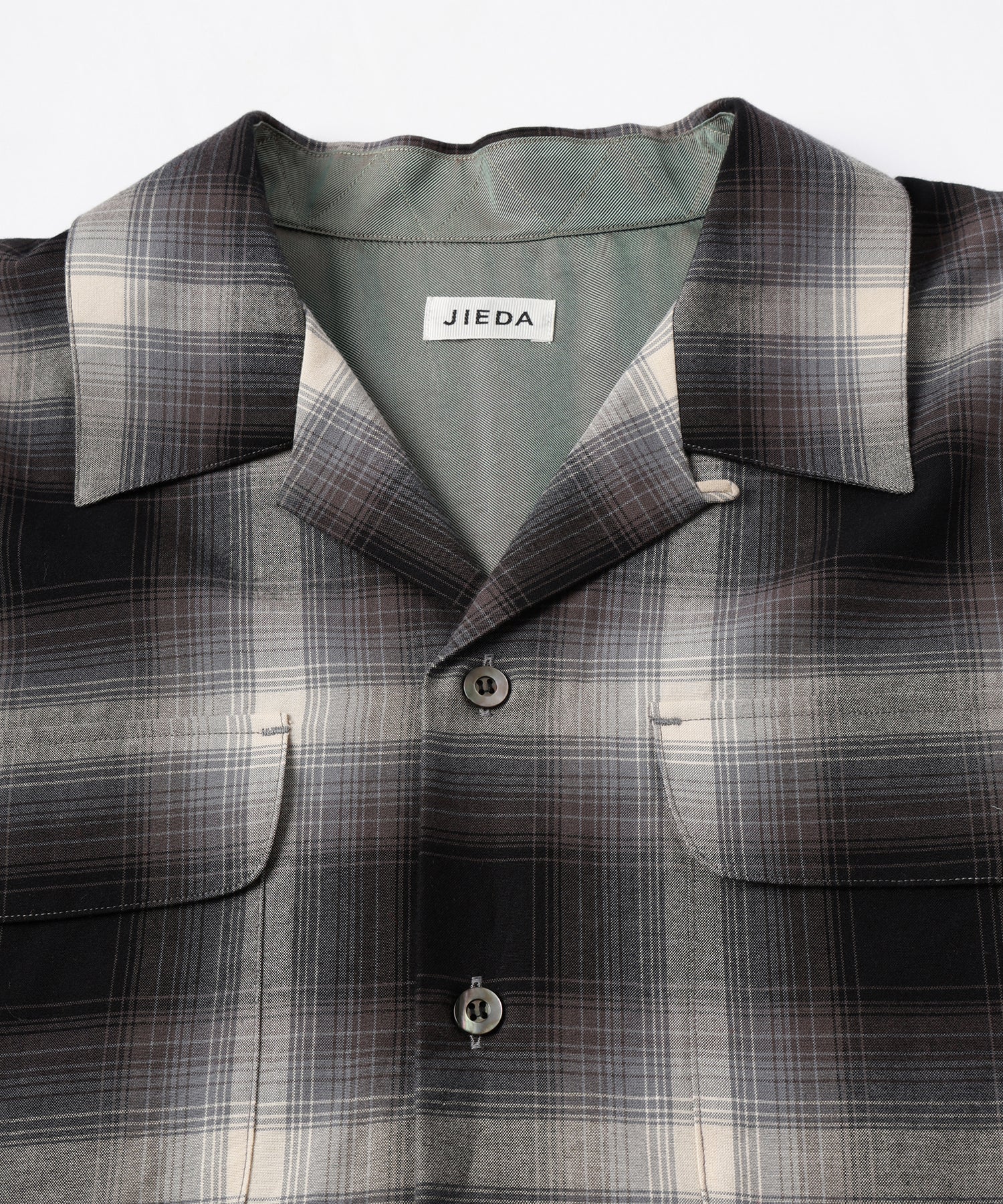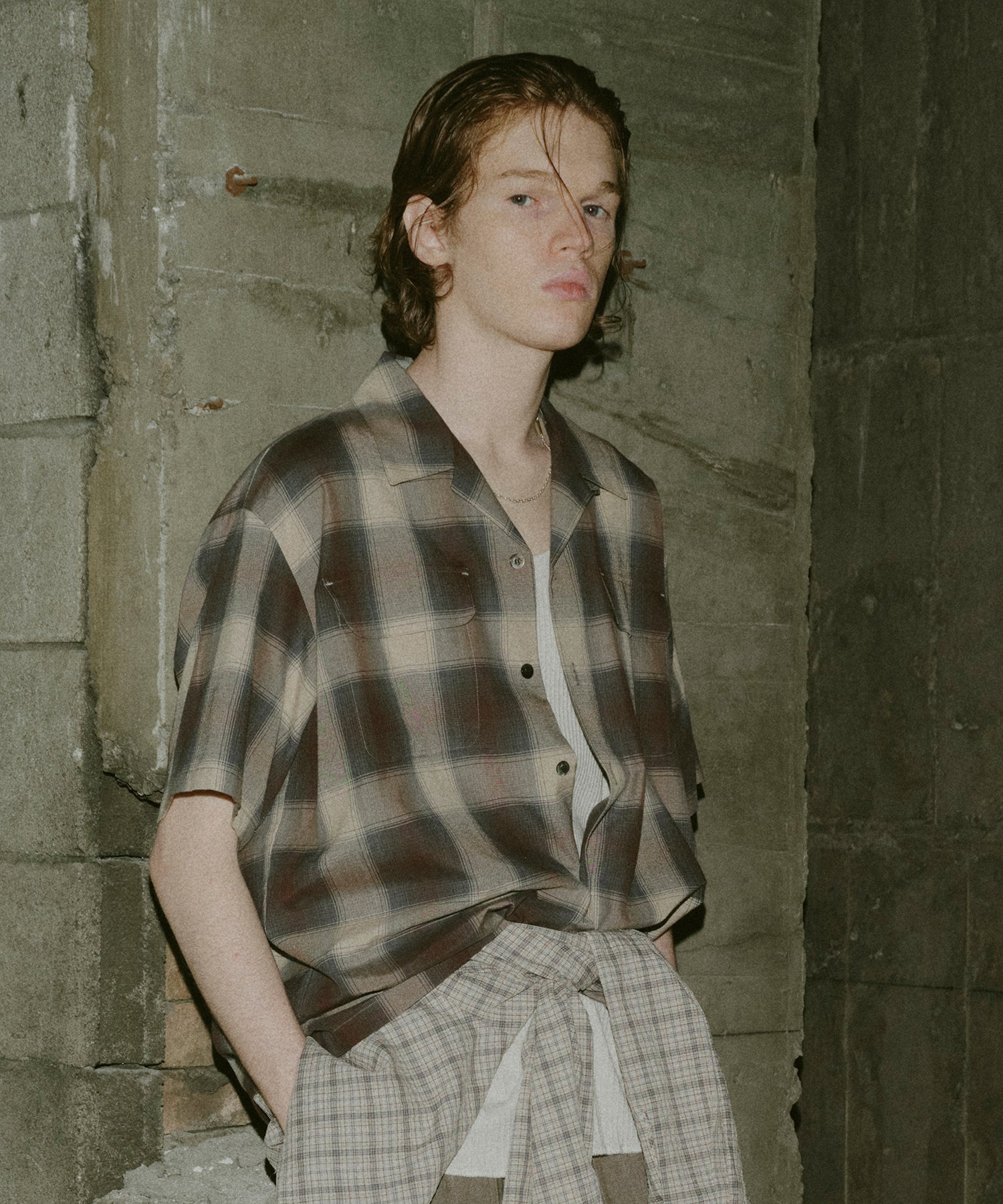オリジナルのオンブレチェック生地を使用したオープンカラーシャツ。