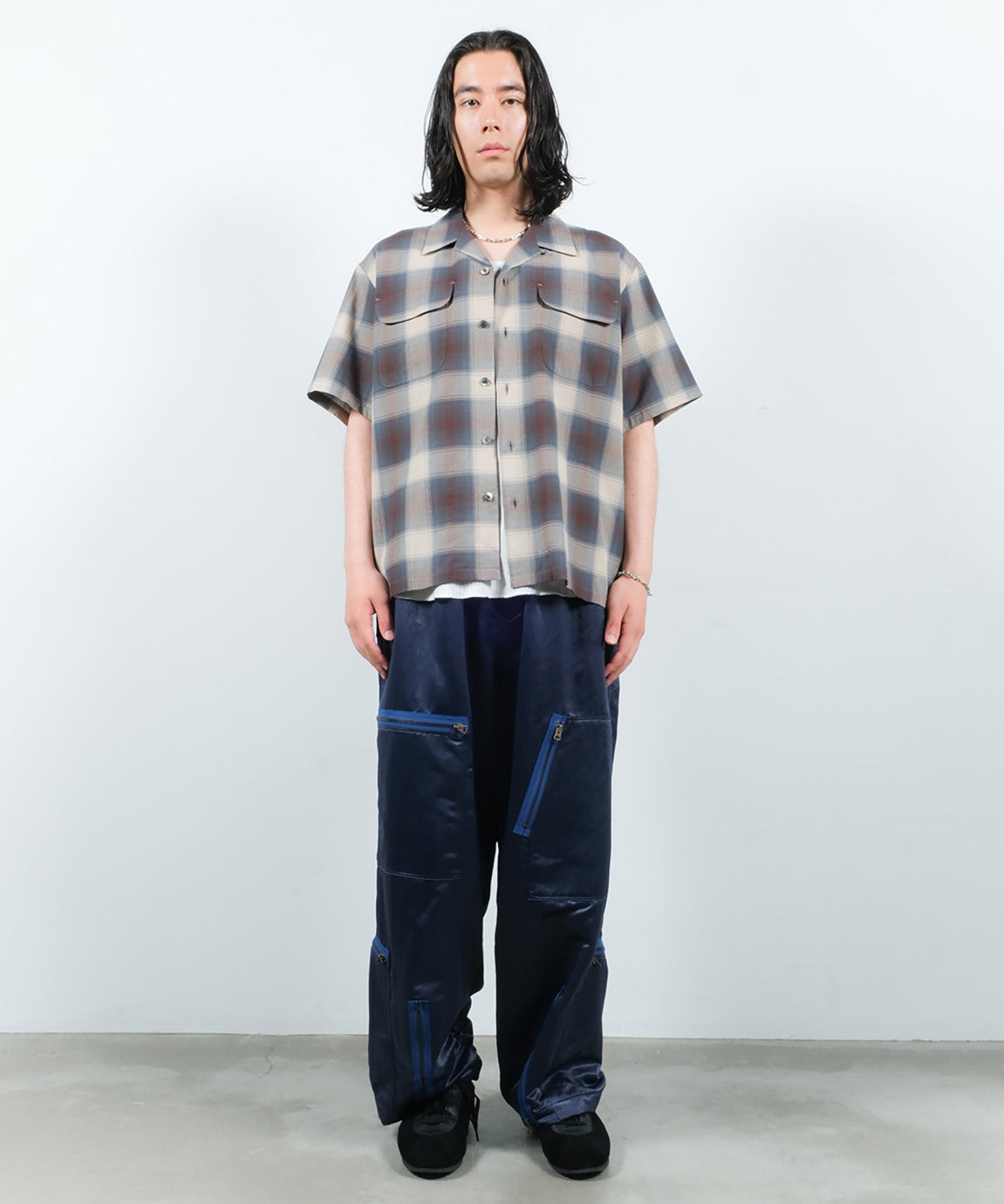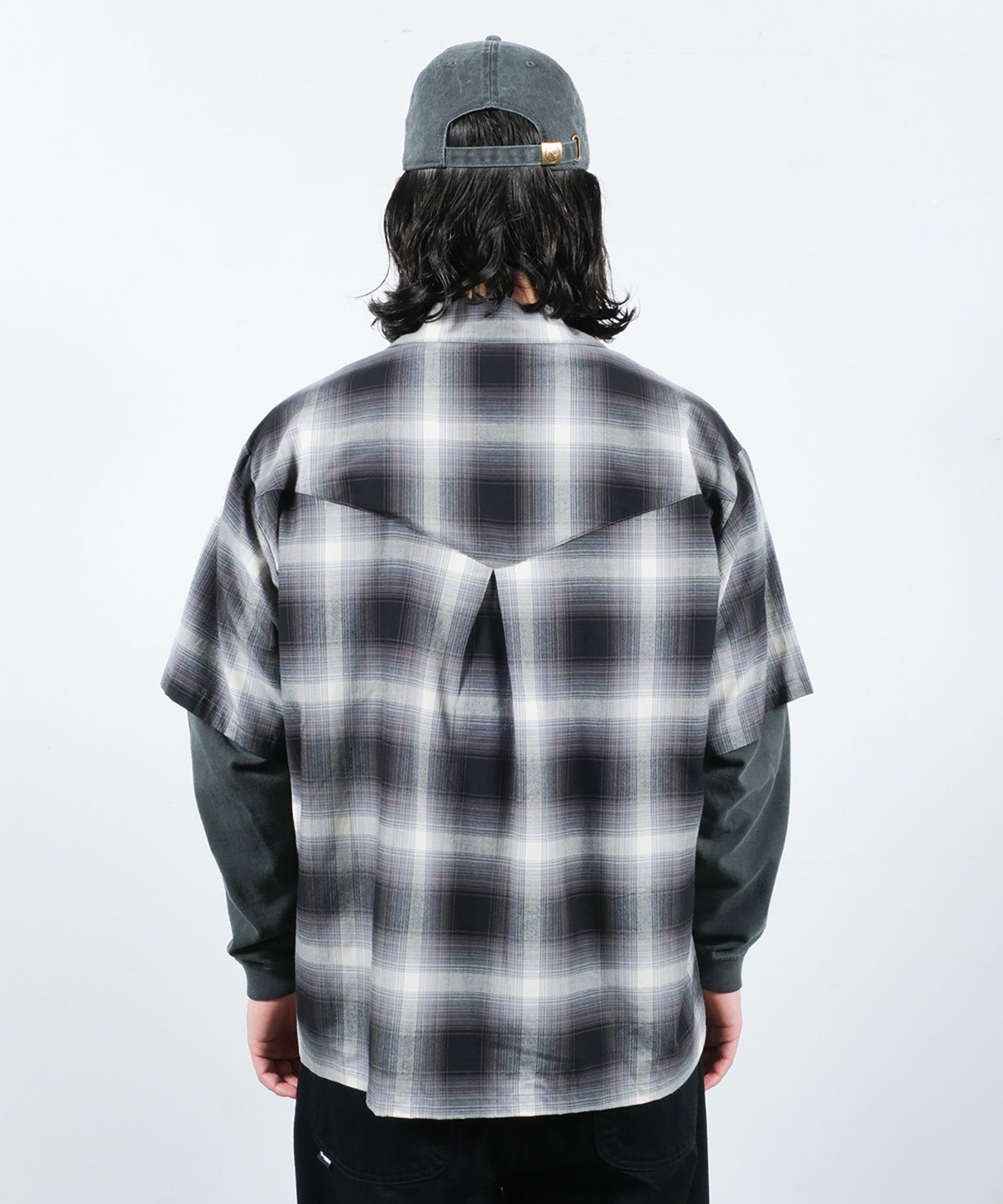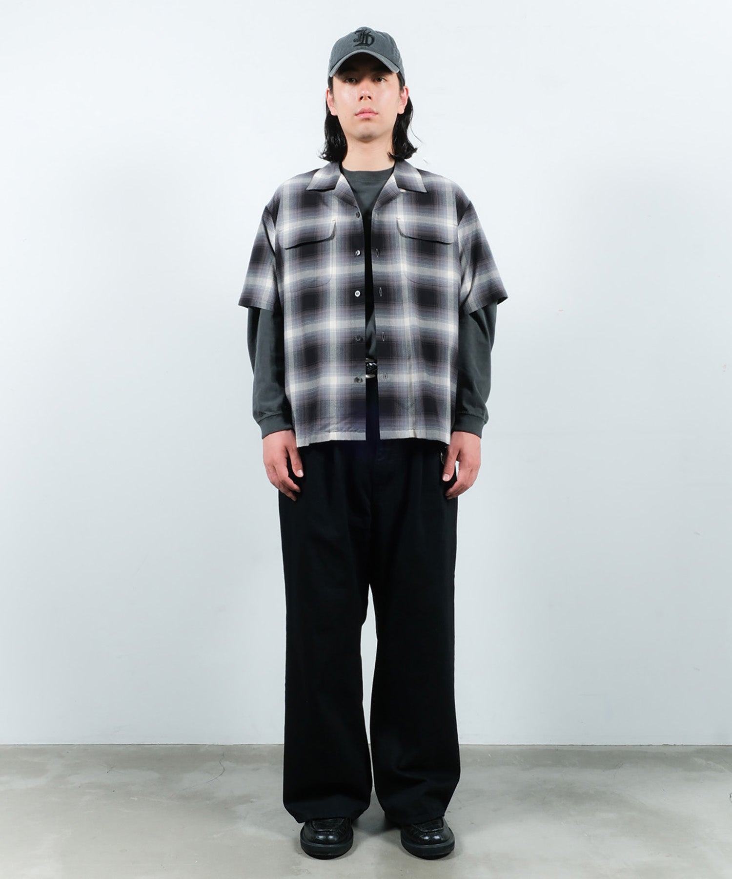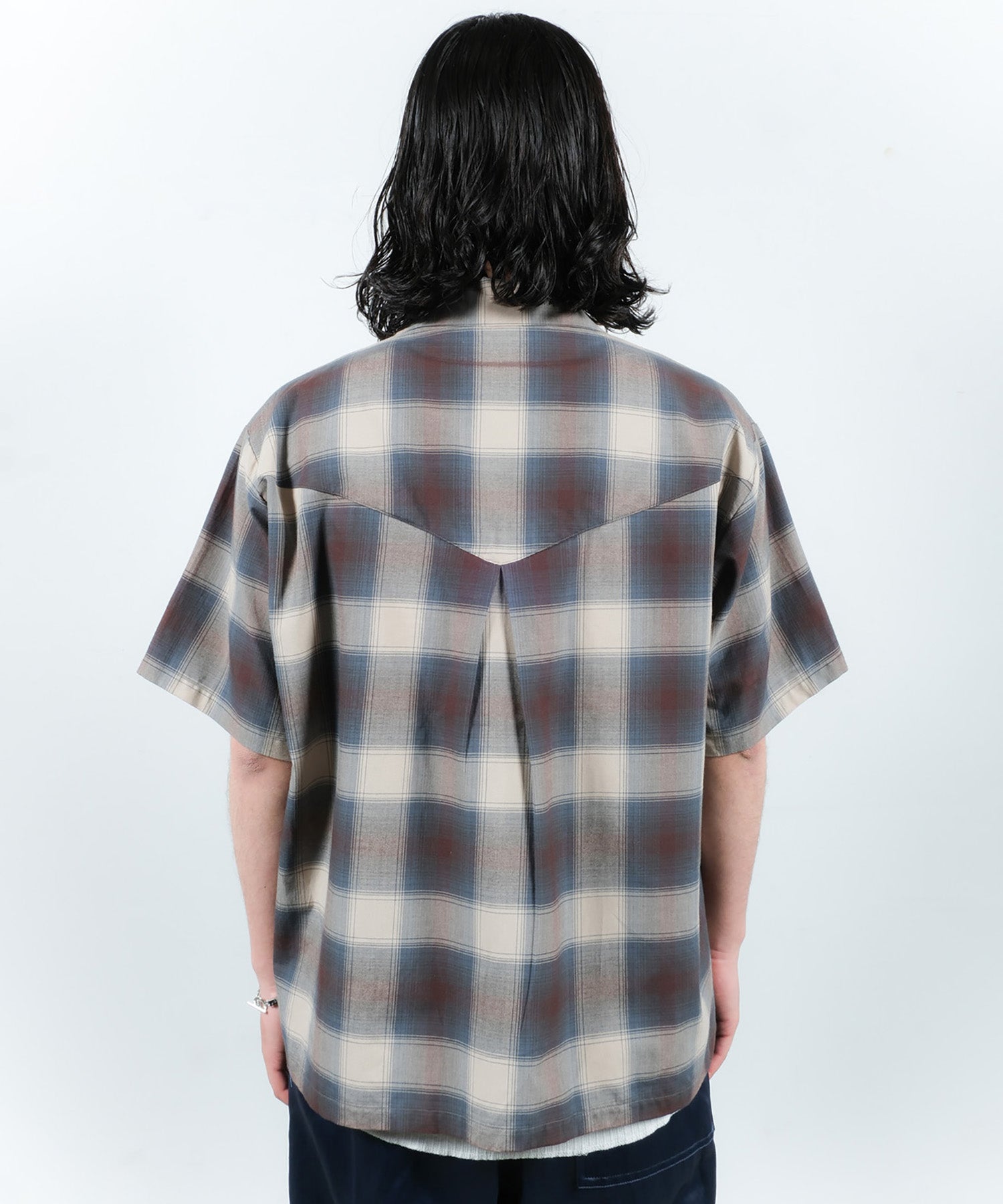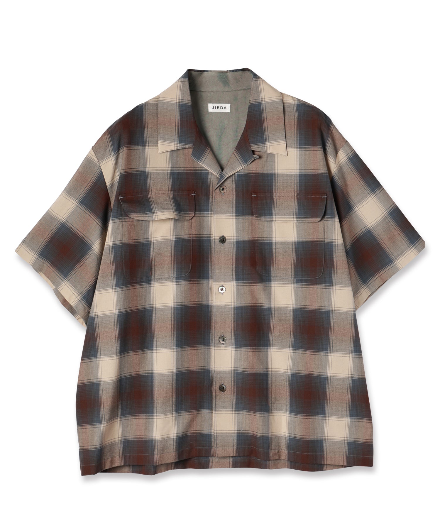 オリジナルのオンブレチェック生地を使用したオープンカラーシャツ。