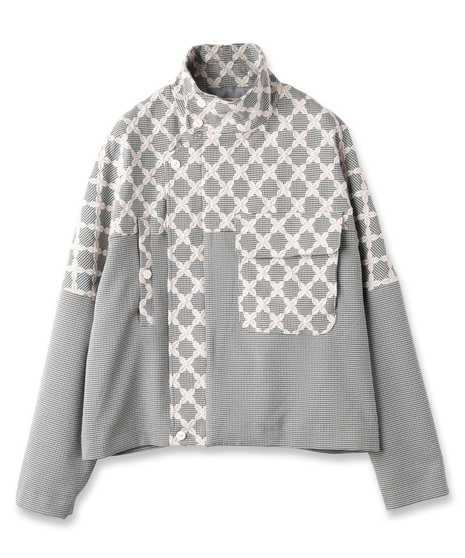 千鳥チェック柄の生地の上からクロス柄をオーバー刺繍しています。