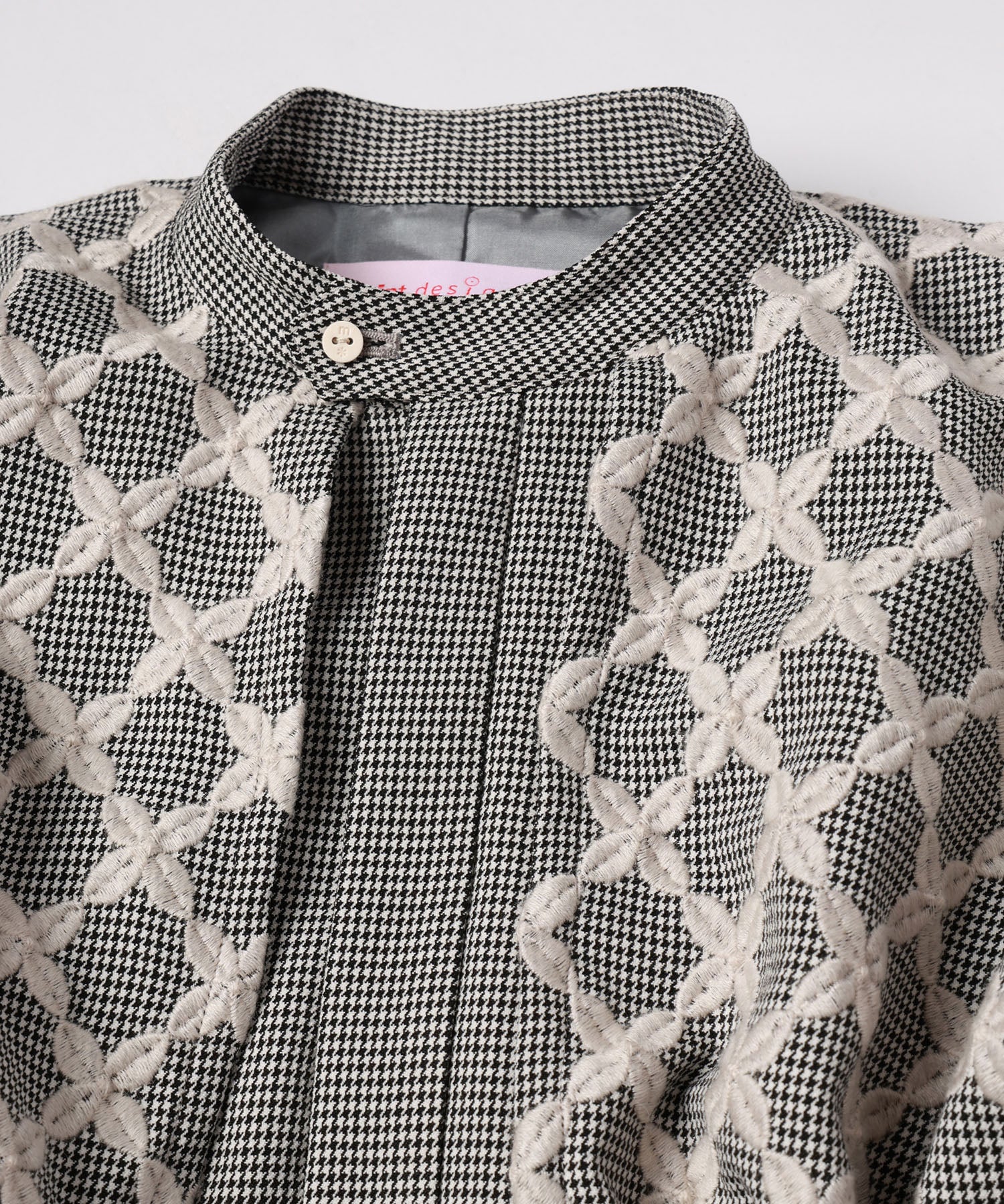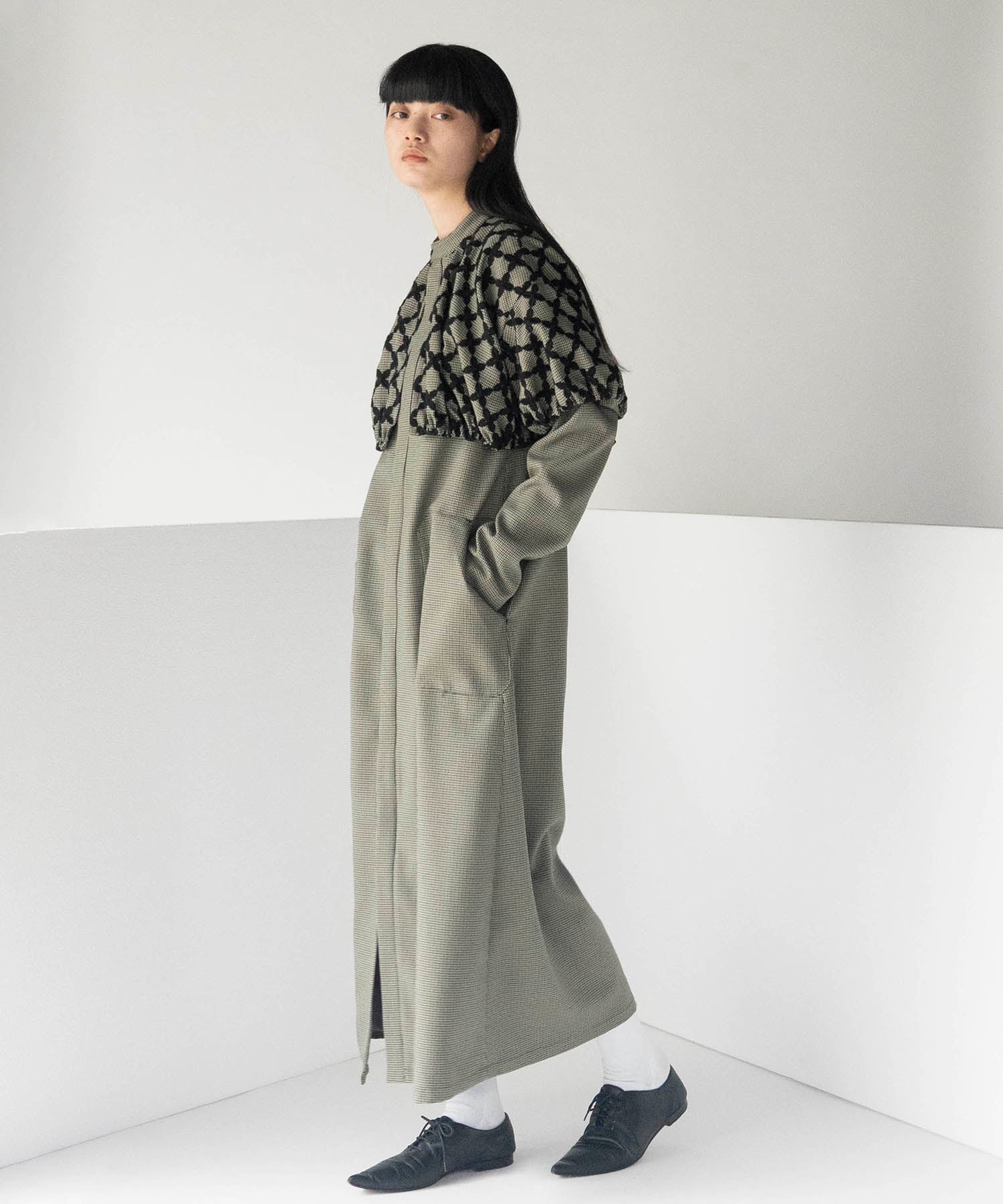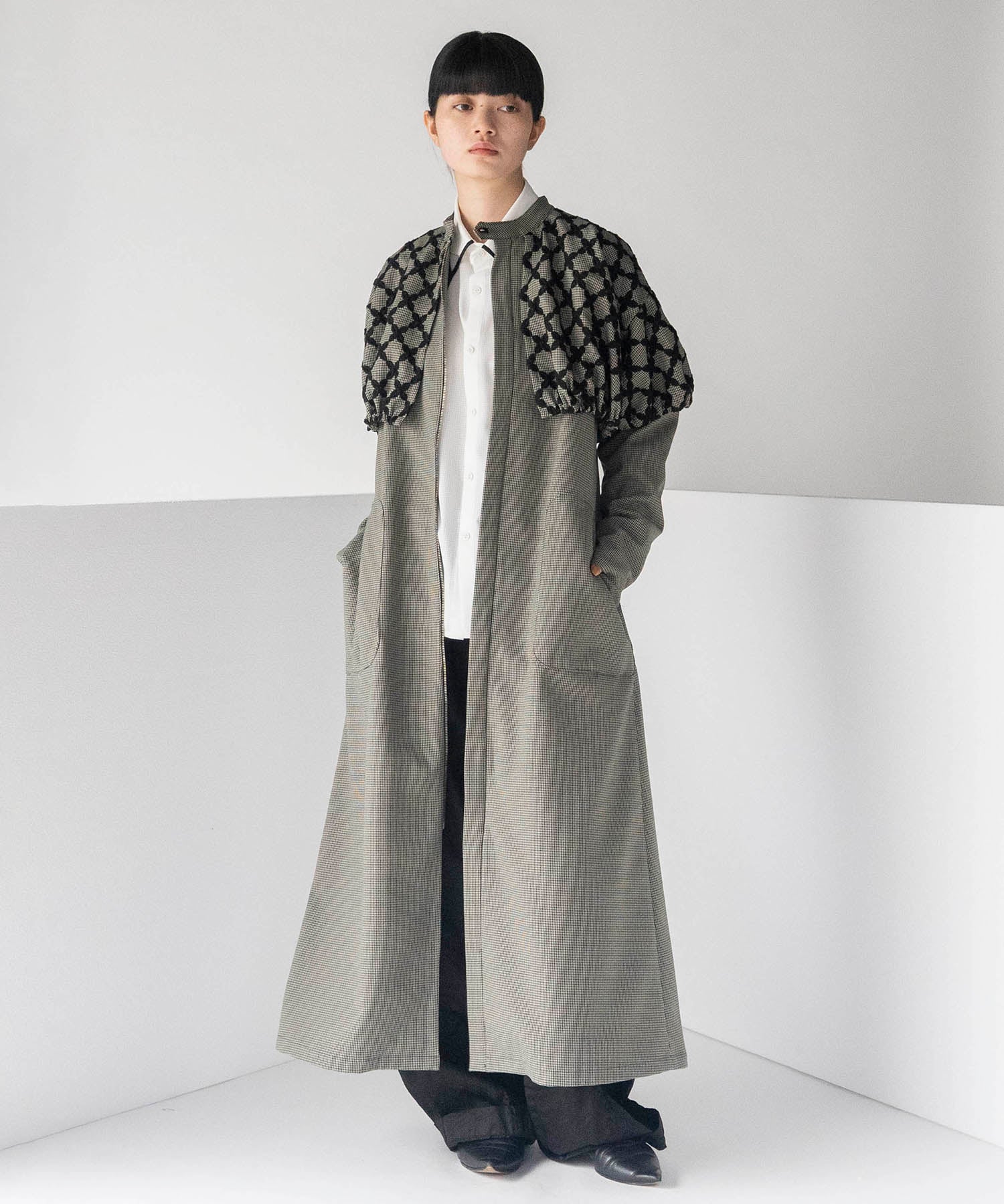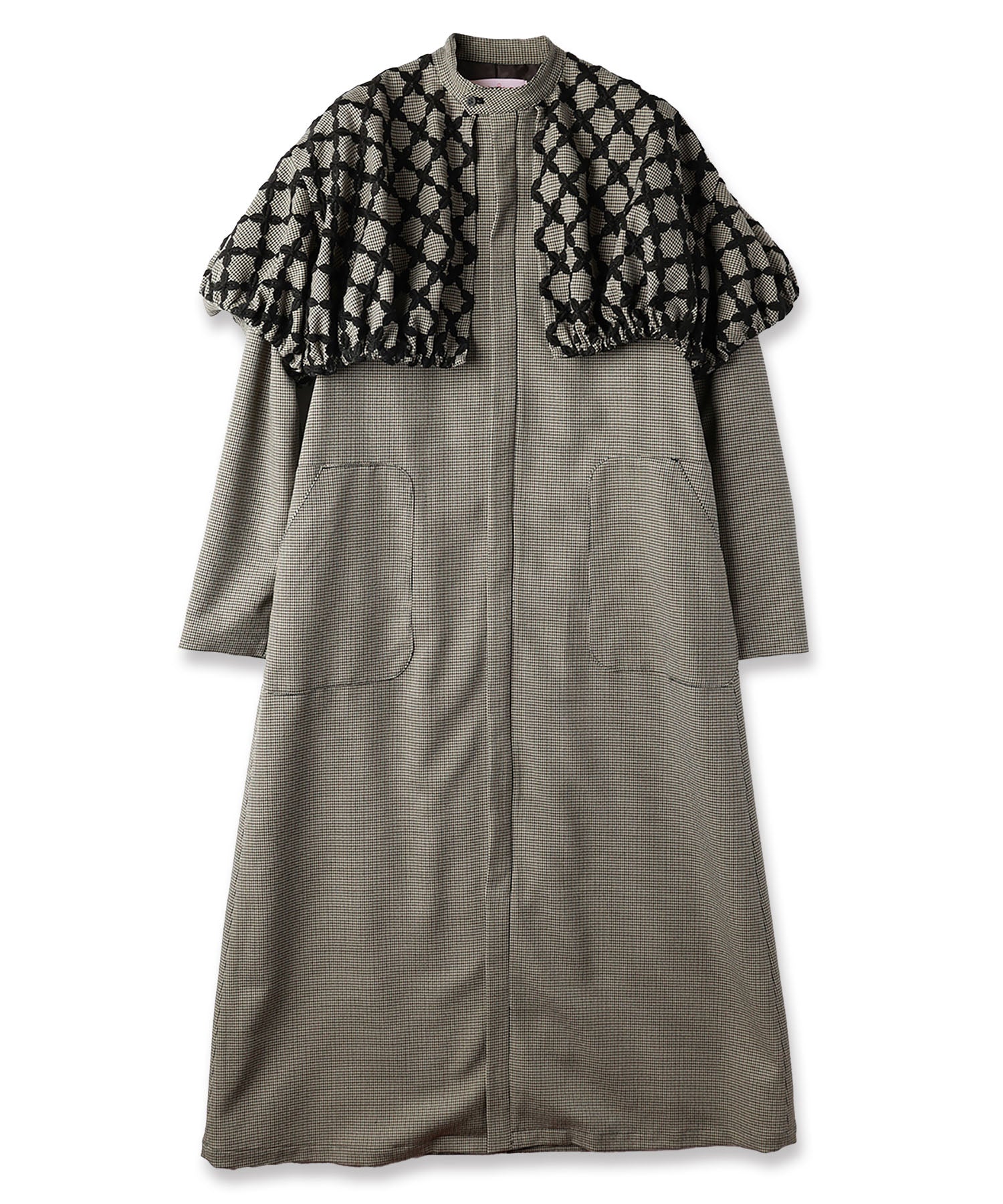 形は刺繍生地と千鳥格子の生地の切り替えがアクセントになっているドレスコートです。