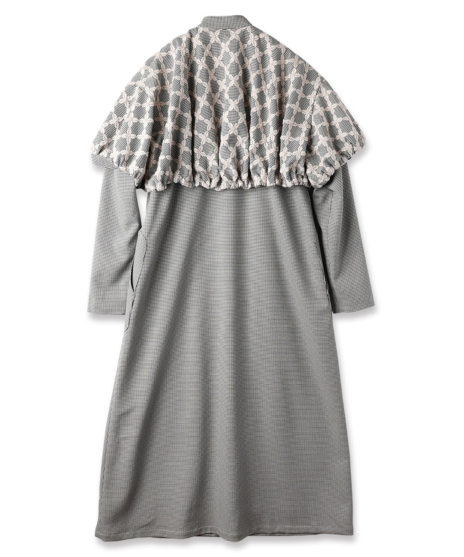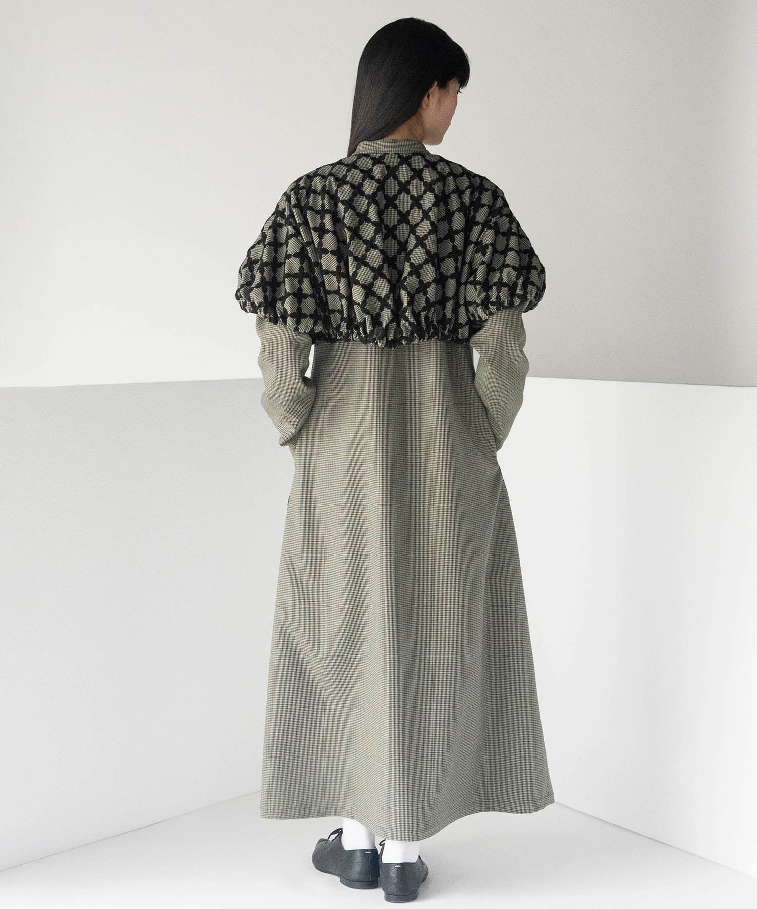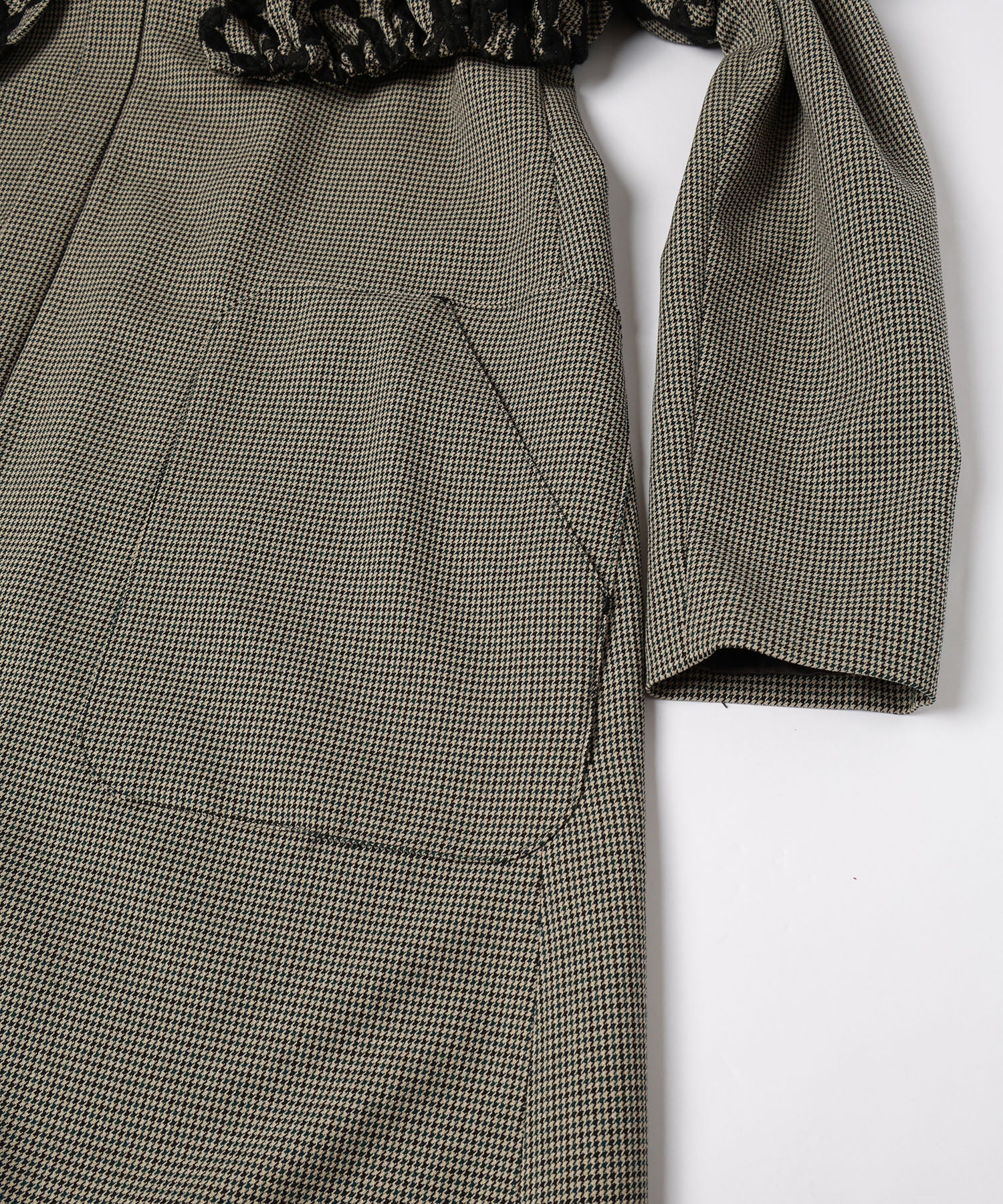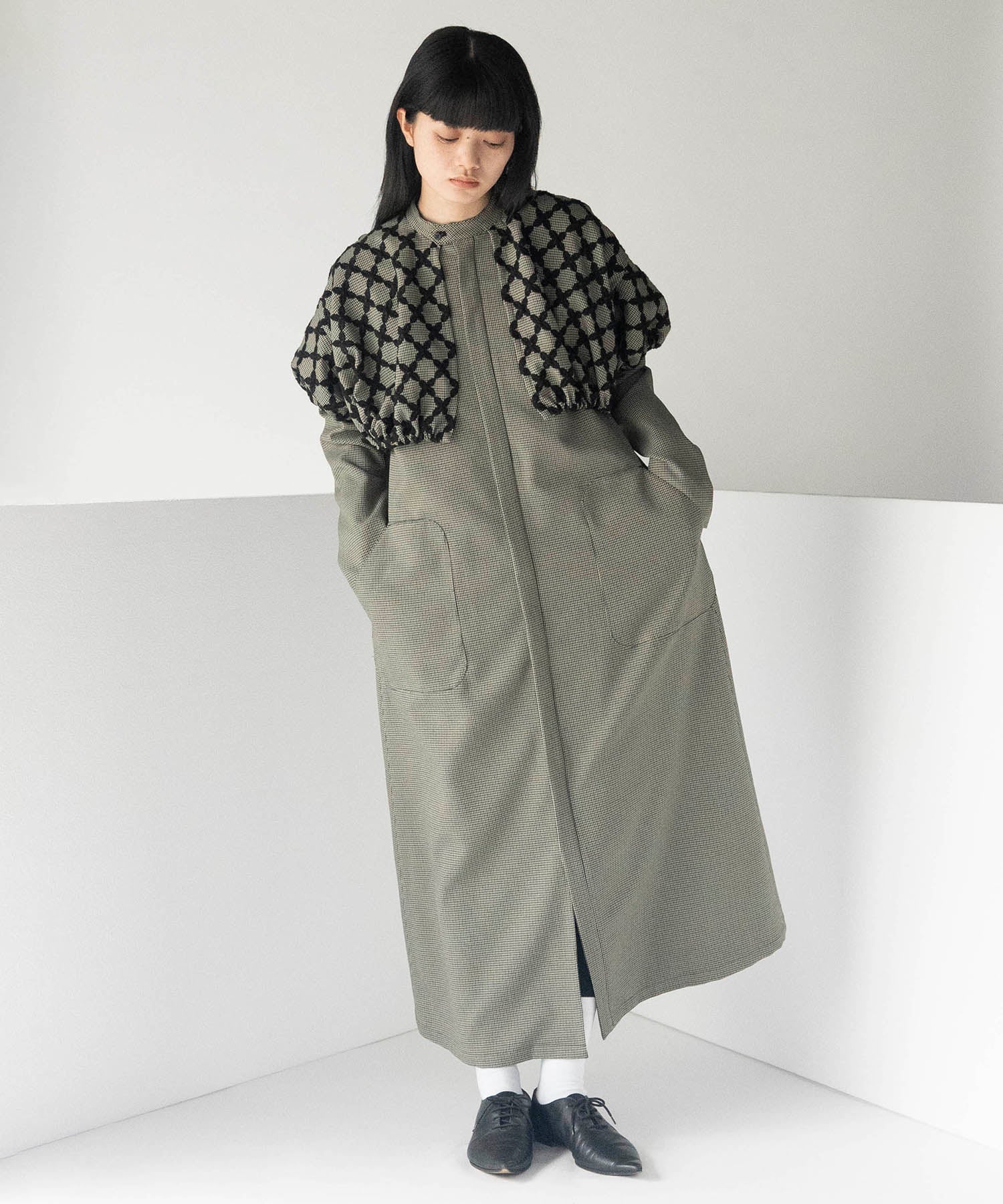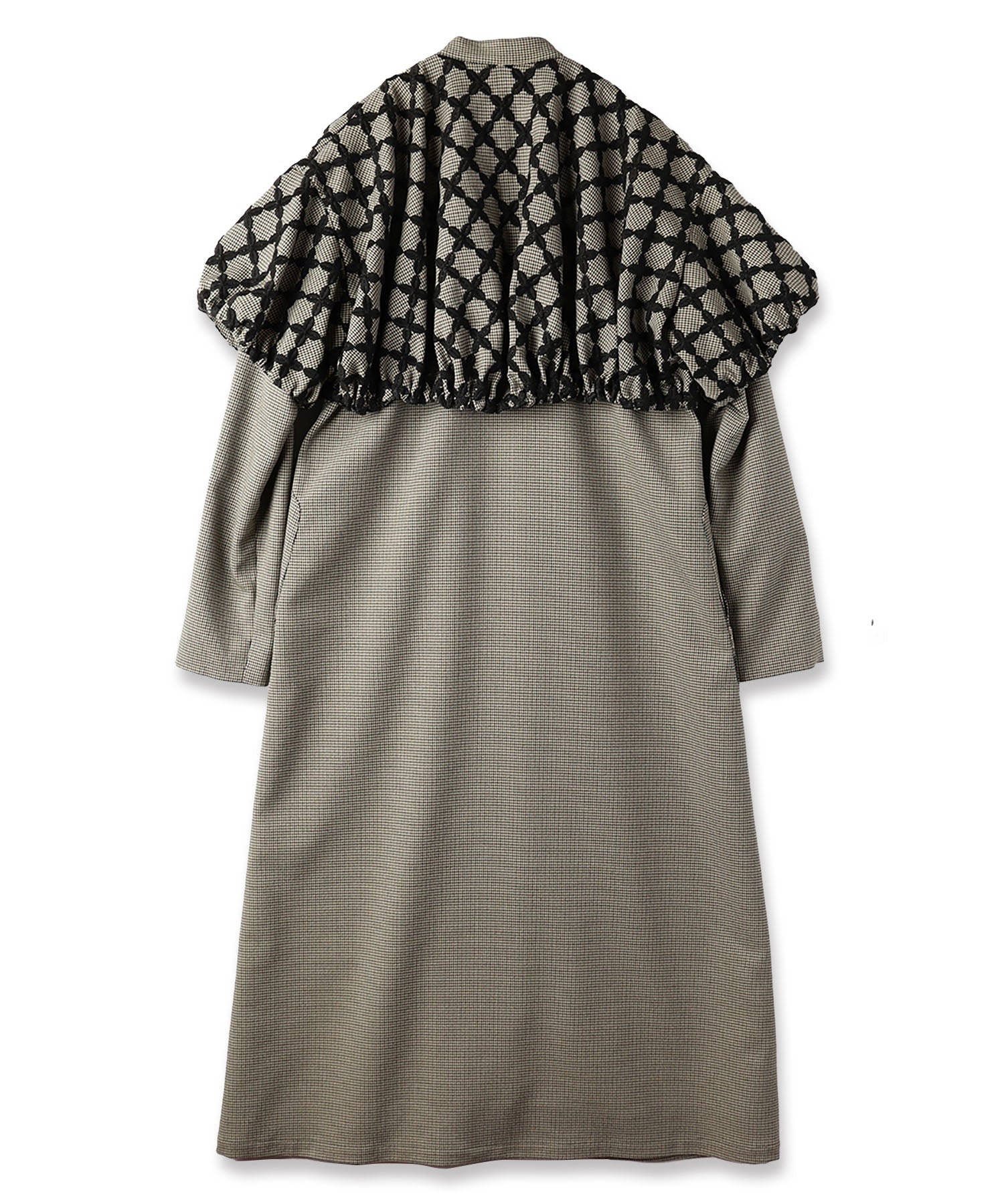 形は刺繍生地と千鳥格子の生地の切り替えがアクセントになっているドレスコートです。
