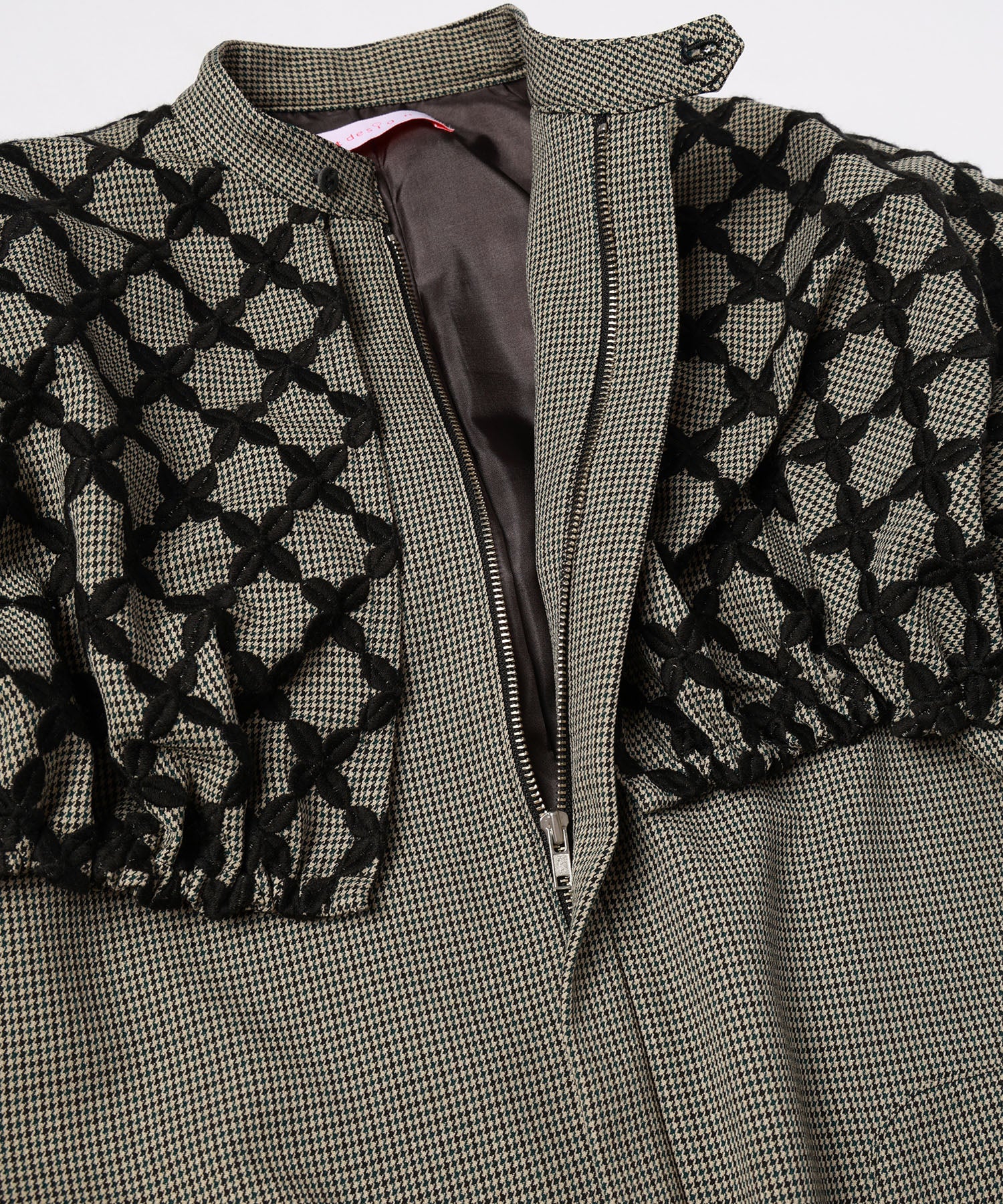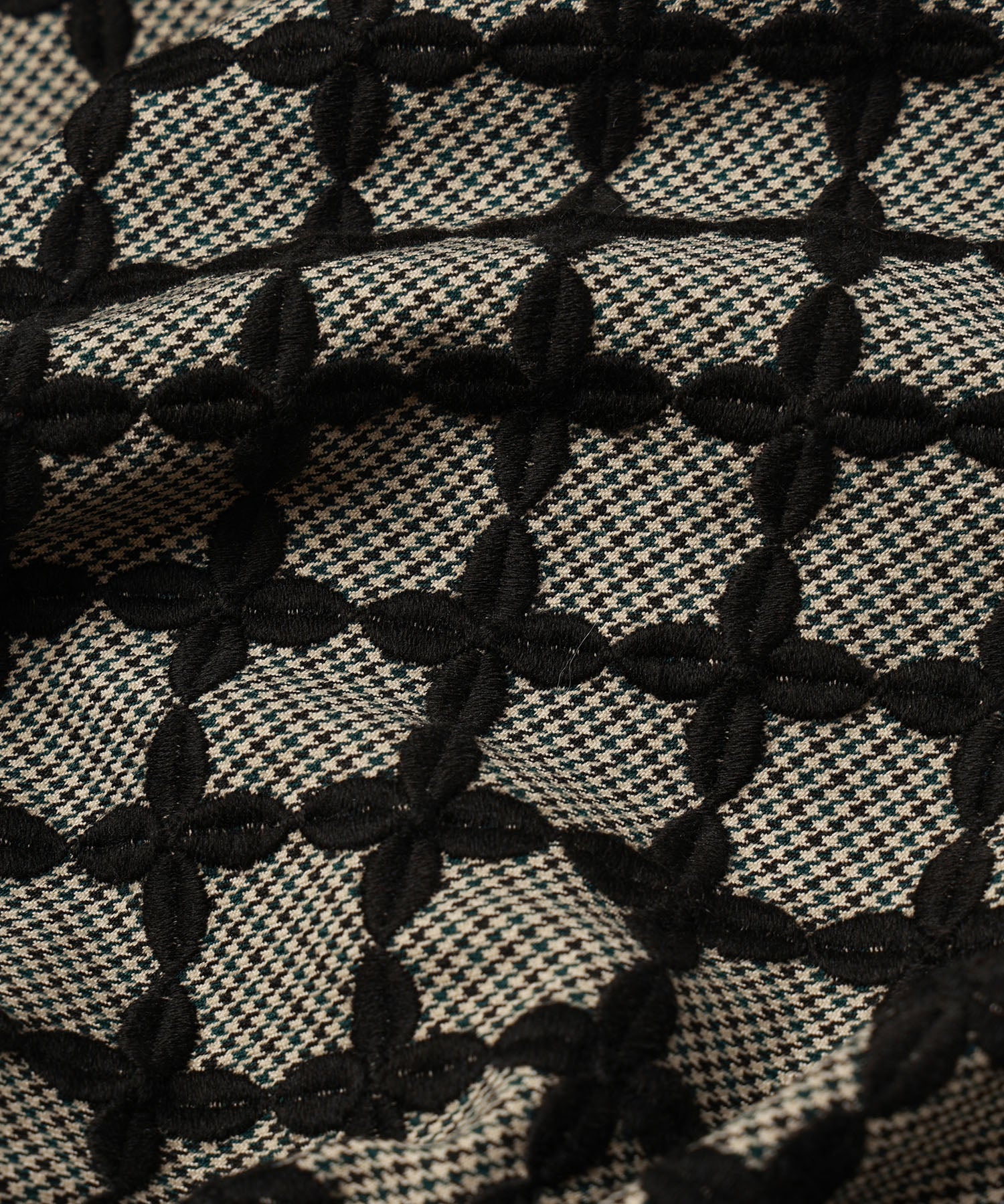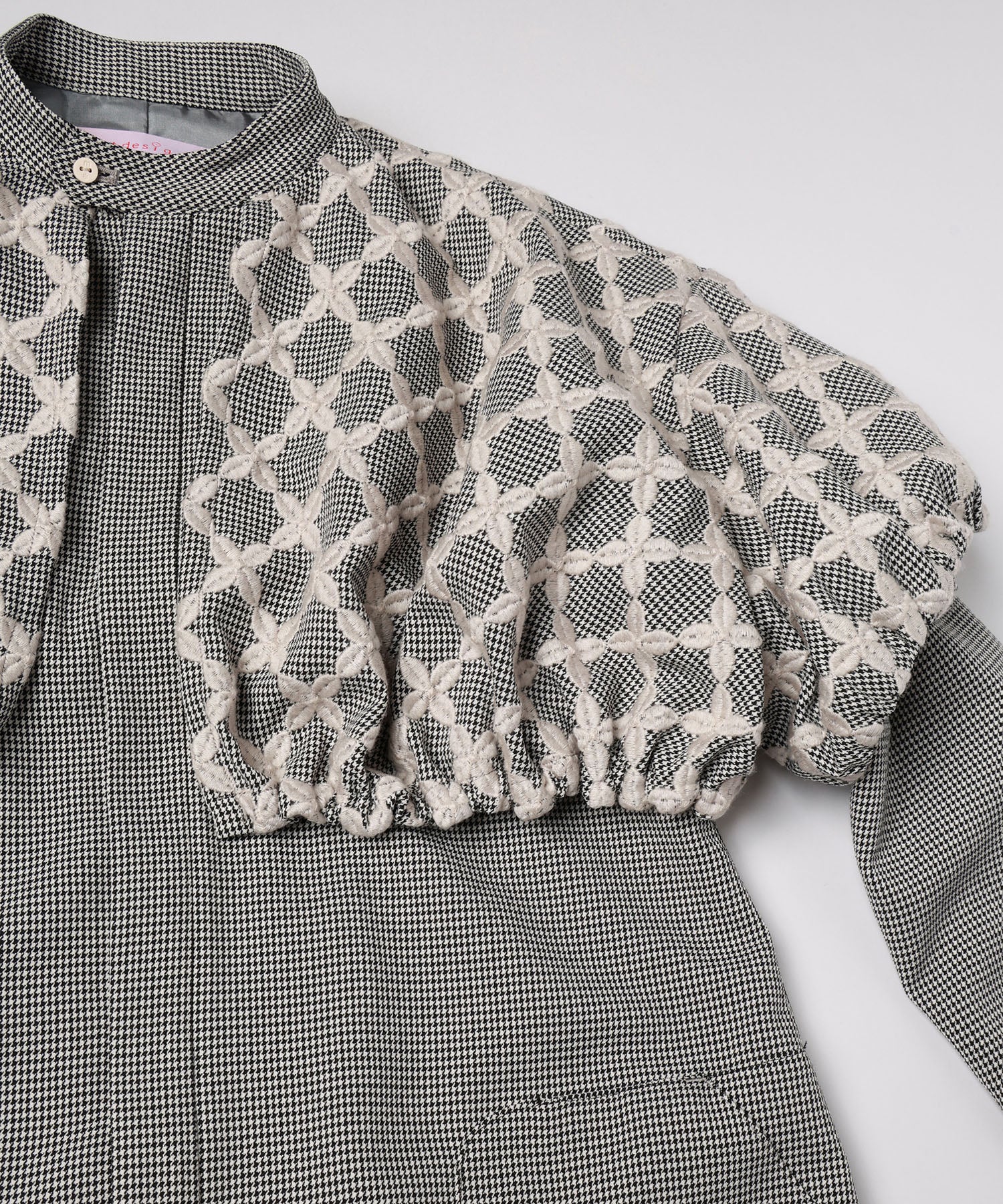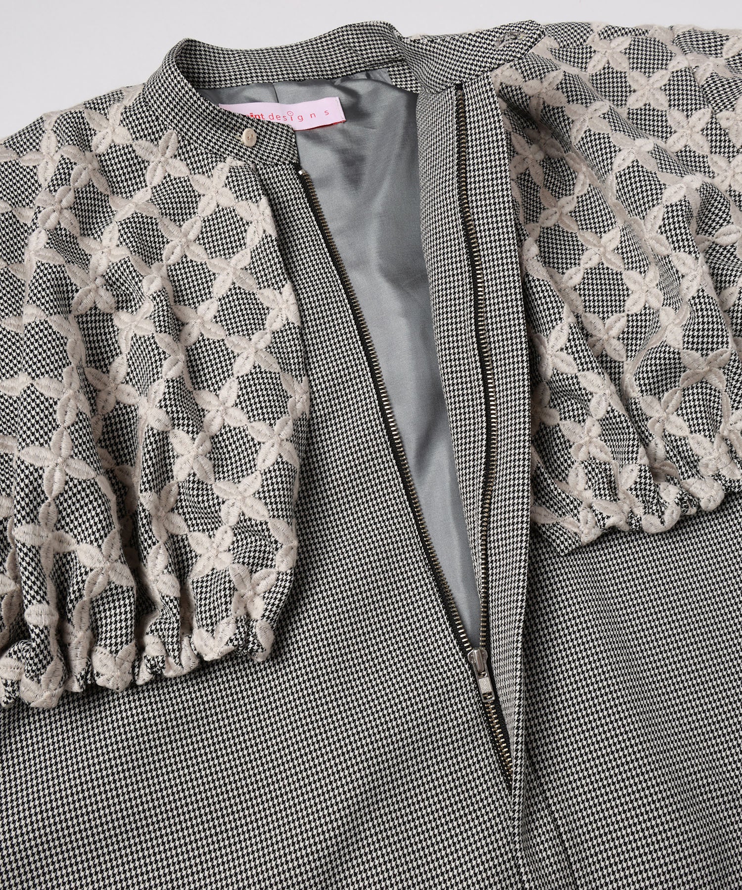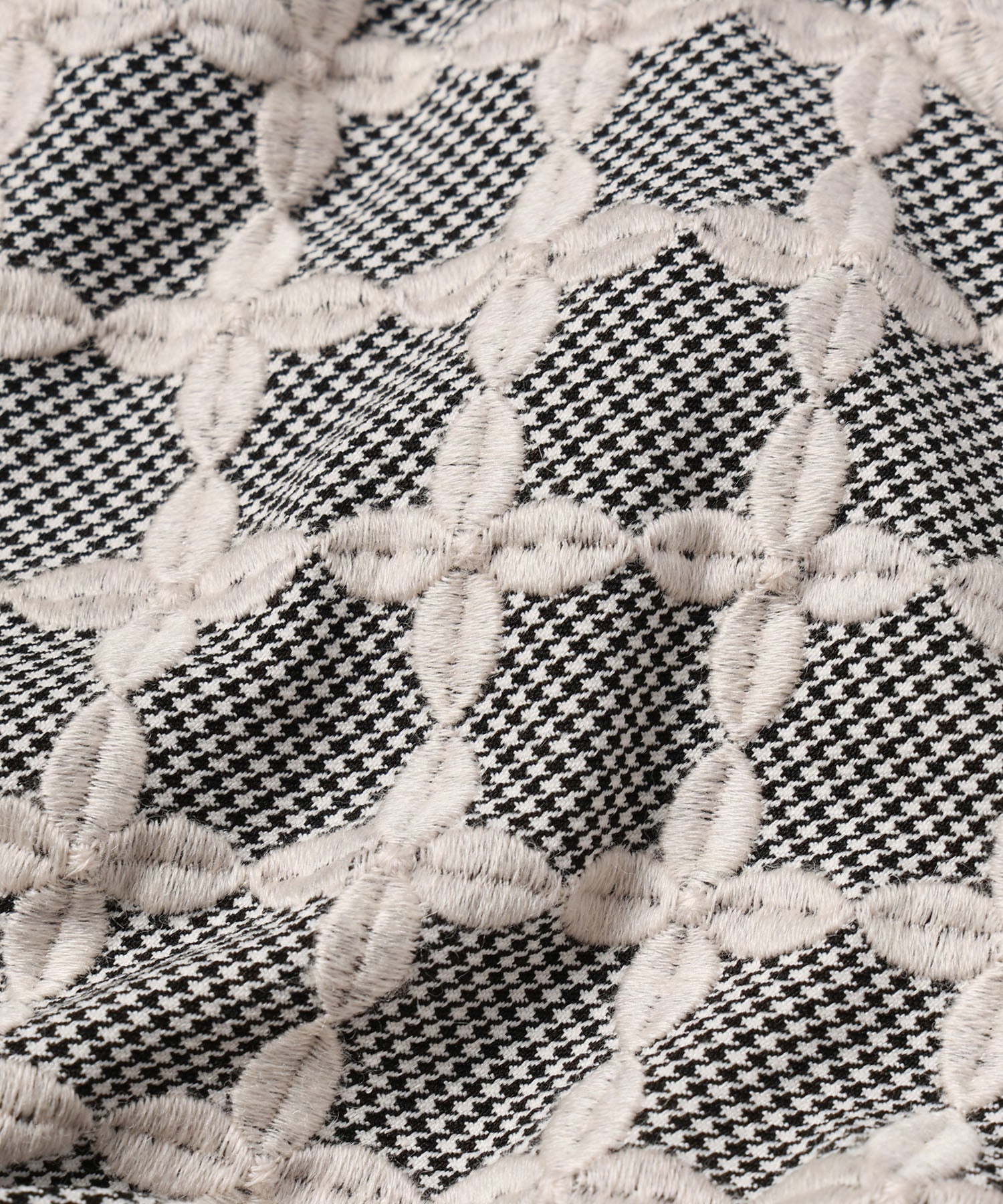 千鳥チェック柄の生地の上からクロス柄をオーバー刺繍しています。