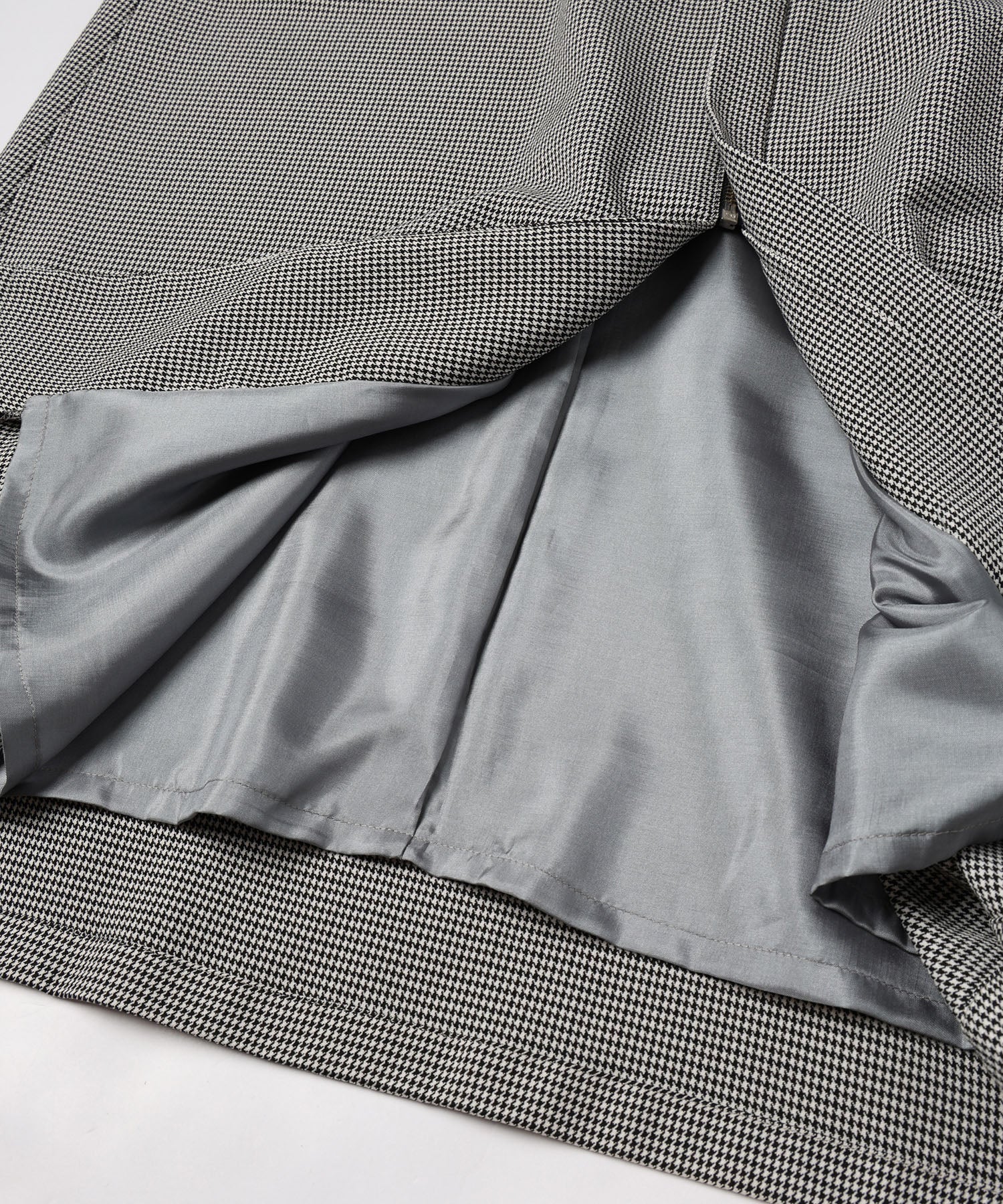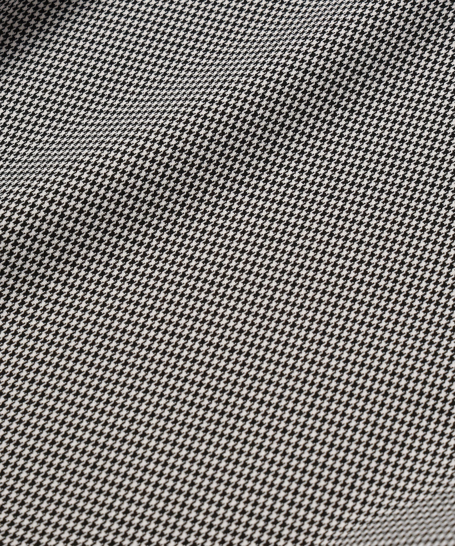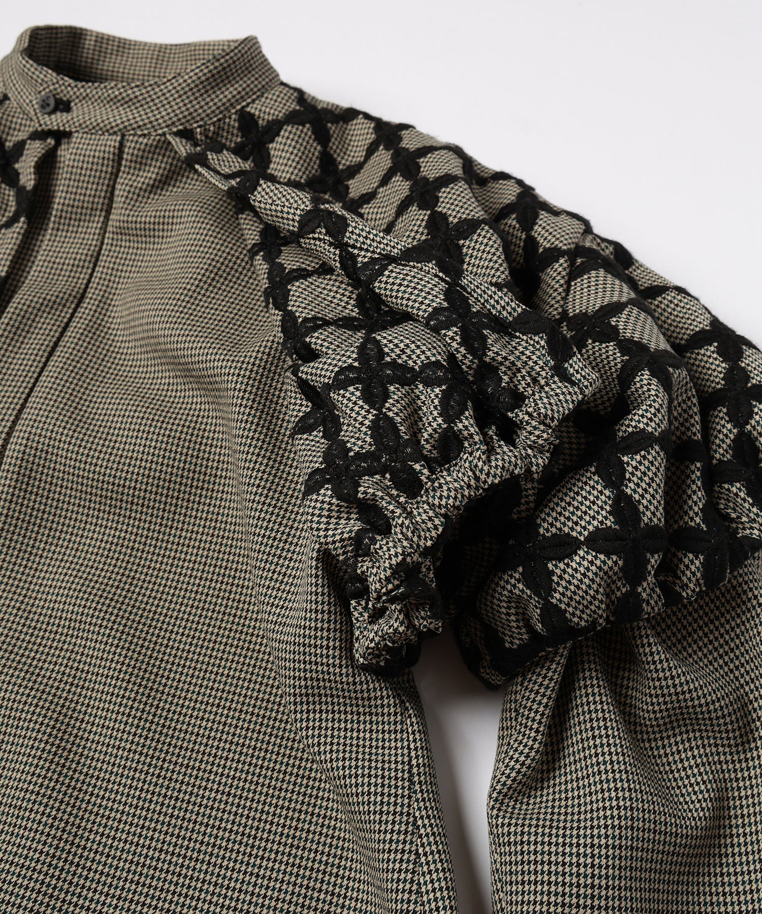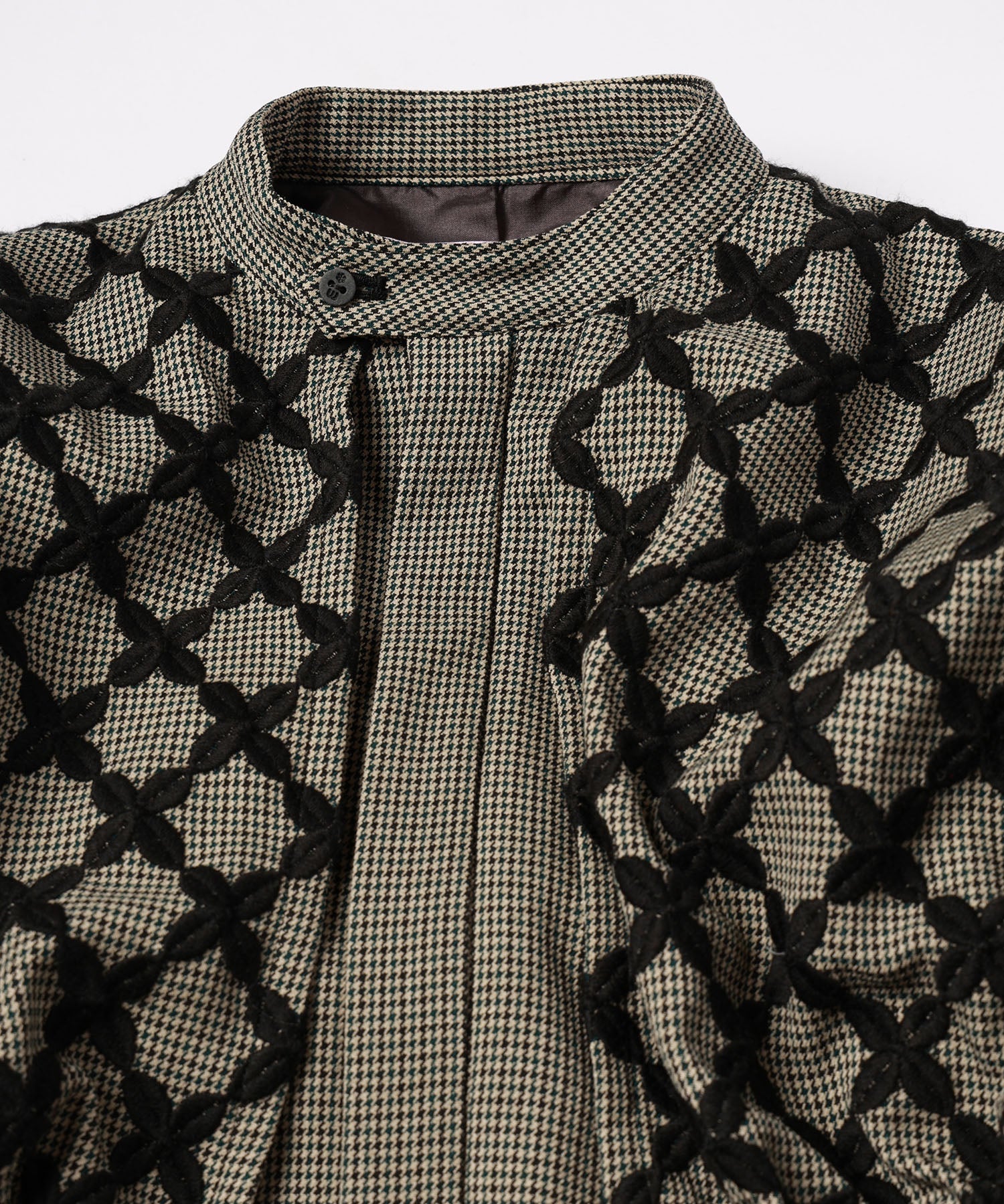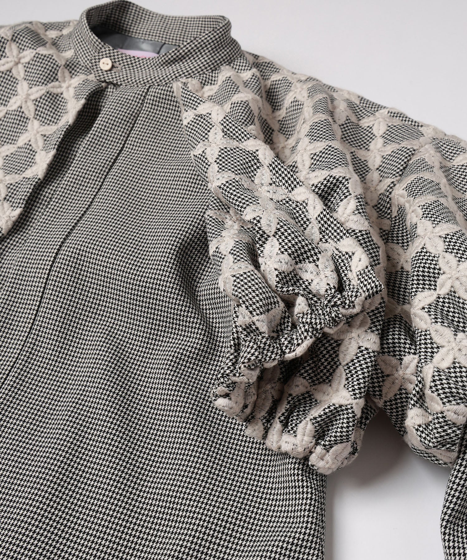 千鳥チェック柄の生地の上からクロス柄をオーバー刺繍しています。