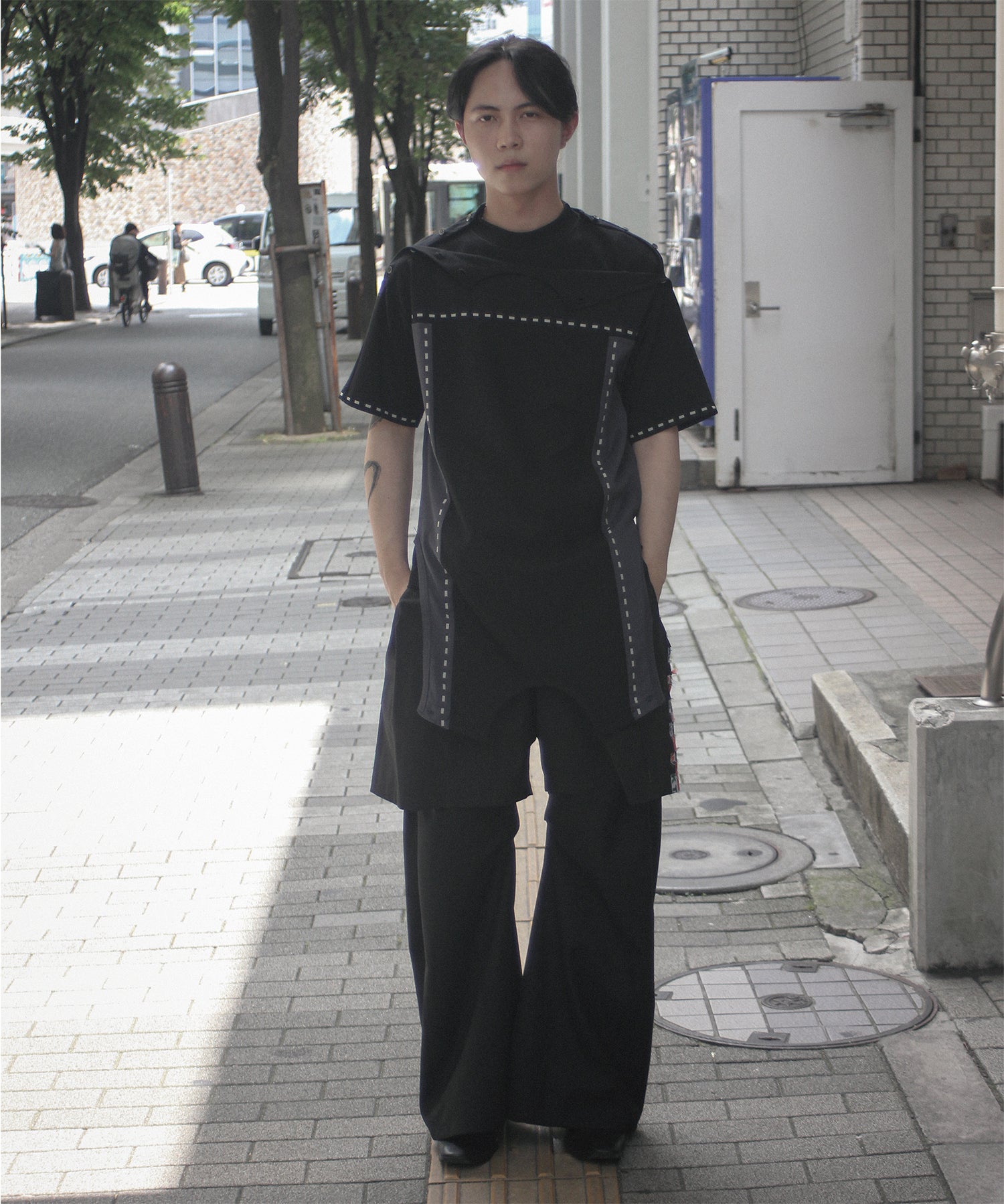 2つのアイテムを融合させた服を中心に、それぞれ別の着方を持ち、大きくフォルムが変化する仕掛けを閉じ込めています。