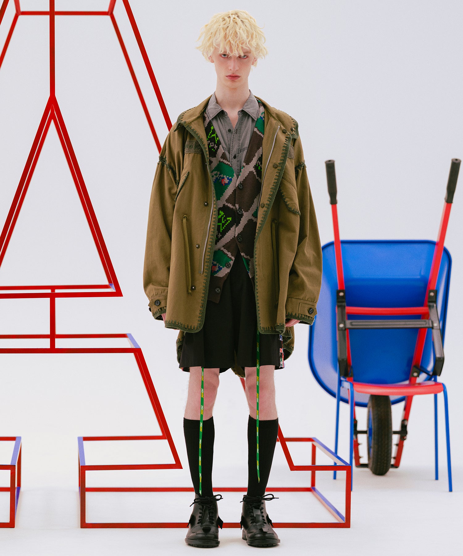 2つのアイテムを融合させた服を中心に、それぞれ別の着方を持ち、大きくフォルムが変化する仕掛けを閉じ込めています。