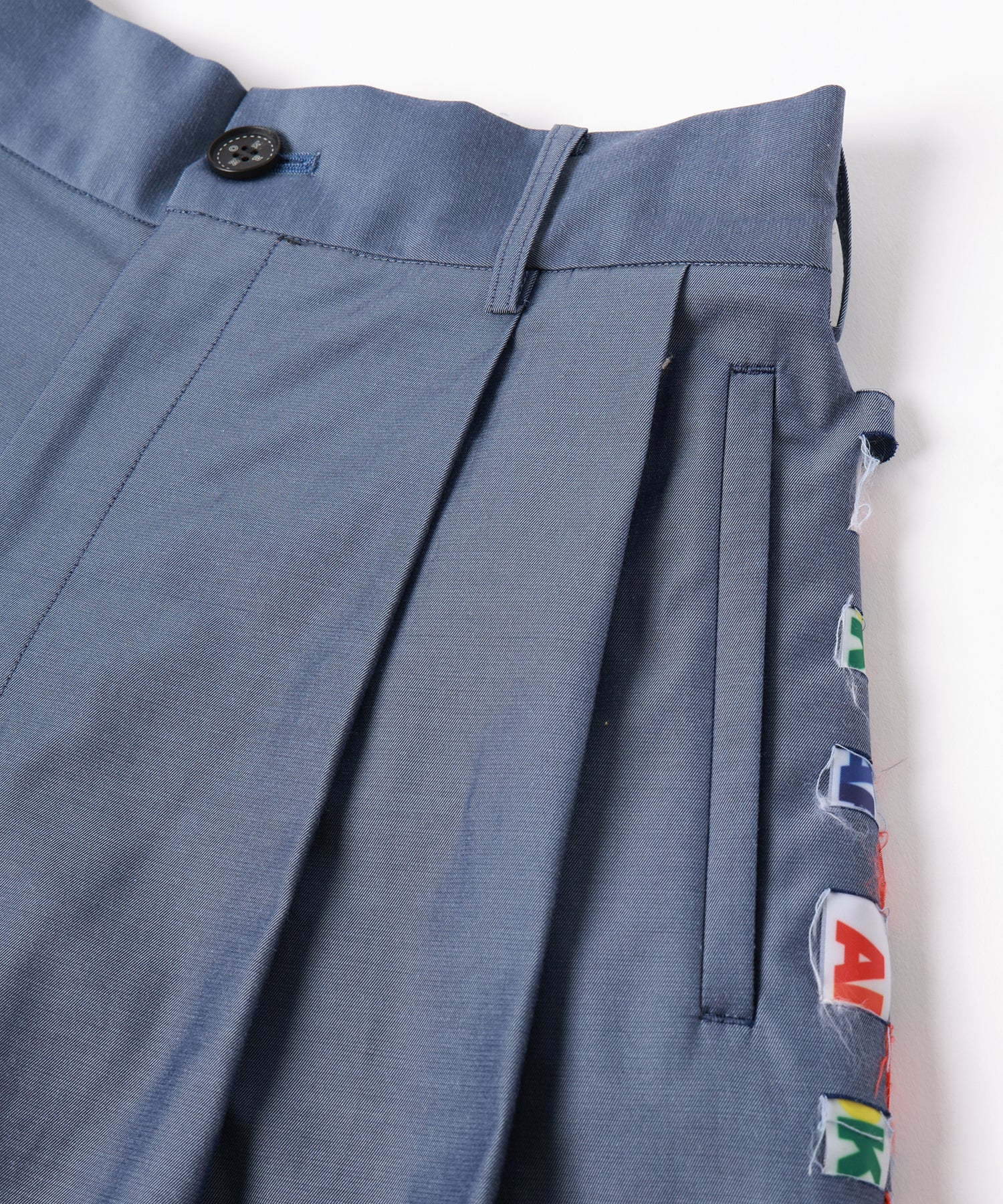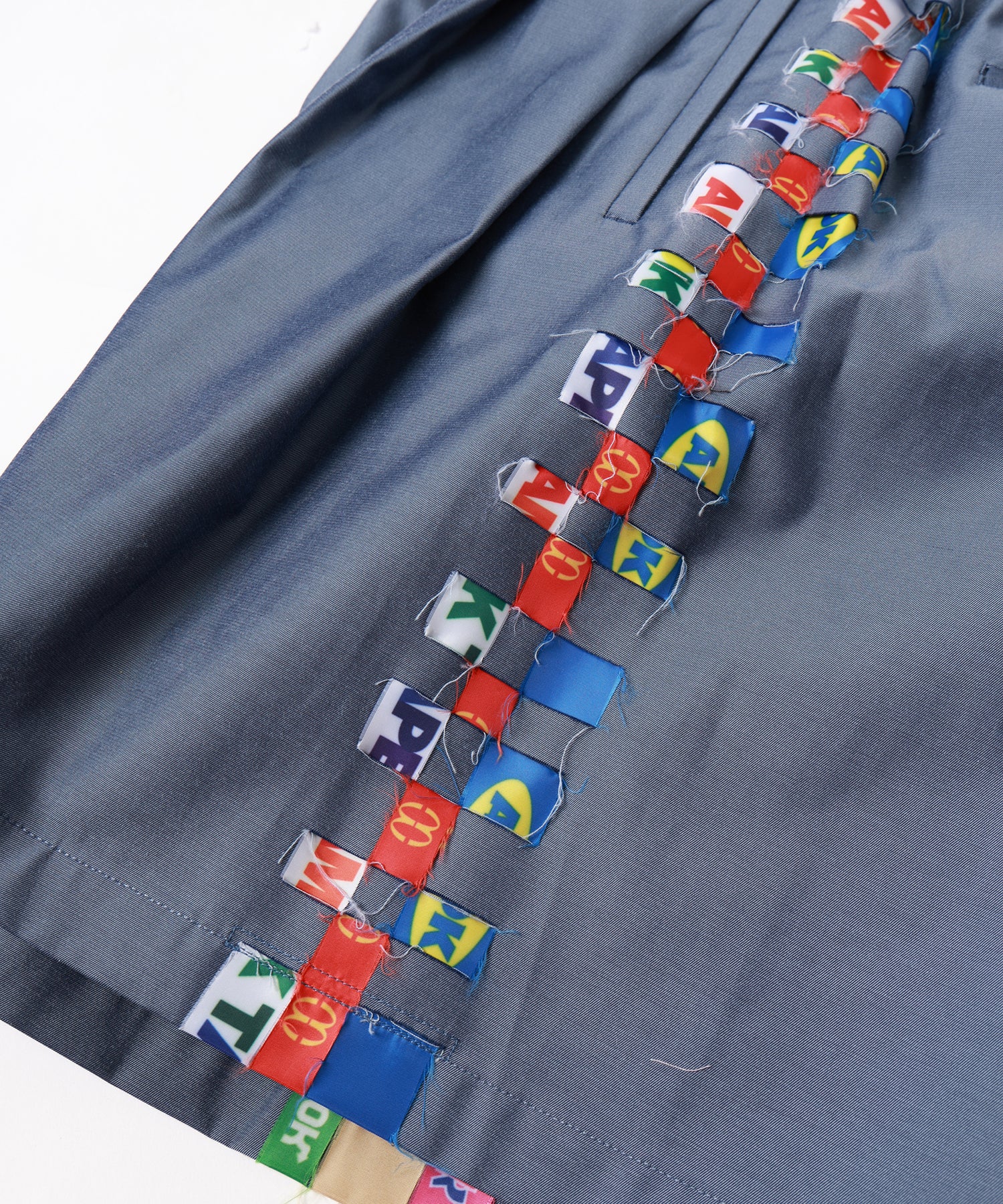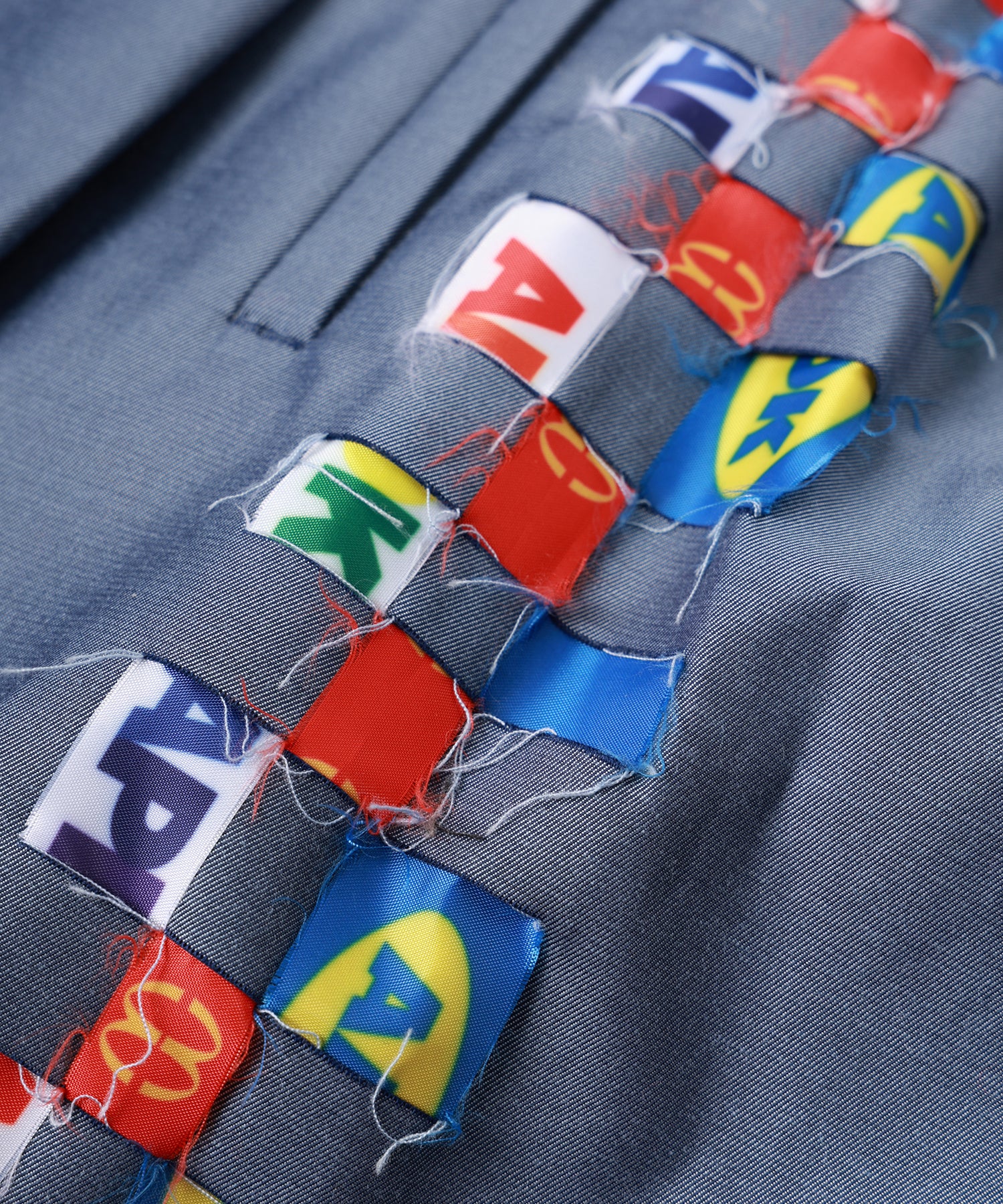 6種類のオリジナルロゴテープを1点ずつ手作業で織り込む裂き織りで脇にデザインを施しました。