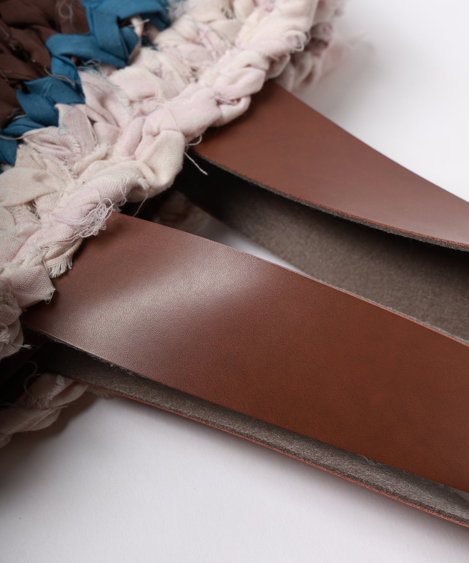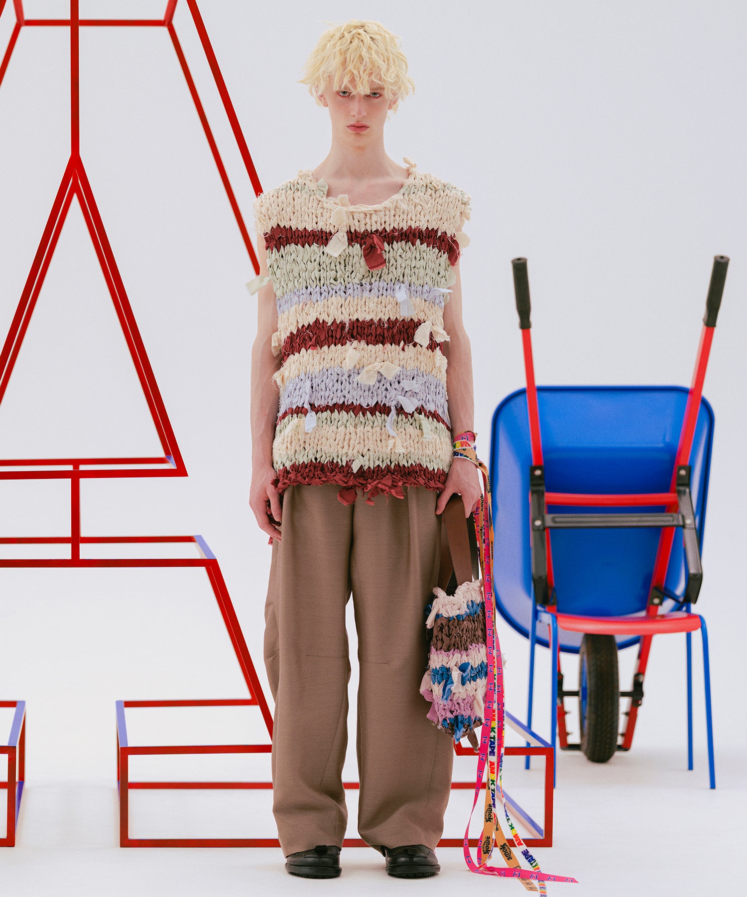 1点ずつ生地を裂いてボーダーに編み込んだ糸のほつれもデザインの一部として成立させました。