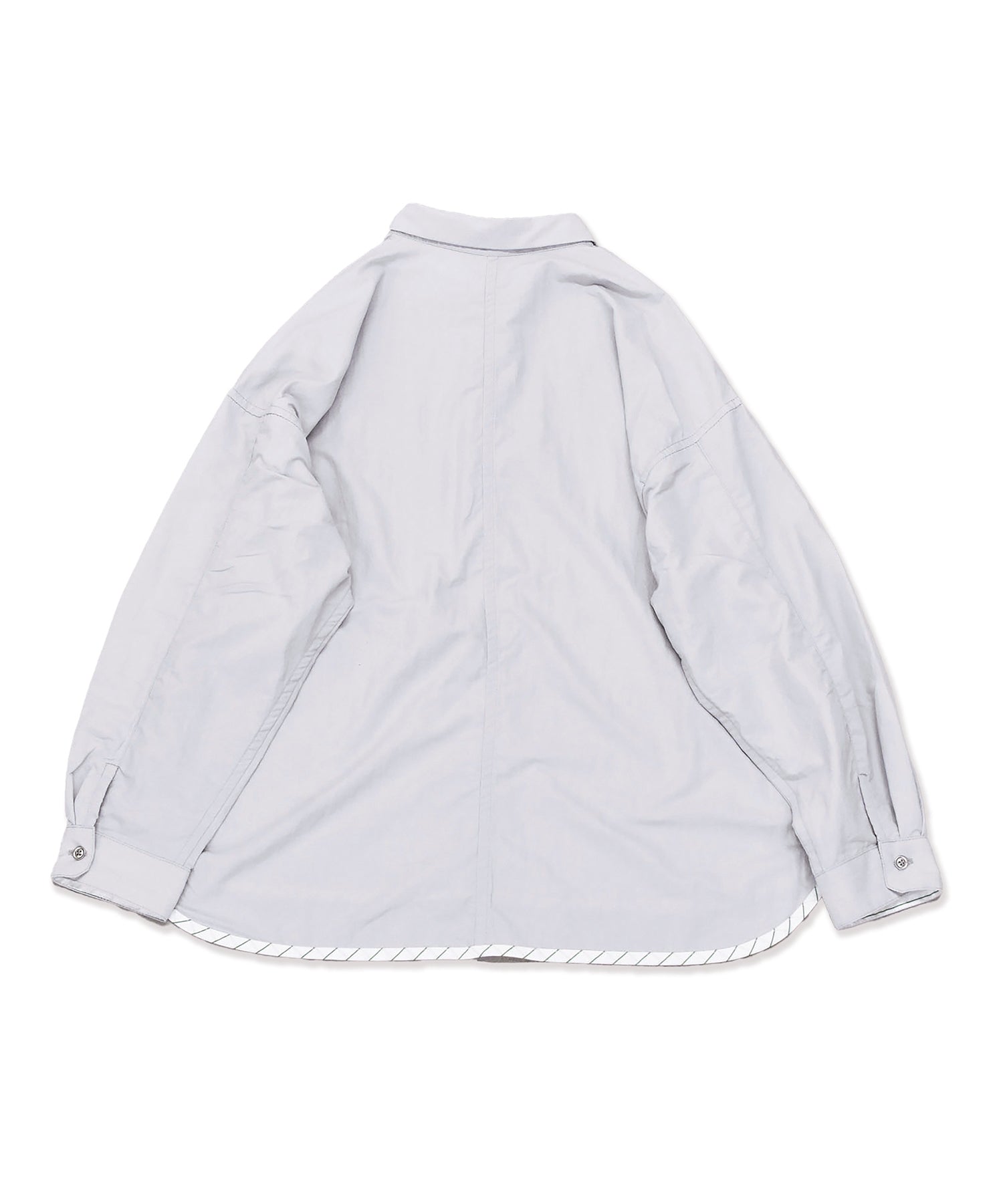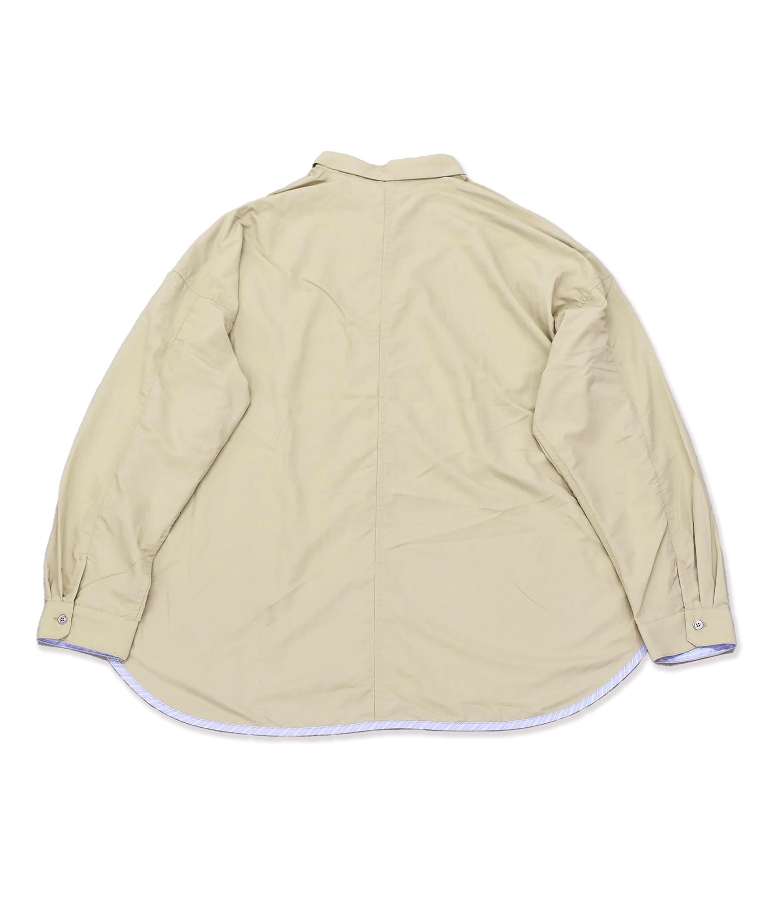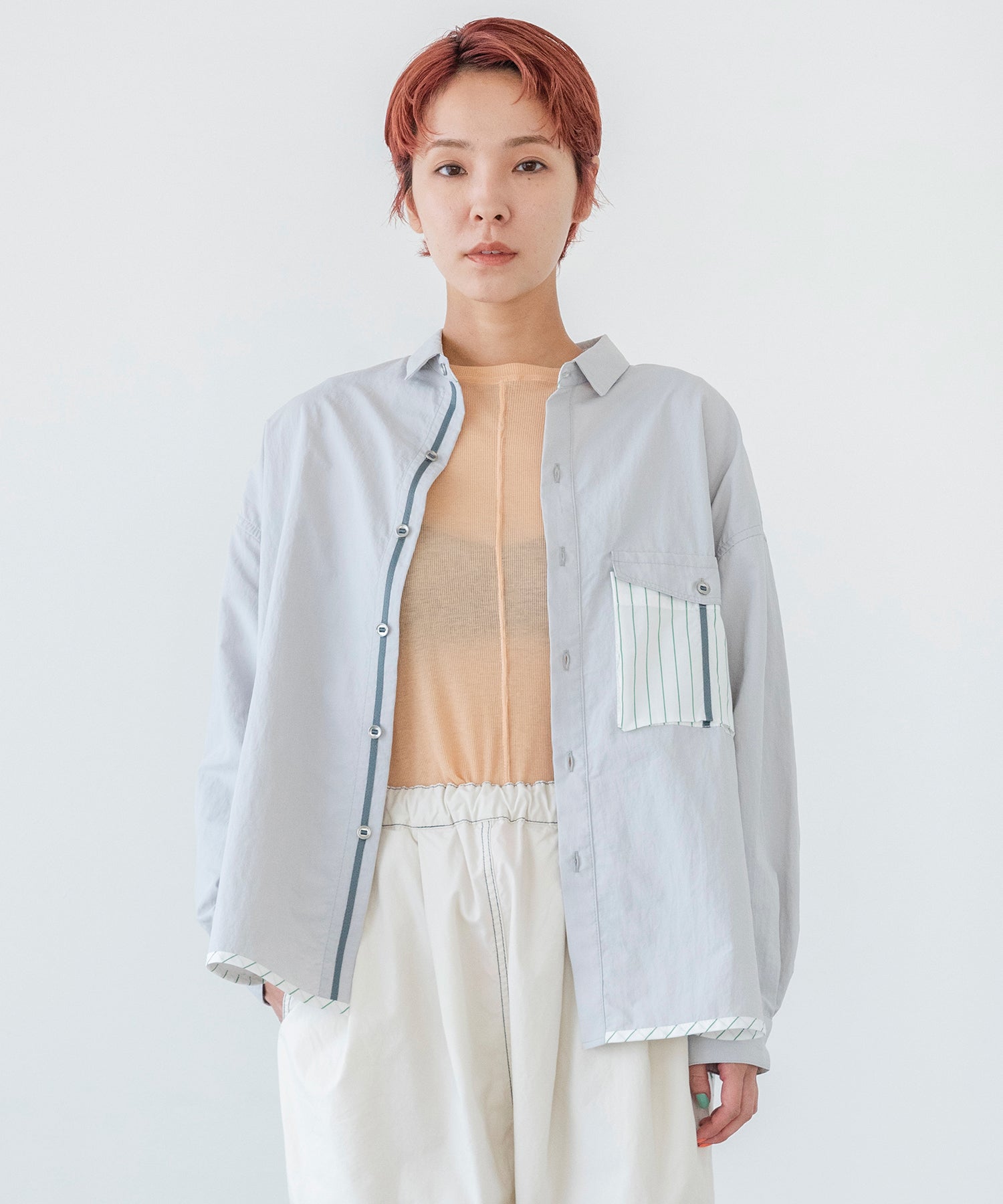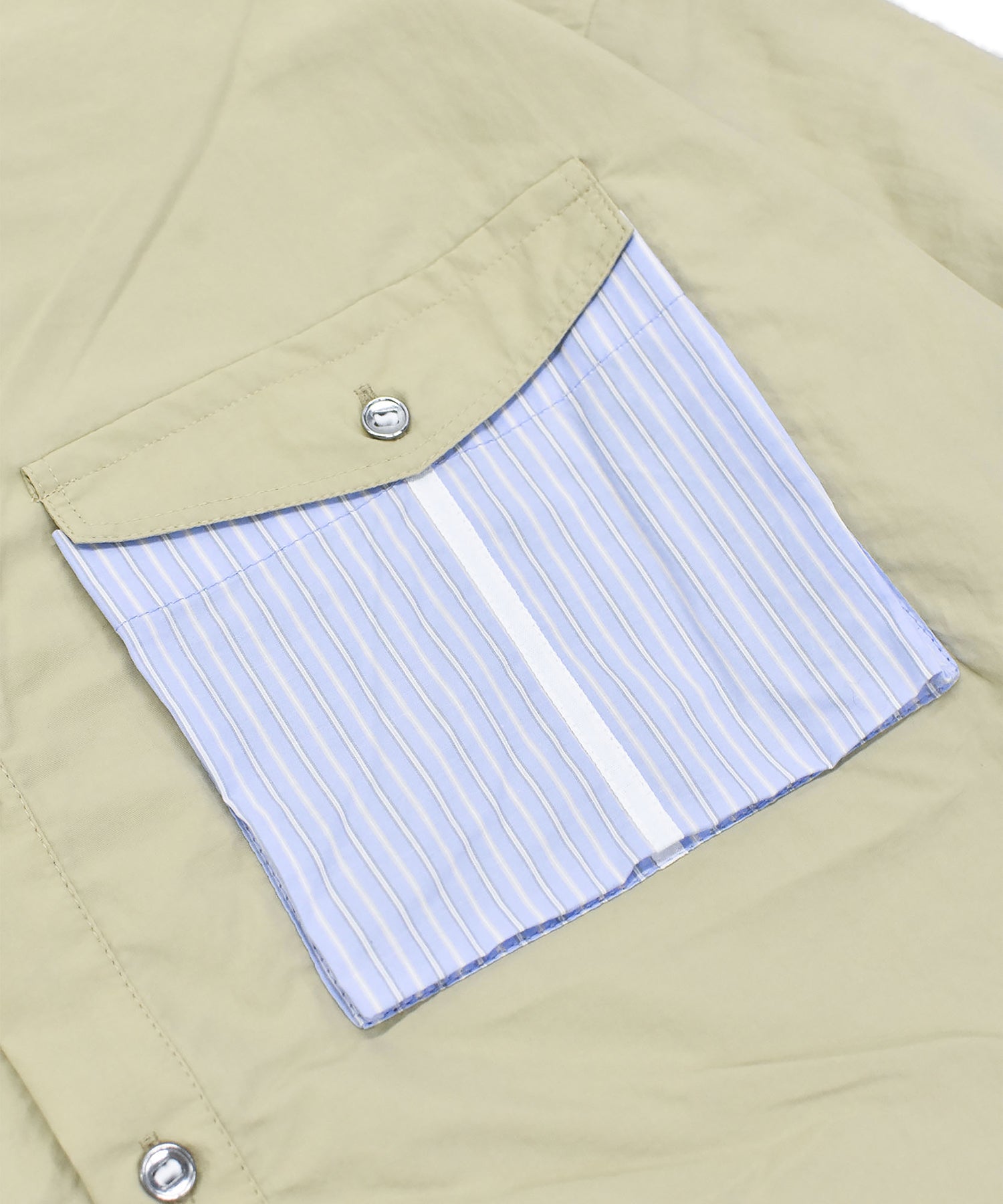 ポケットと裾に散りばめられたストライプ生地と、テープとテープに通ったパラシュートボタンがポイントのシャツ。