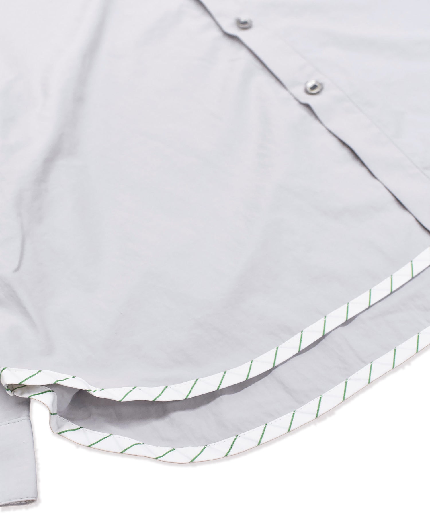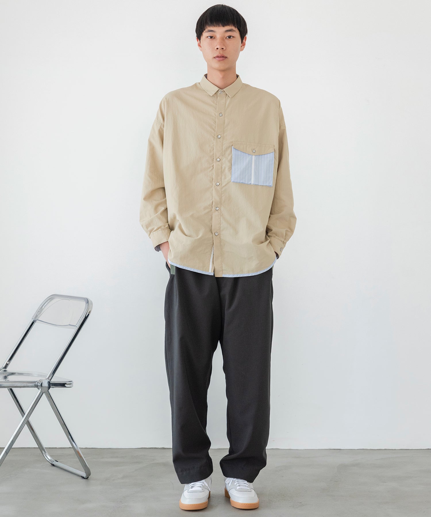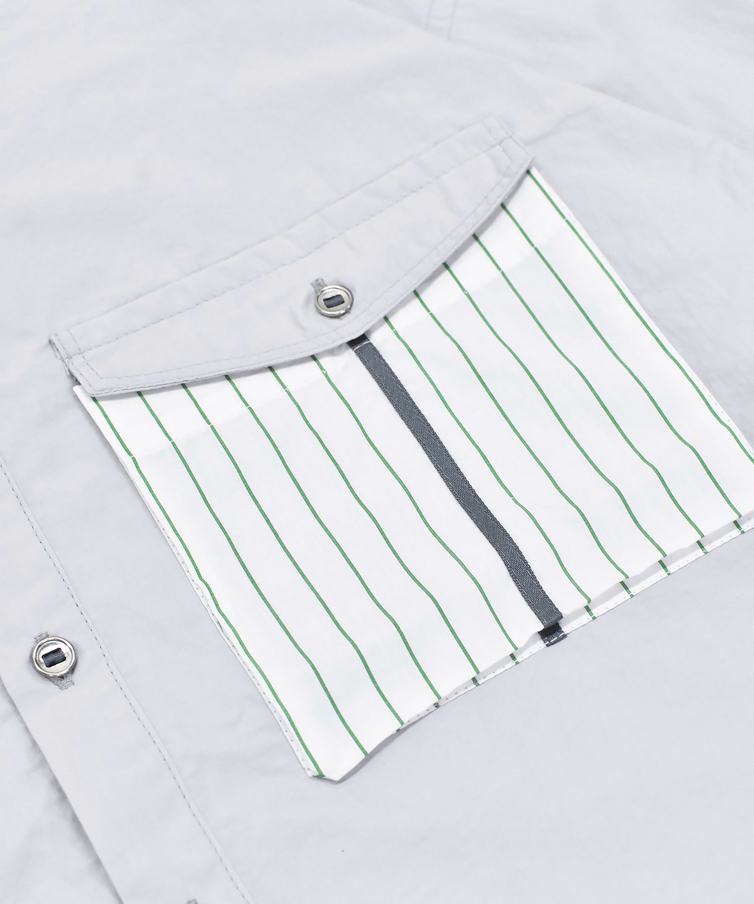 ポケットと裾に散りばめられたストライプ生地と、テープとテープに通ったパラシュートボタンがポイントのシャツ。