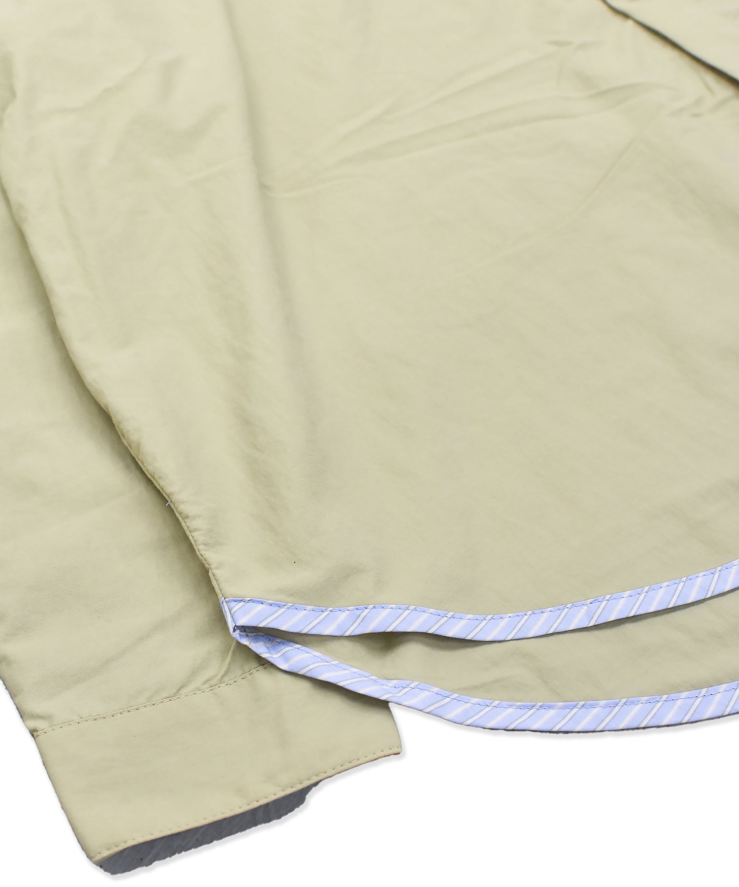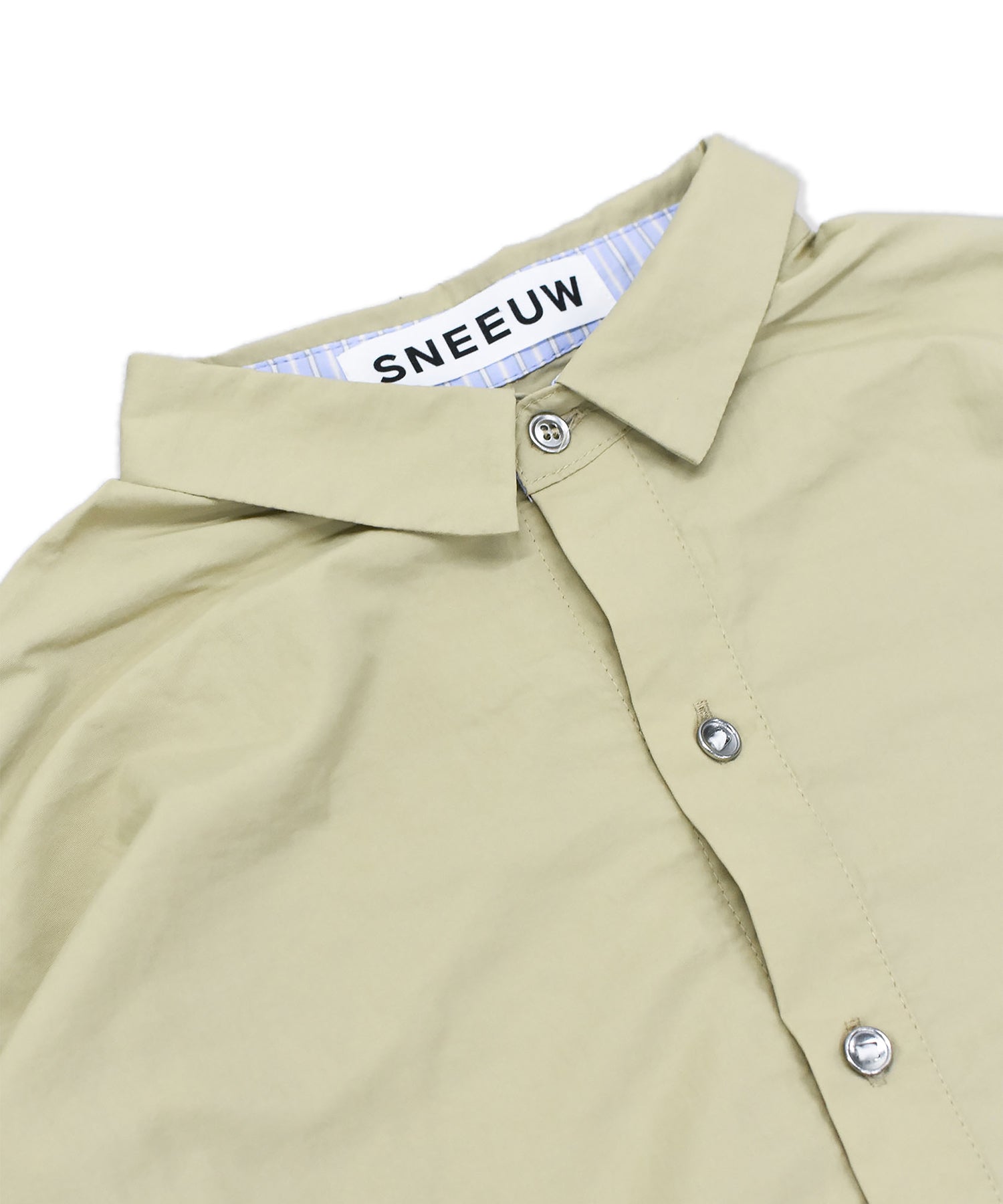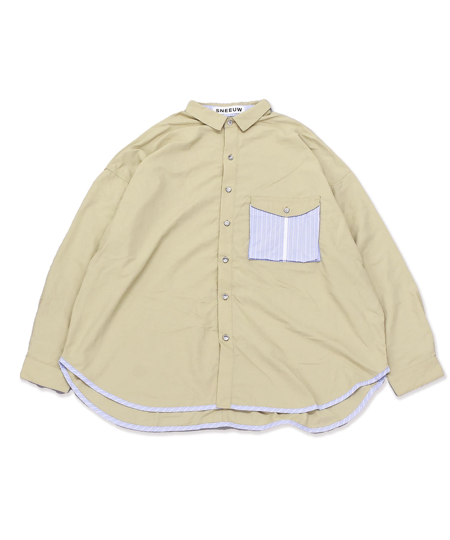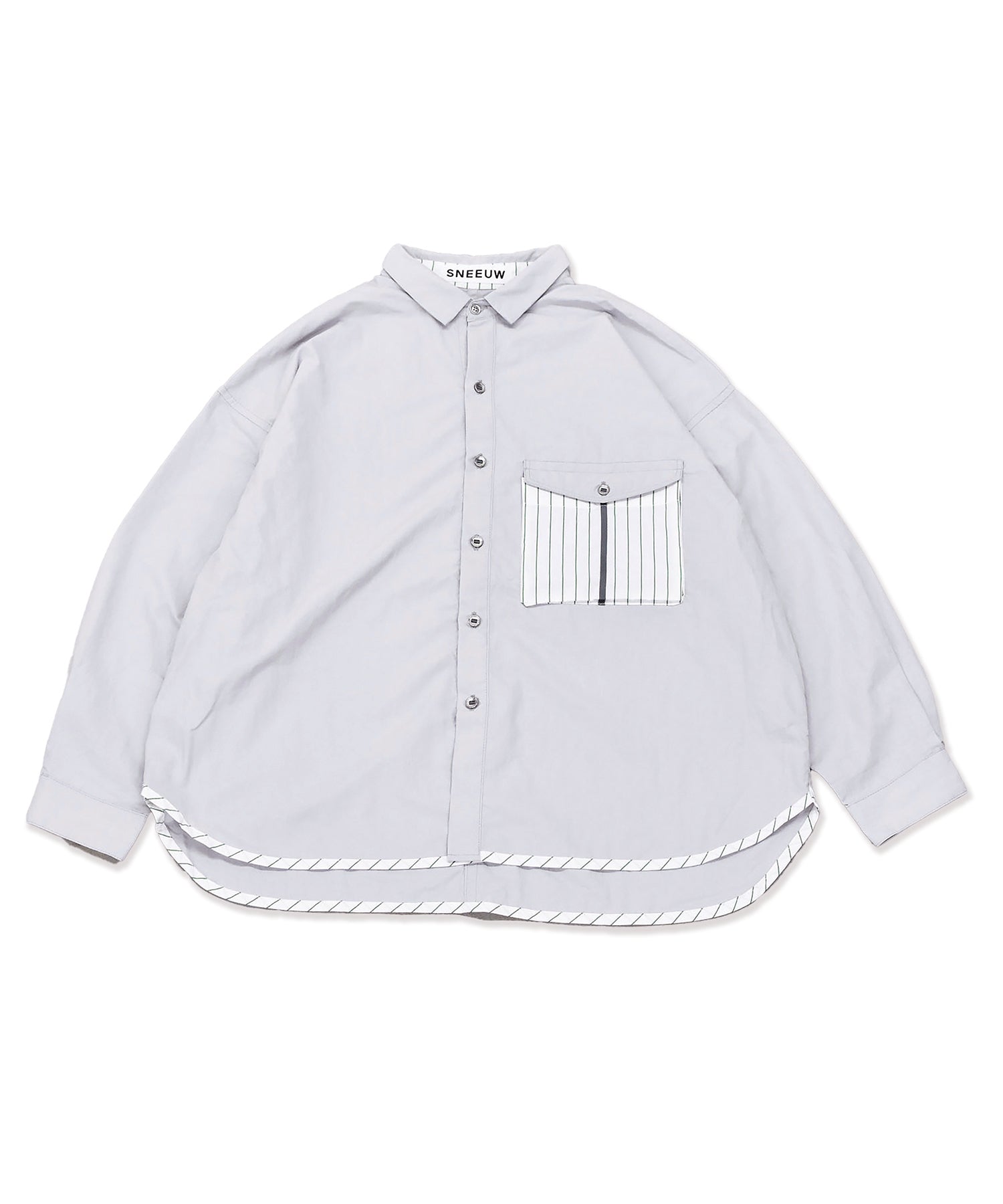 ポケットと裾に散りばめられたストライプ生地と、テープとテープに通ったパラシュートボタンがポイントのシャツ。
