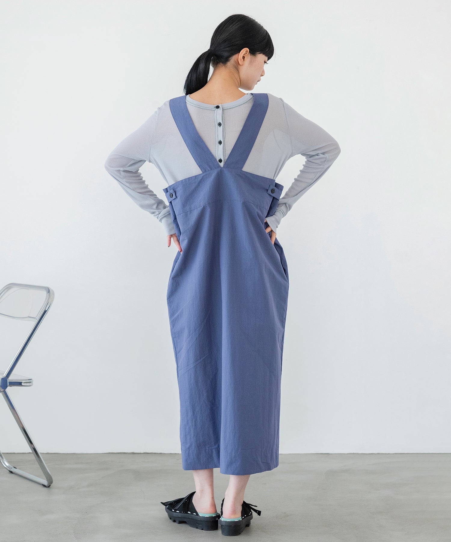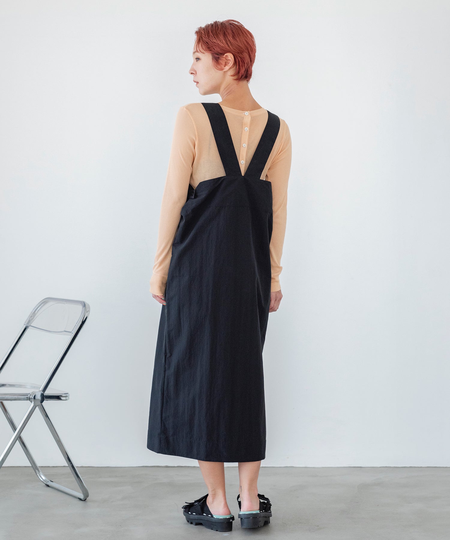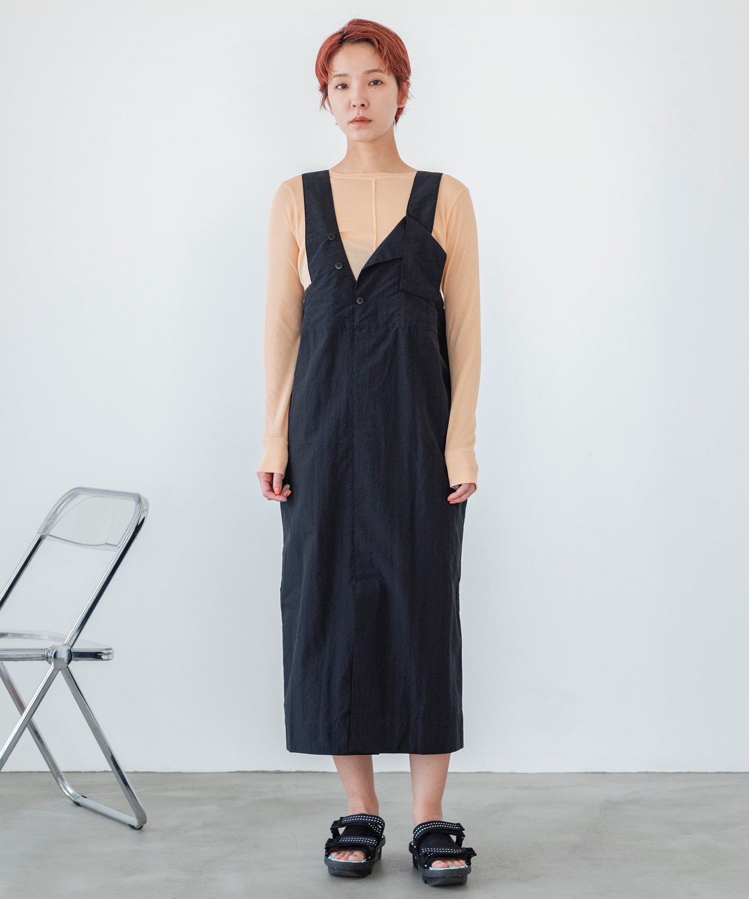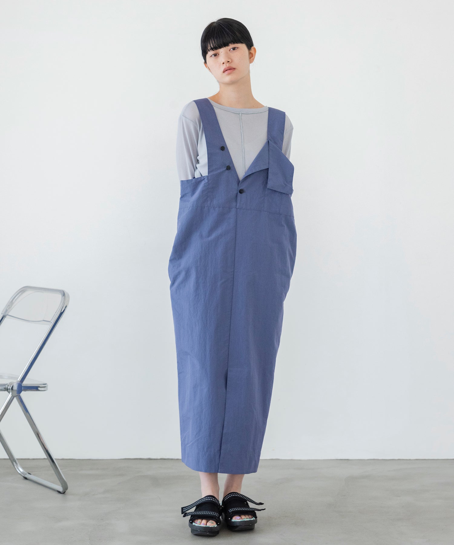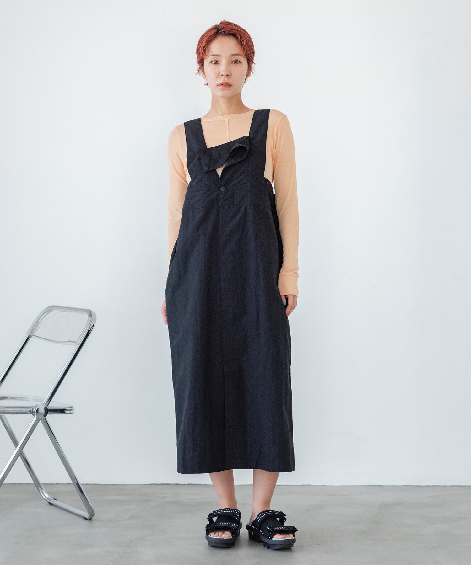 フロントのスリットとベルトのディティールが作るジグザグなフォルムがポイントのジャンパースカート。