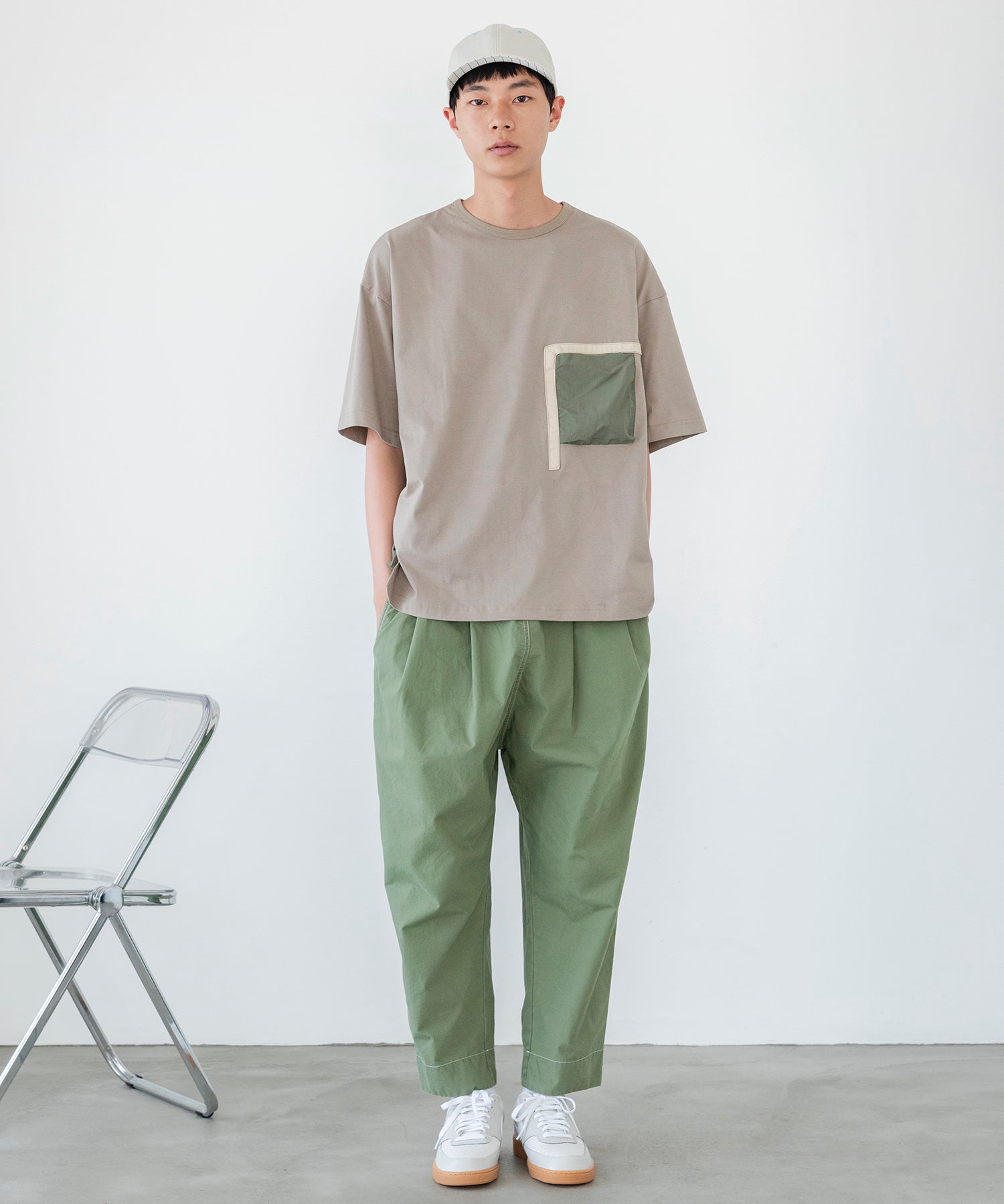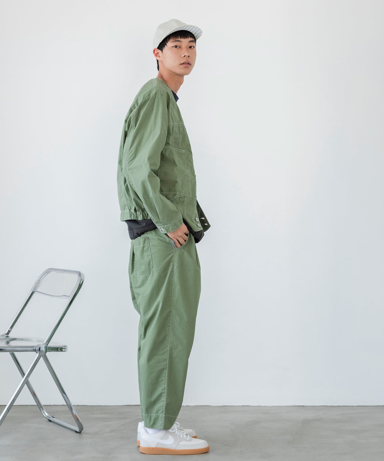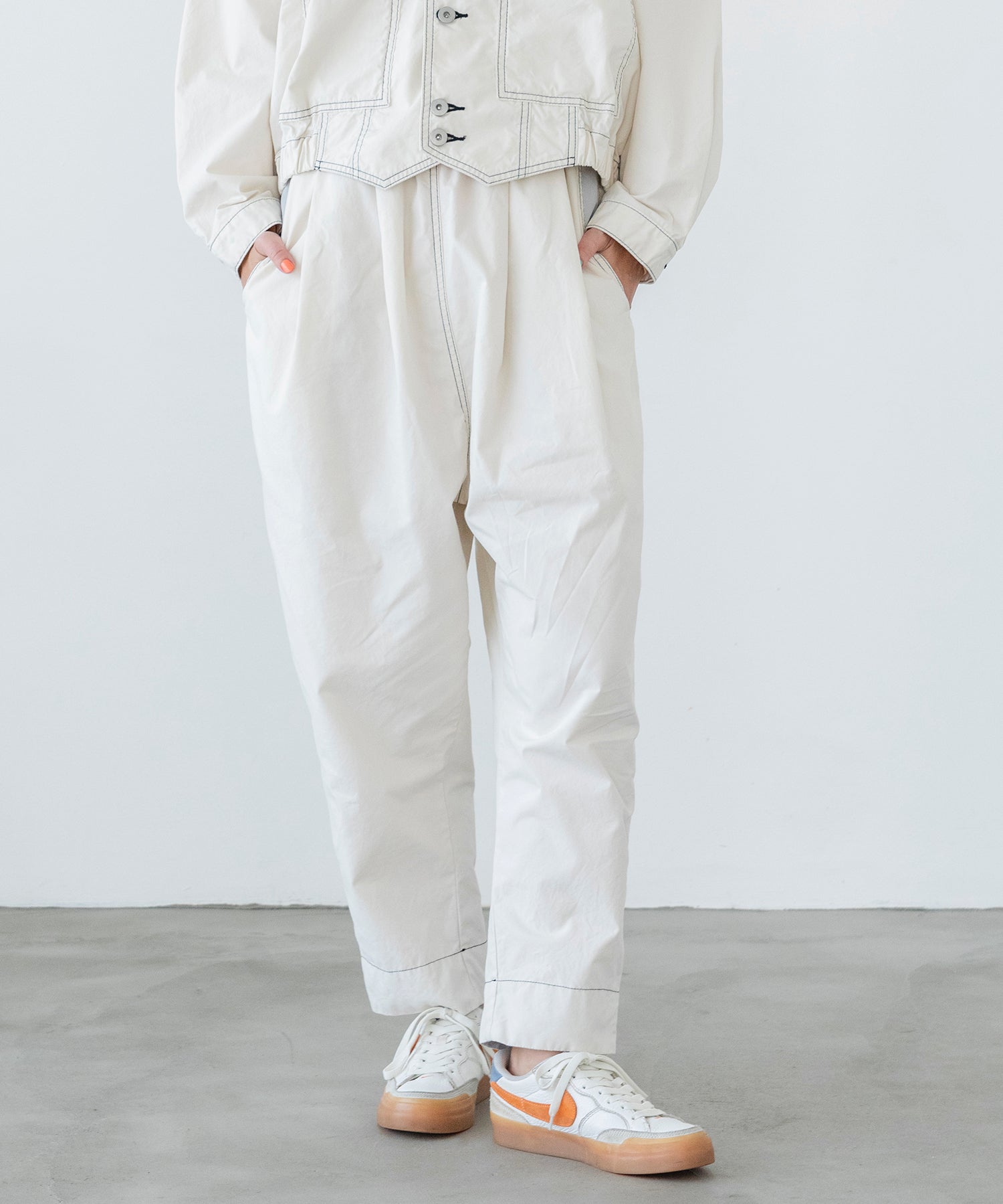 太めのテーパードシルエットでゆったりしつつ、ダボ付きすぎずすっきりした印象で履いていただけます。
