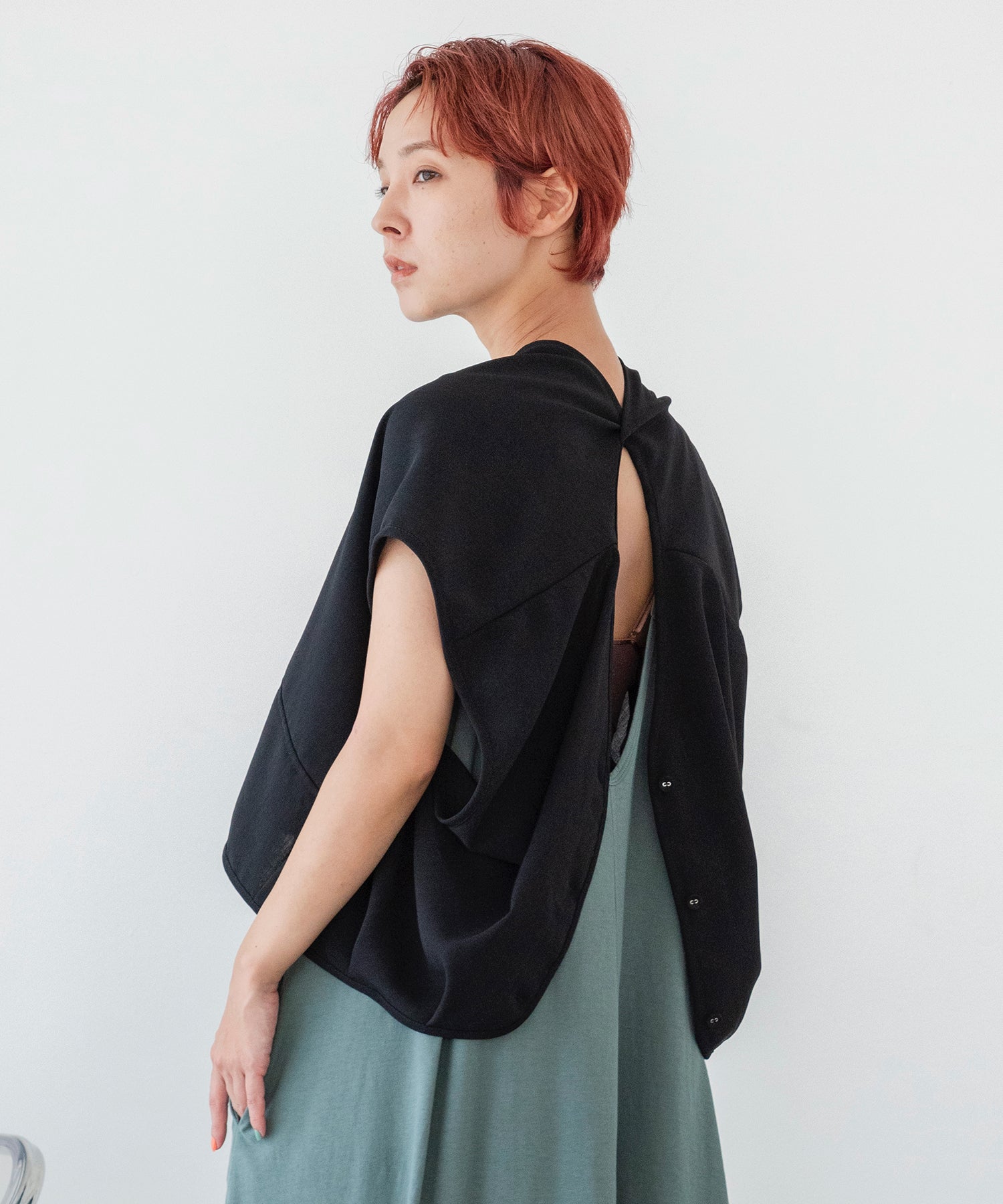 スリットから首を出すとシルエットがガラッと変わり、ドレープがきれいなプルオーバーに。前後どちらの向きでも着られます。