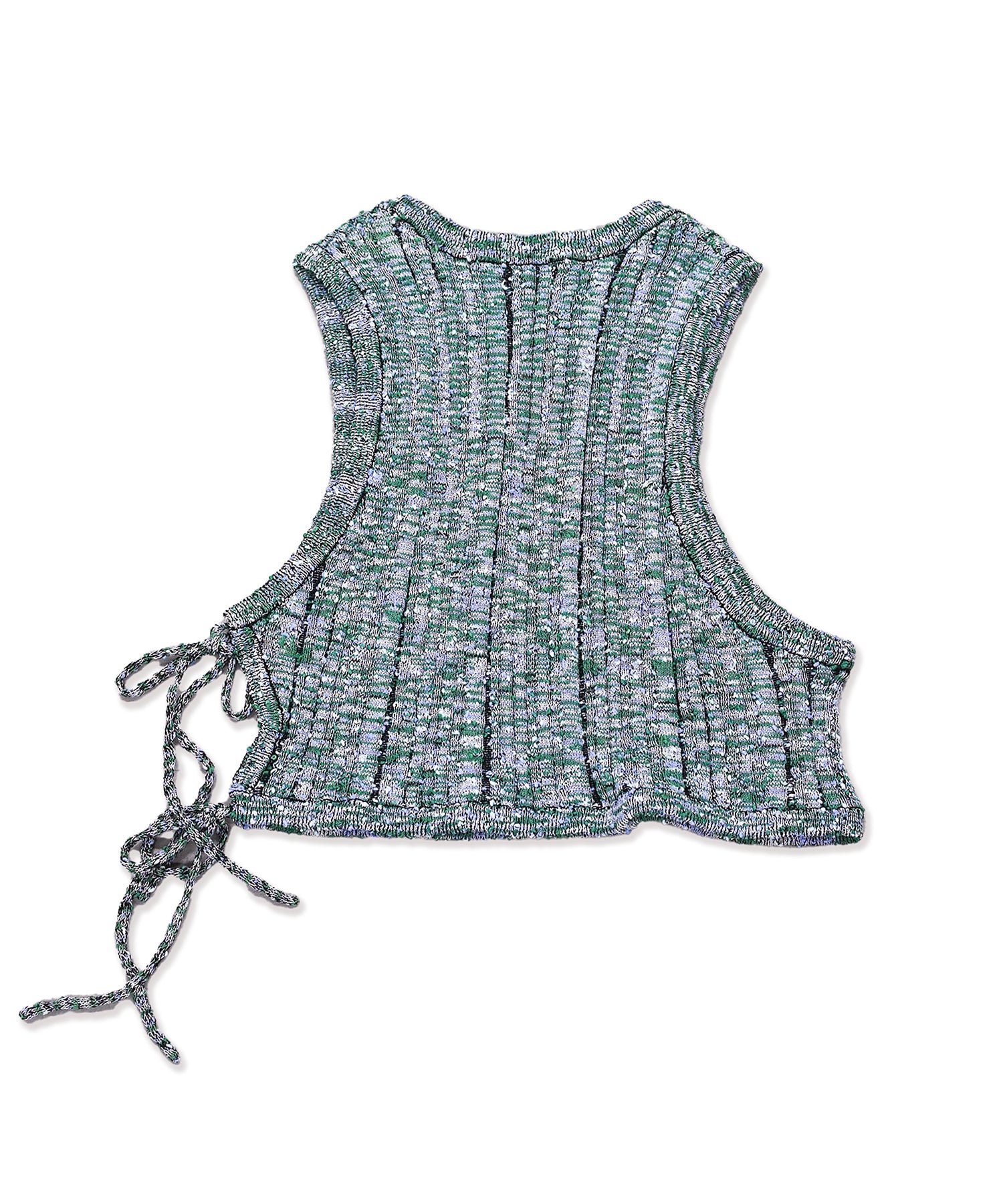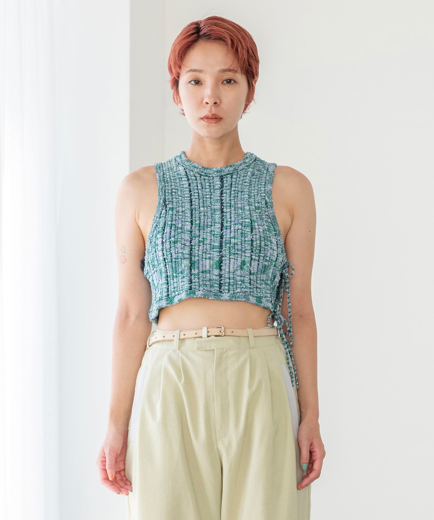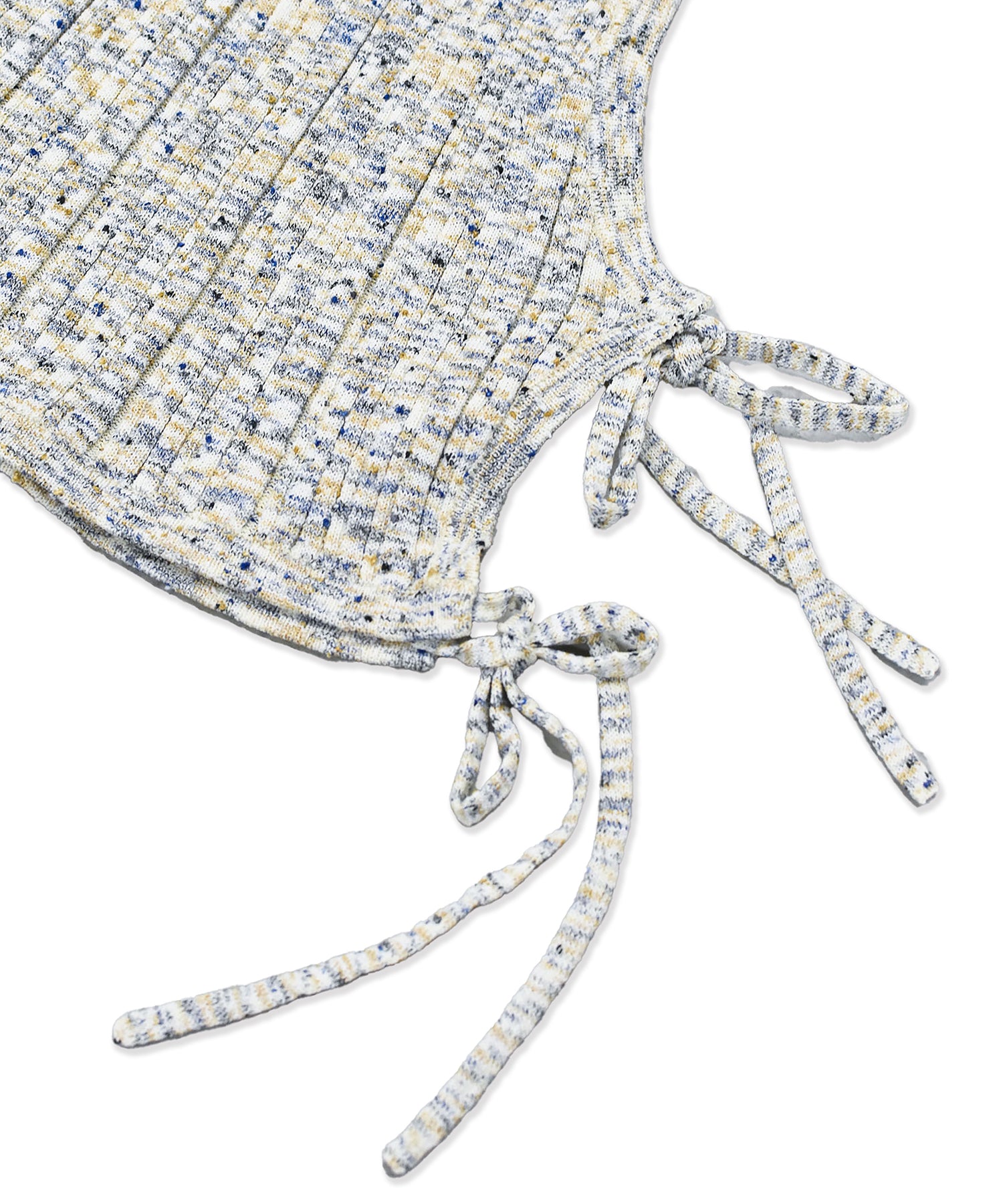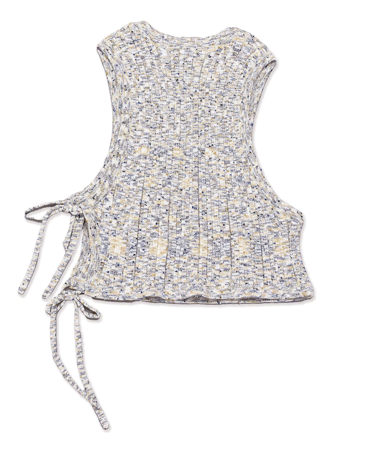 脇でこコードを結ぶ作りになっていて、カットソーやワンピースの上にレイヤードしたり、タンクトップ的にインナーとして着たりと、コーディネートのポイントにもベースにもなる一枚です。