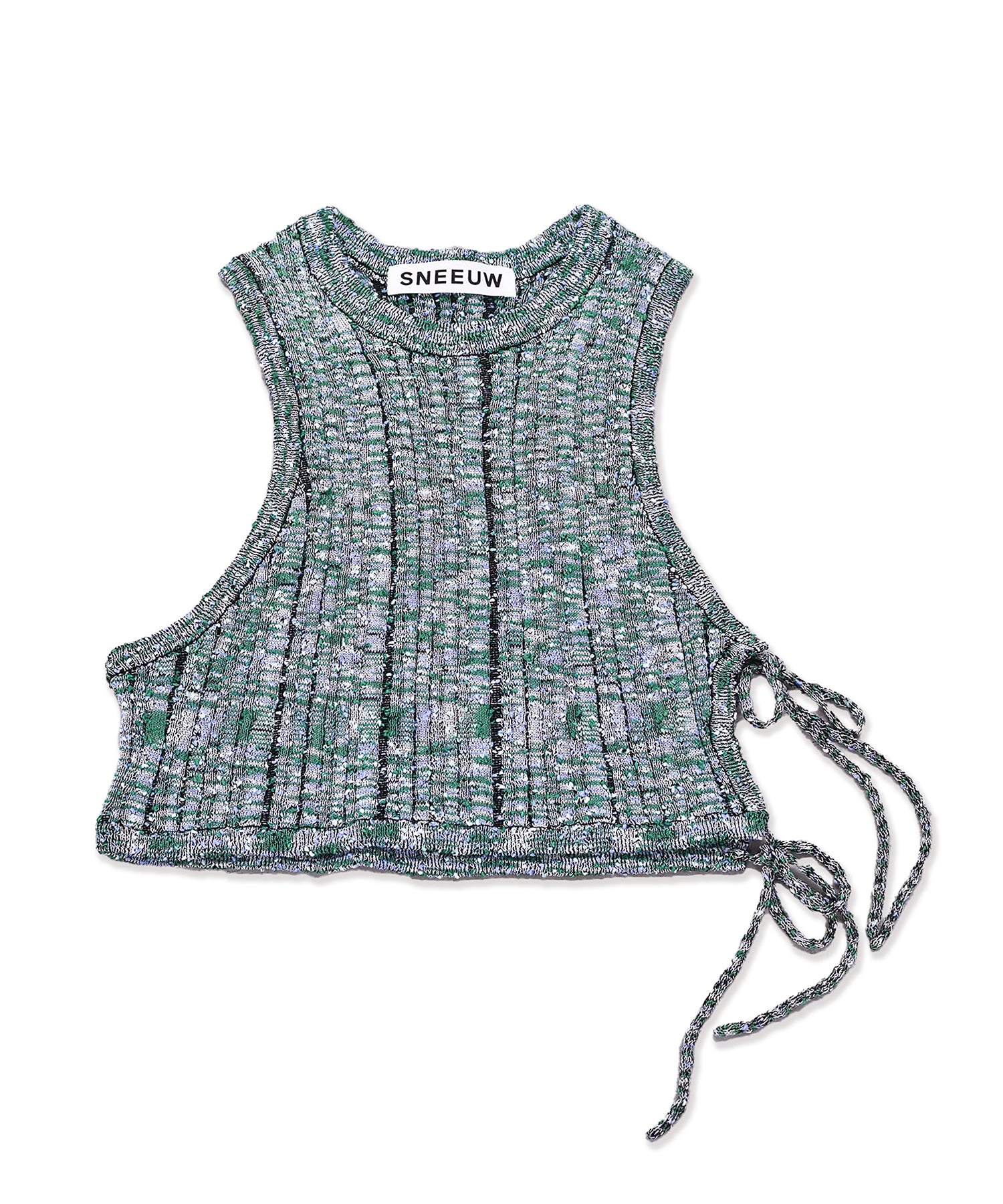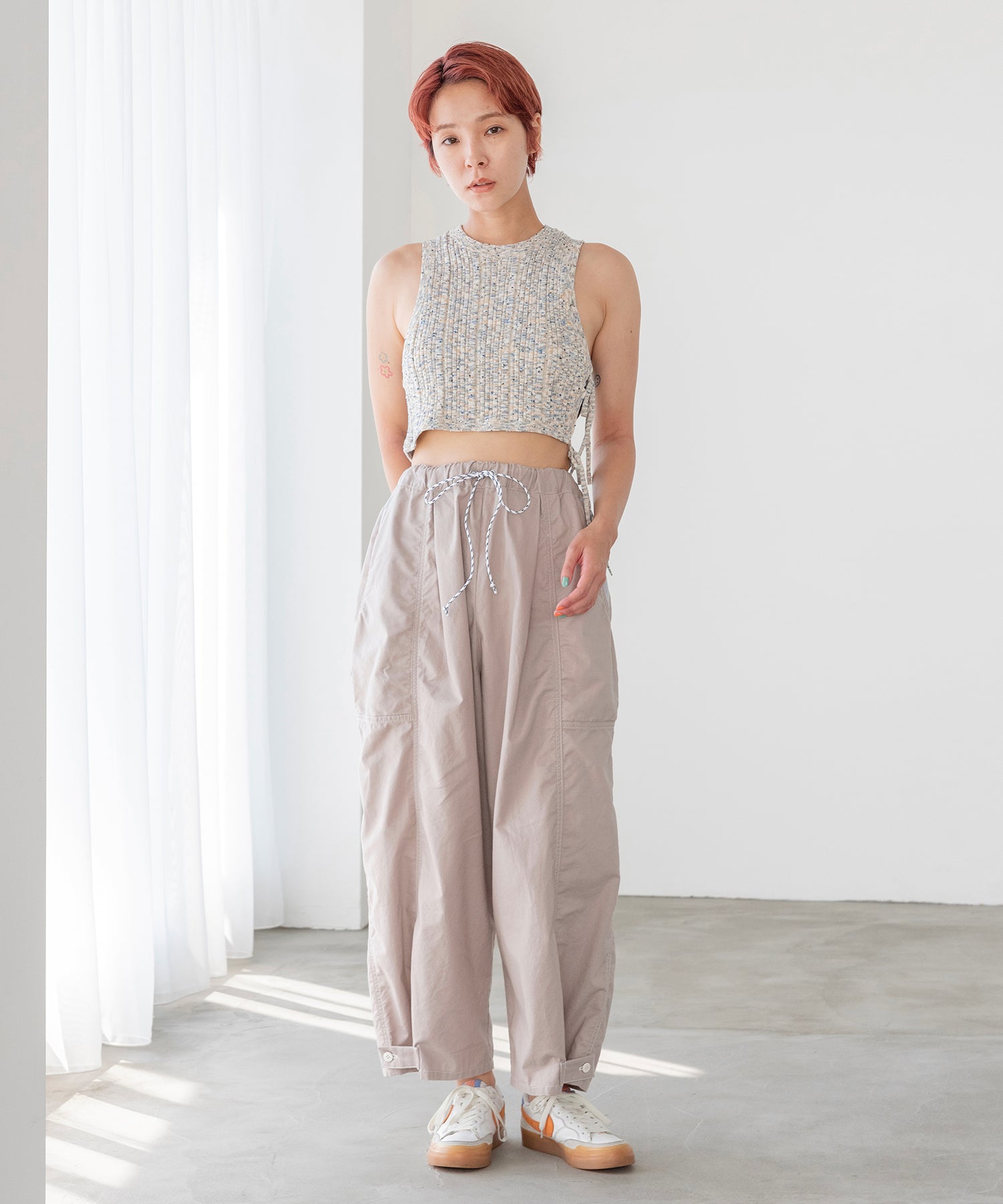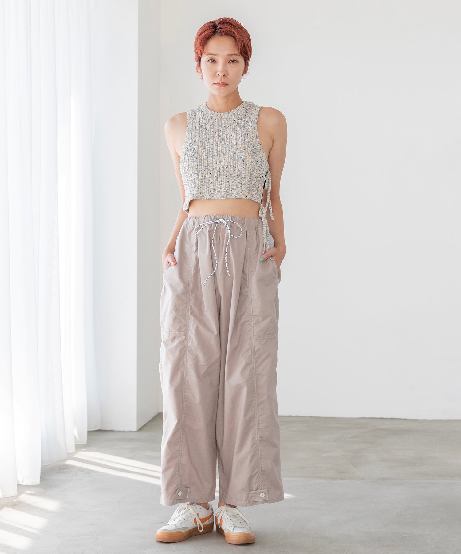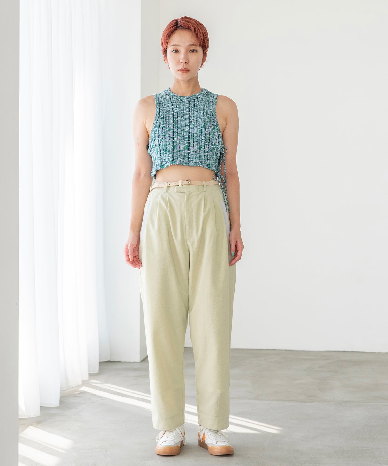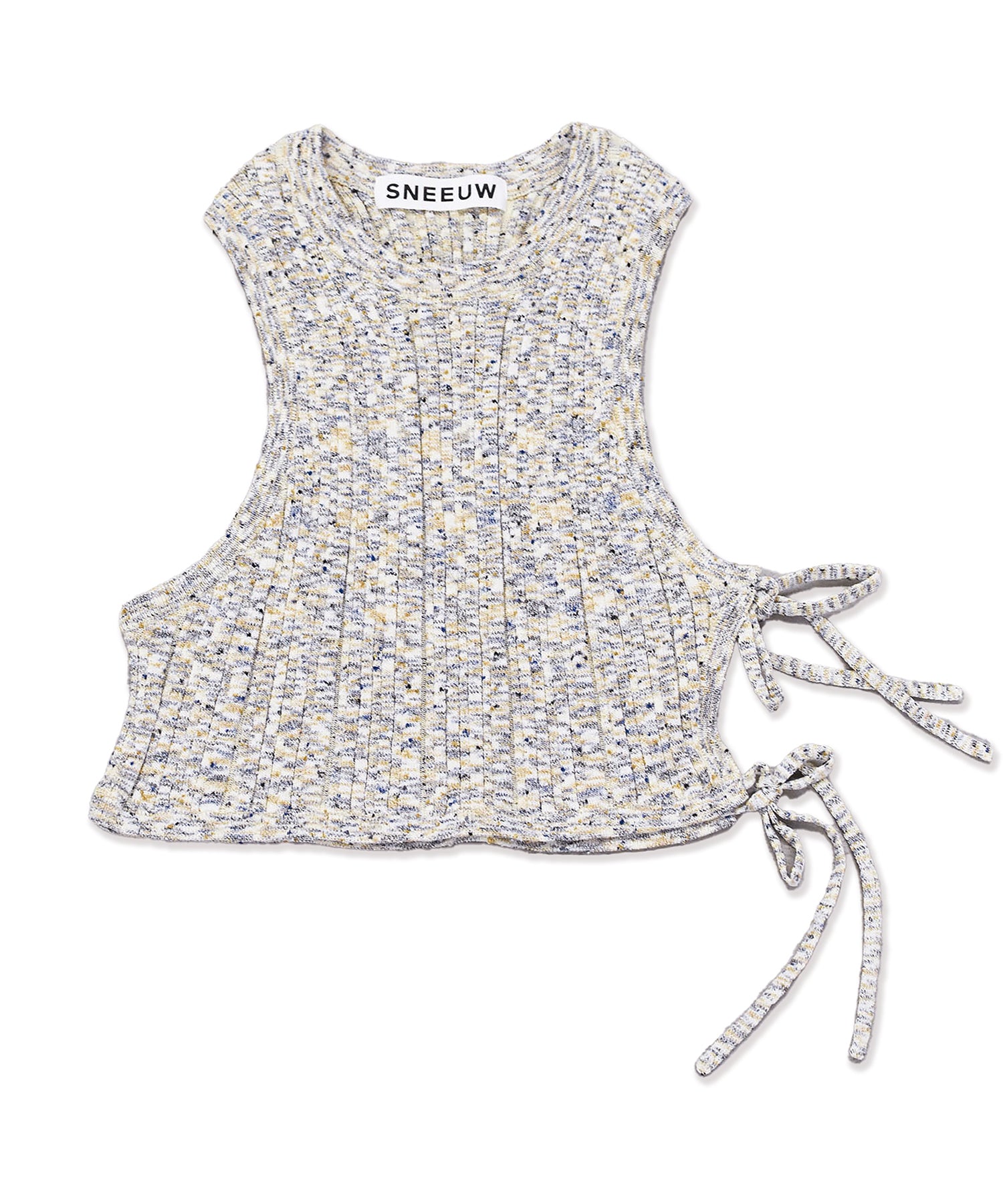 脇でこコードを結ぶ作りになっていて、カットソーやワンピースの上にレイヤードしたり、タンクトップ的にインナーとして着たりと、コーディネートのポイントにもベースにもなる一枚です。