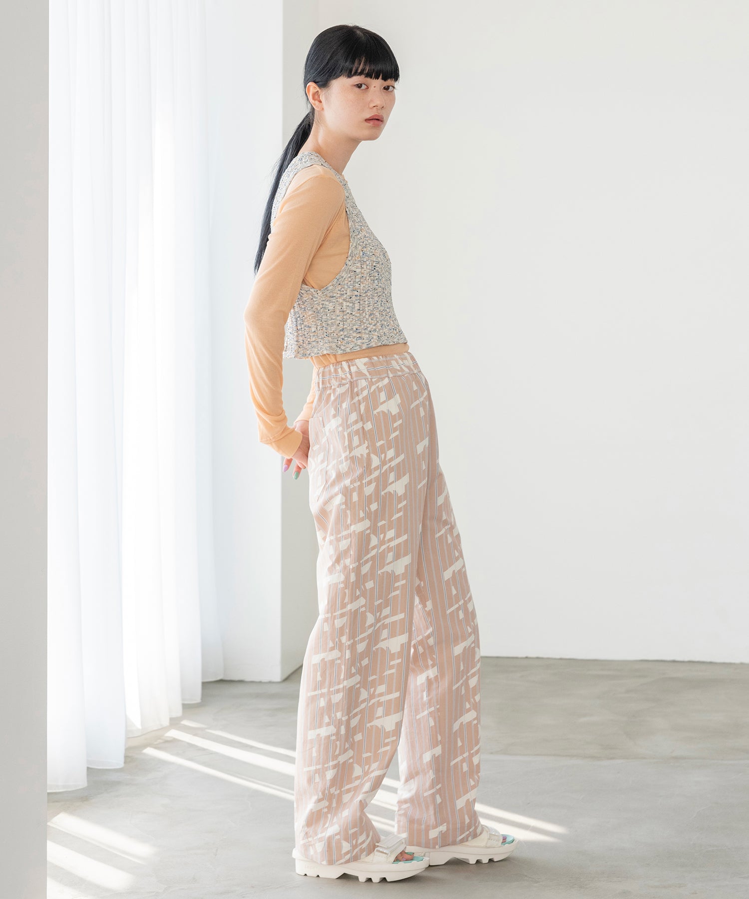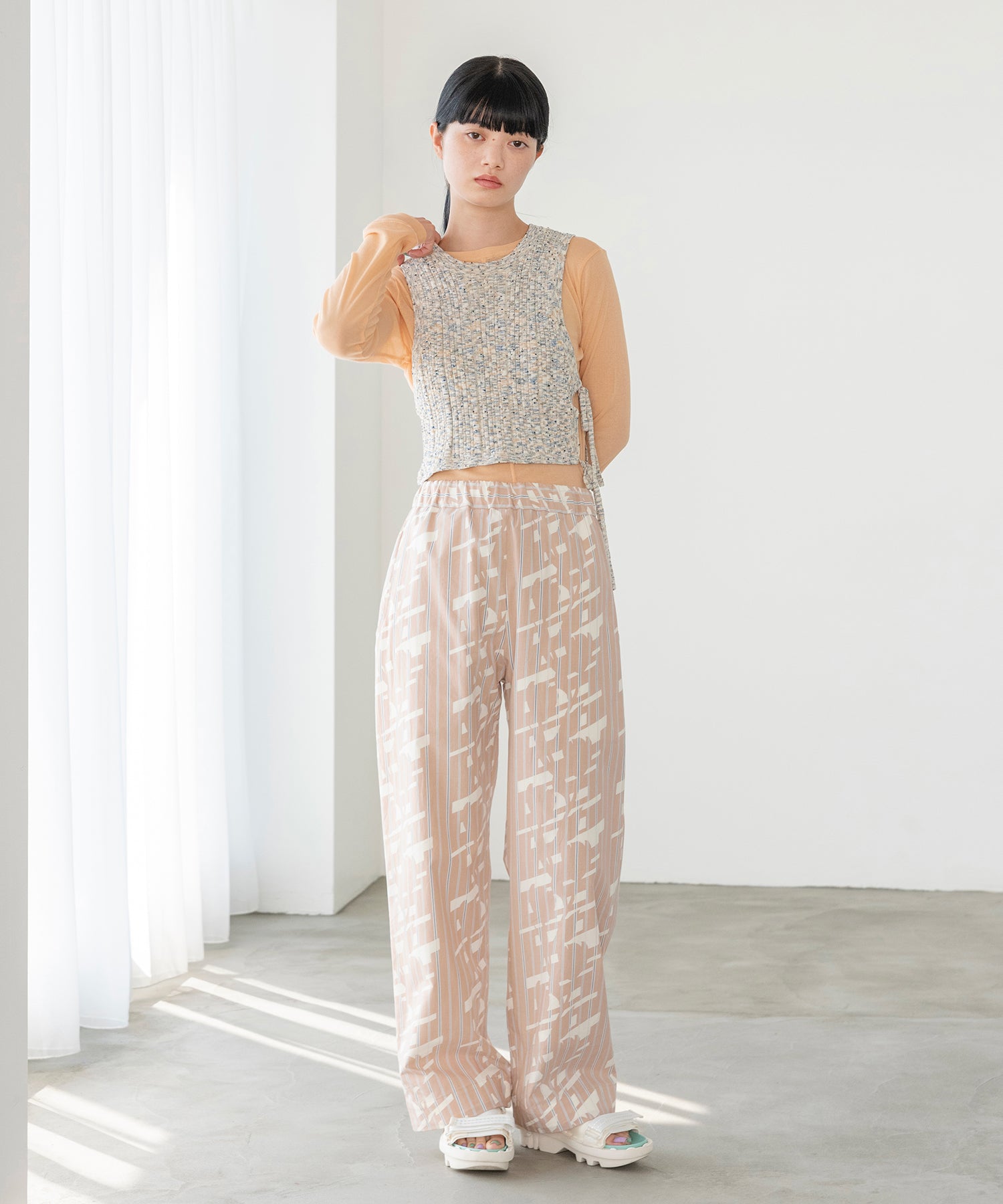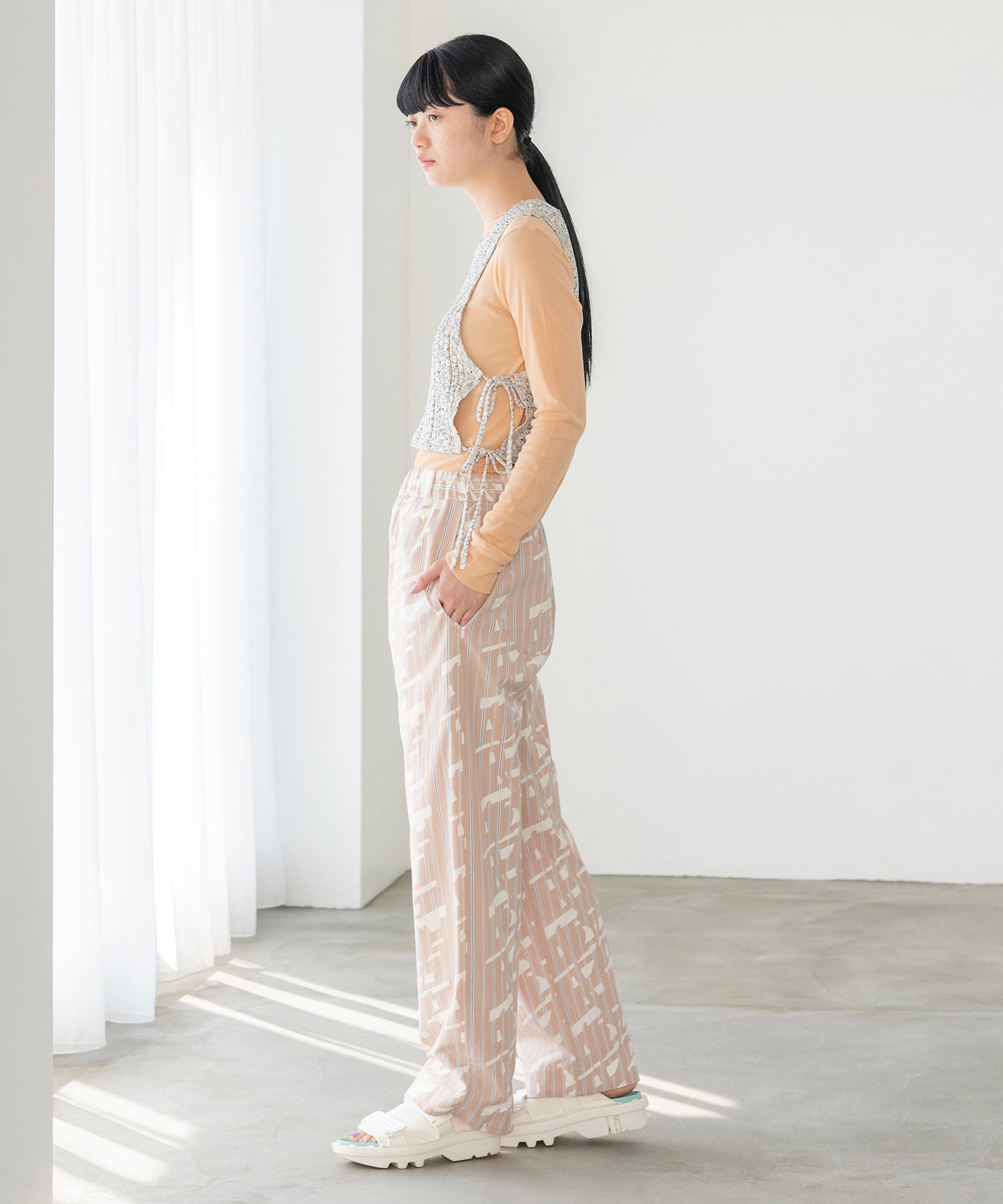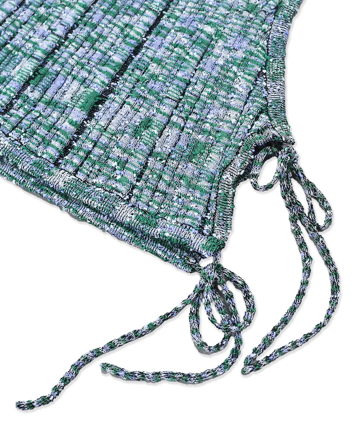 脇でこコードを結ぶ作りになっていて、カットソーやワンピースの上にレイヤードしたり、タンクトップ的にインナーとして着たりと、コーディネートのポイントにもベースにもなる一枚です。