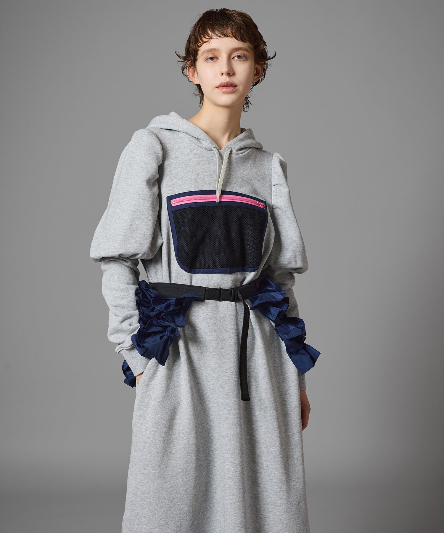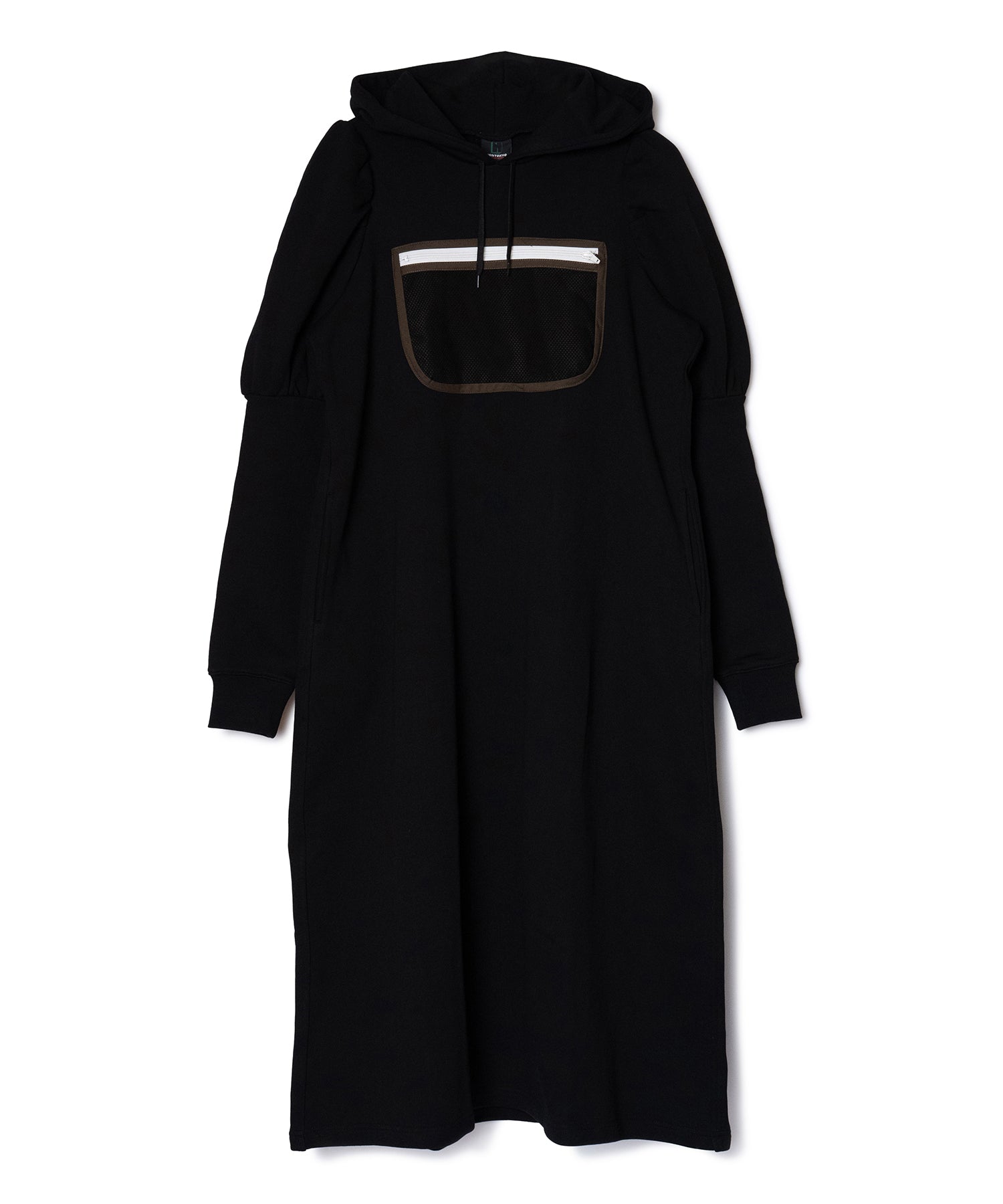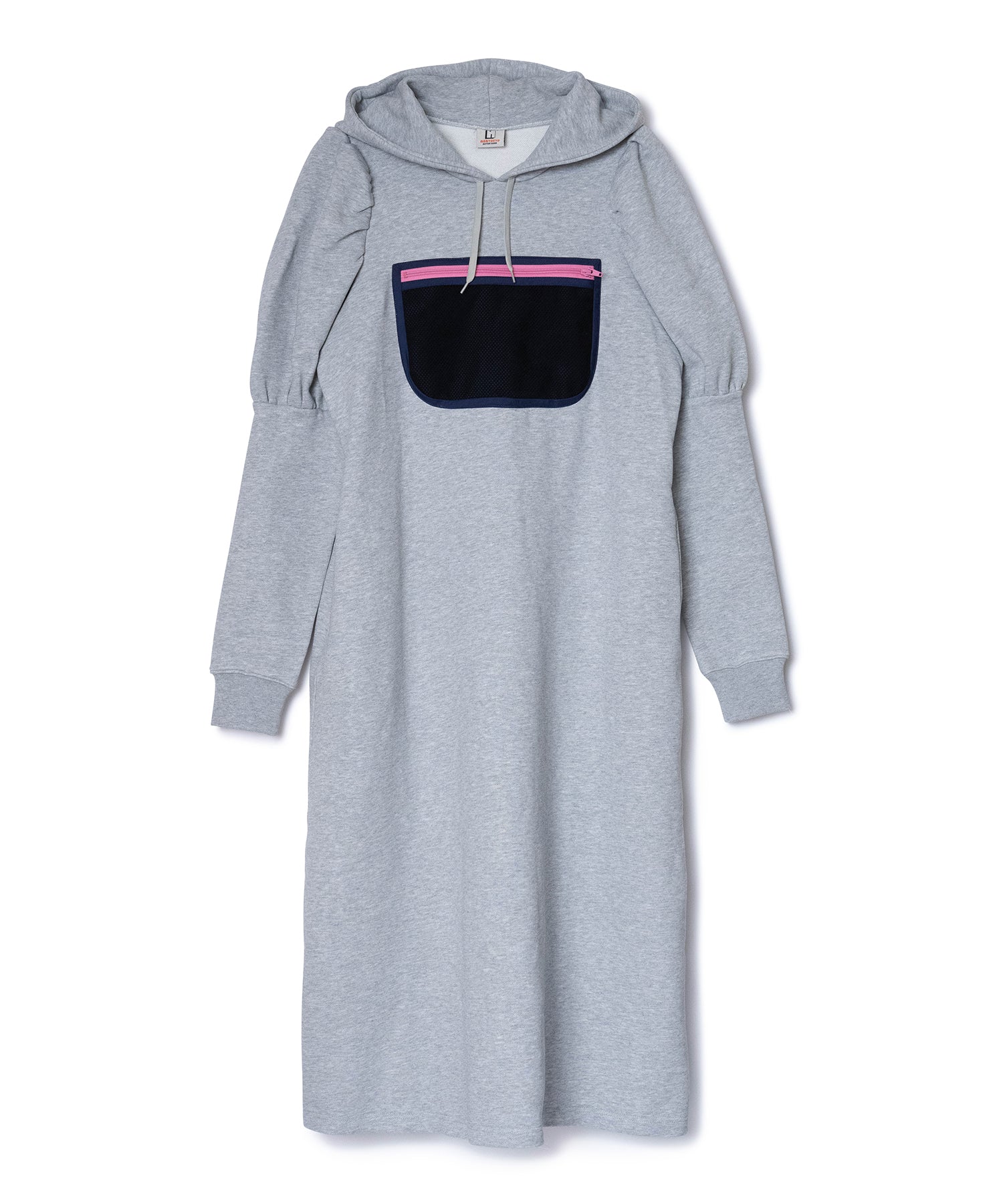 メッシュポケットが付いたプルオーバーパーカーワンピース。